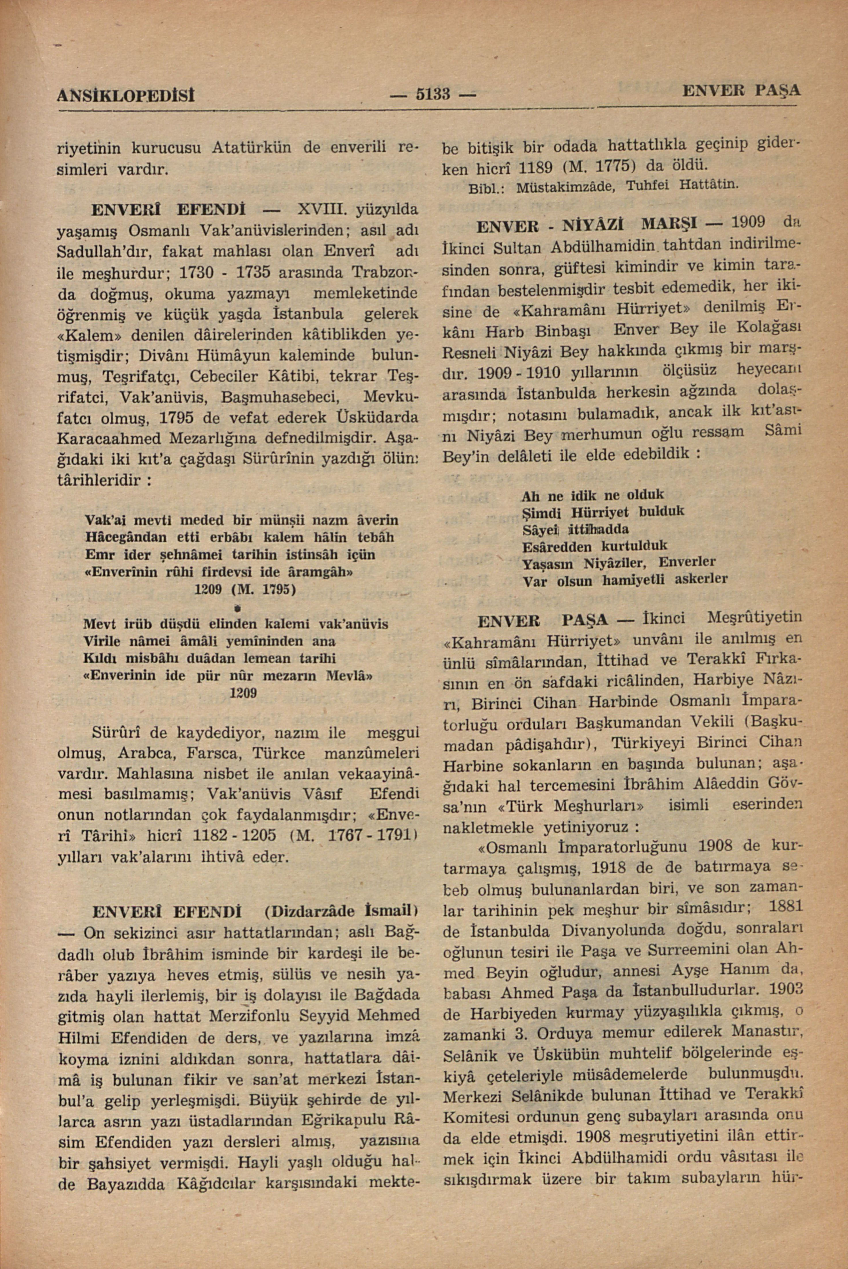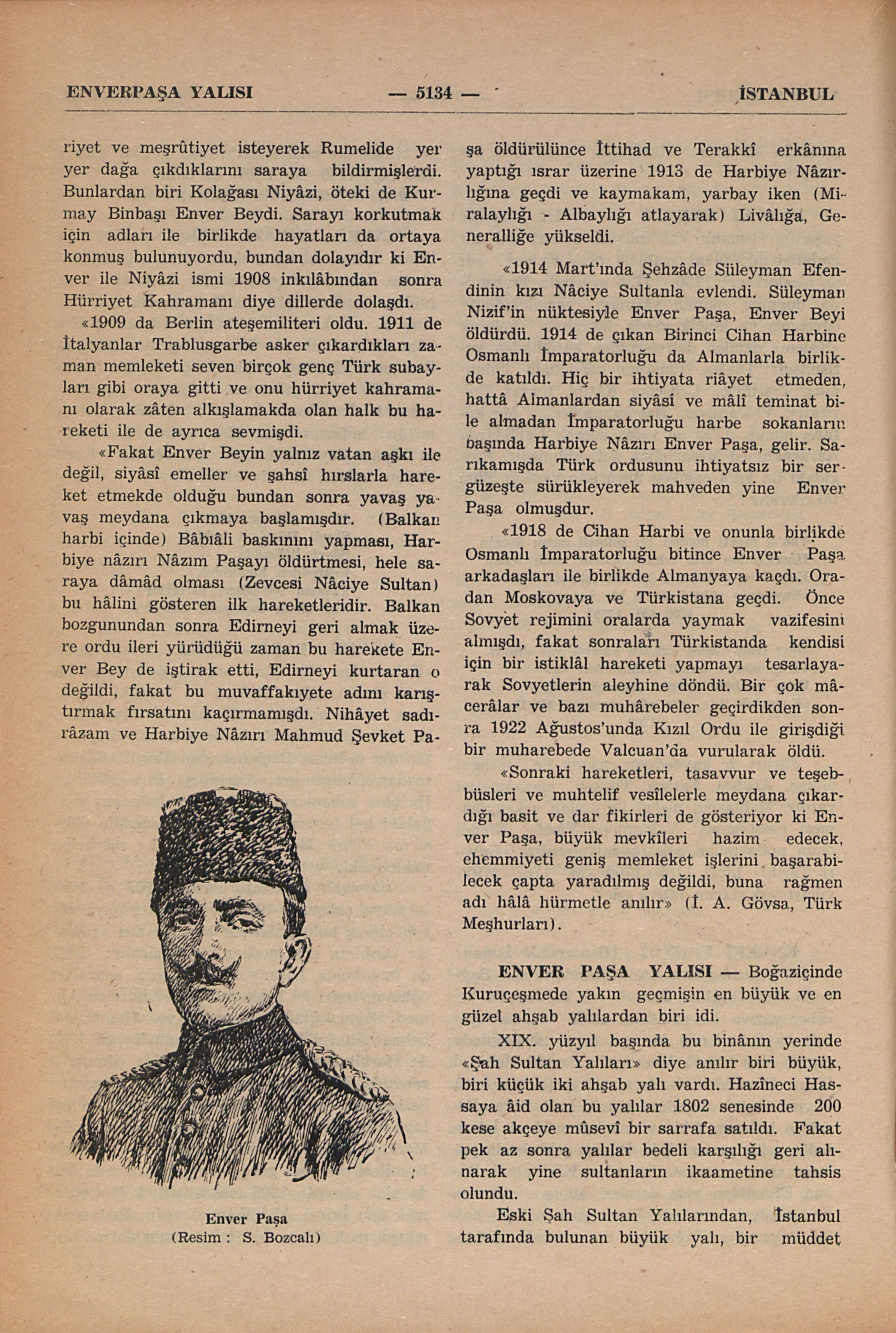 “Osmanlı İmparatorluğunu 1908 de kurtarmaya çalışmış, 1918 de de batırmaya sebeb olmuş bulunanlardan biri, ve son zamanlar tarihinin pek meşhur bir sîmâsıdır; 1881 de İstanbulda Divanyolunda doğdu, sonraları oğlunun tesiri ile Paşa ve Surreemini olan Ahmed Beyin oğludur, annesi Ayşe Hanım da, babası Ahmed Paşa da İstanbulludurlar. 1903 de Harbiyeden kurmay yüzyaşılıkla çıkmış, o zamanki 3. Orduya memur edilerek Manastır, Selânik ve Üskübün muhtelif bölgelerinde eşkiyâ çeteleriyle müsâdemelerde bulunmuşdu. Merkezi Selânikde bulunan İttihad ve Terakkî Komitesi ordunun genç subayları arasında onu da elde etmişdi. 1908 meşrutiyetini ilân ettirmek için İkinci Abdülhamidi ordu vâsıtası ile sıkışdırmak üzere bir takım subayların hürriyet ve meşrûtiyet isteyerek Rumelide yer yer dağa çıkdıklarını saraya bildirmişlerdi. Bunlardan biri Kolağası Niyâzi, öteki de Kurmay ...