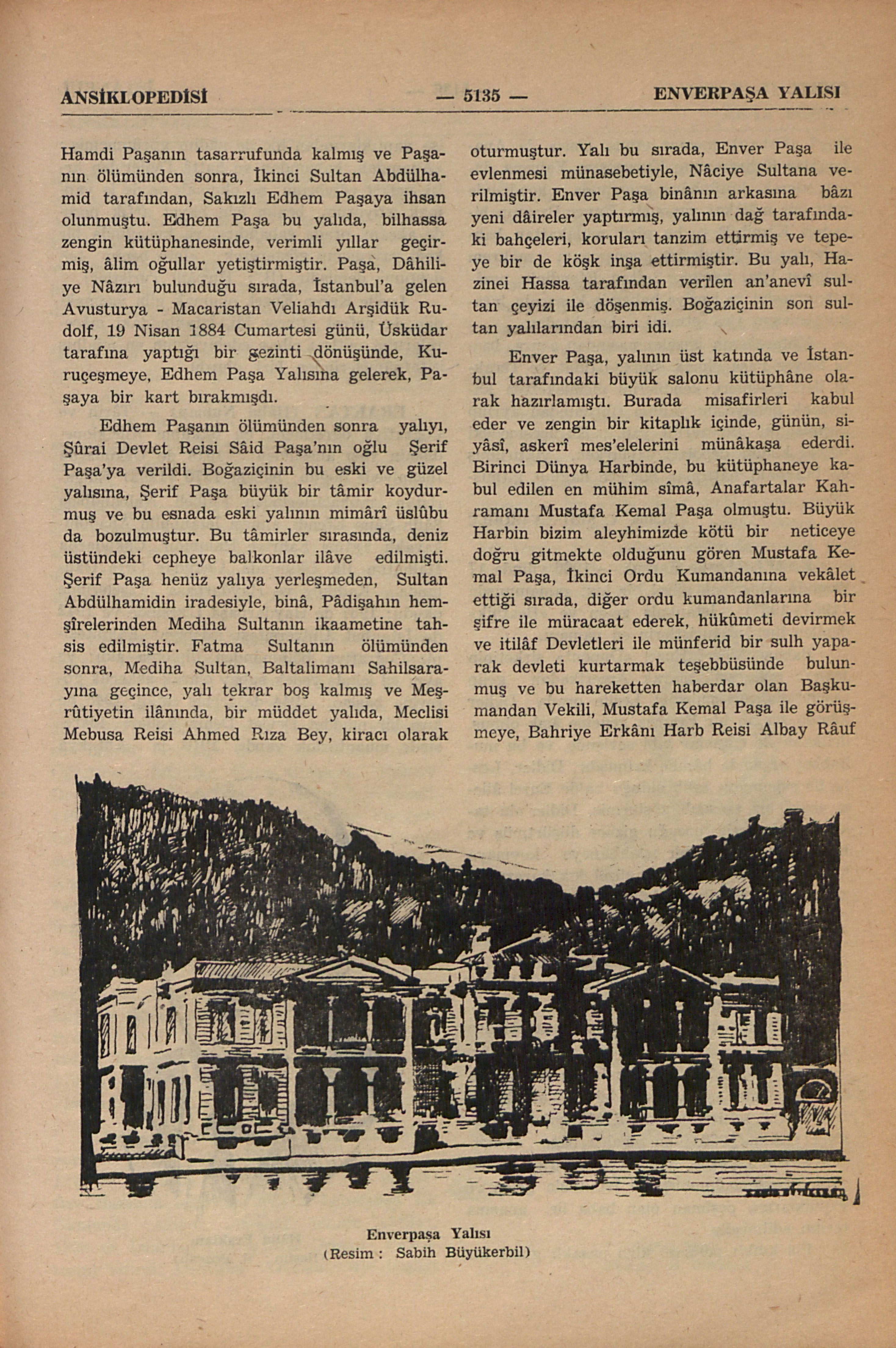 Edhem Paşanın ölümünden sonra yalıyı, Şûrai Devlet Reisi Sâid Paşa’nın oğlu Şerif Paşa’ya verildi. Boğaziçinin bu eski ve güzel yalısına, Şerif Paşa büyük bir tâmir koydurmuş ve bu esnada eski yalının mimârî üslûbu da bozulmuştur. Bu tâmirler sırasında, deniz üstündeki cepheye balkonlar ilâve edilmişti. Şerif Paşa henüz yalıya yerleşmeden, Sultan Abdülhamidin iradesiyle, binâ, Pâdişahın hemşîrelerinden Mediha Sultanın ikaametine tahsis edilmiştir. Fatma Sultanın ölümünden sonra, Mediha Sultan, Baltalimanı Sahilsarayına geçince, yalı tekrar boş kalmış ve Meşrûtiyetin ilânında, bir müddet yalıda, Meclisi Mebusa Reisi Ahmed Rıza Bey, kiracı olarak oturmuştur. Yalı bu sırada, Enver Paşa ile evlenmesi münasebetiyle, Nâciye Sultana verilmiştir. Enver Paşa binânın arkasına bâzı yeni dâireler yaptırmış, yalının dağ tarafındaki bahçeleri, koruları tanzim ettirmiş ve tepeye bir de köşk inşa ettirmiştir. Bu yalı, Hazinei Hassa tarafından verilen an’anevî sultan çeyizi ile döşenmiş. Boğaziçinin son sultan yalılarından biri idi.