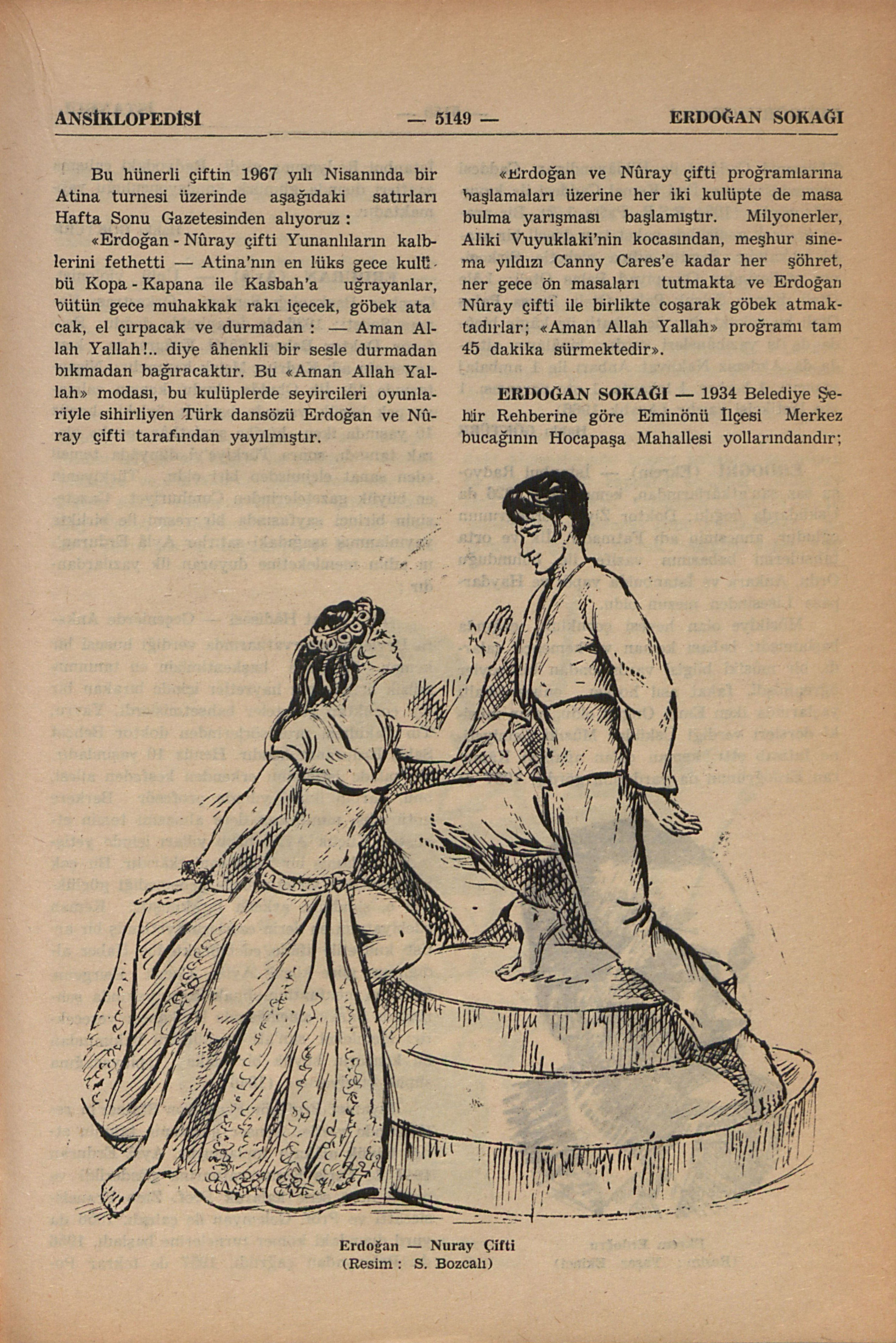 “Erdoğan - Nûray çifti Yunanlıların kalbleri fethetti — Atina’nın en lüks gece kulübü Kopa - Kapana ile Kasbah’a uğrayanlar, bütün gece muhakkak rakı içecek, göbek atacak, el çırpacak ve durmadan : — Aman Allah Yallah!.. diye âhenkli bir sesle durmadan bıkmadan bağıracaktır. Bu “Aman Allah Yallah” modası, bu kulüplerde seyircileri oyunlariyle sihirliyen Türk dansözü Erdoğan ve Nûray çifti tarafından yayılmıştır.