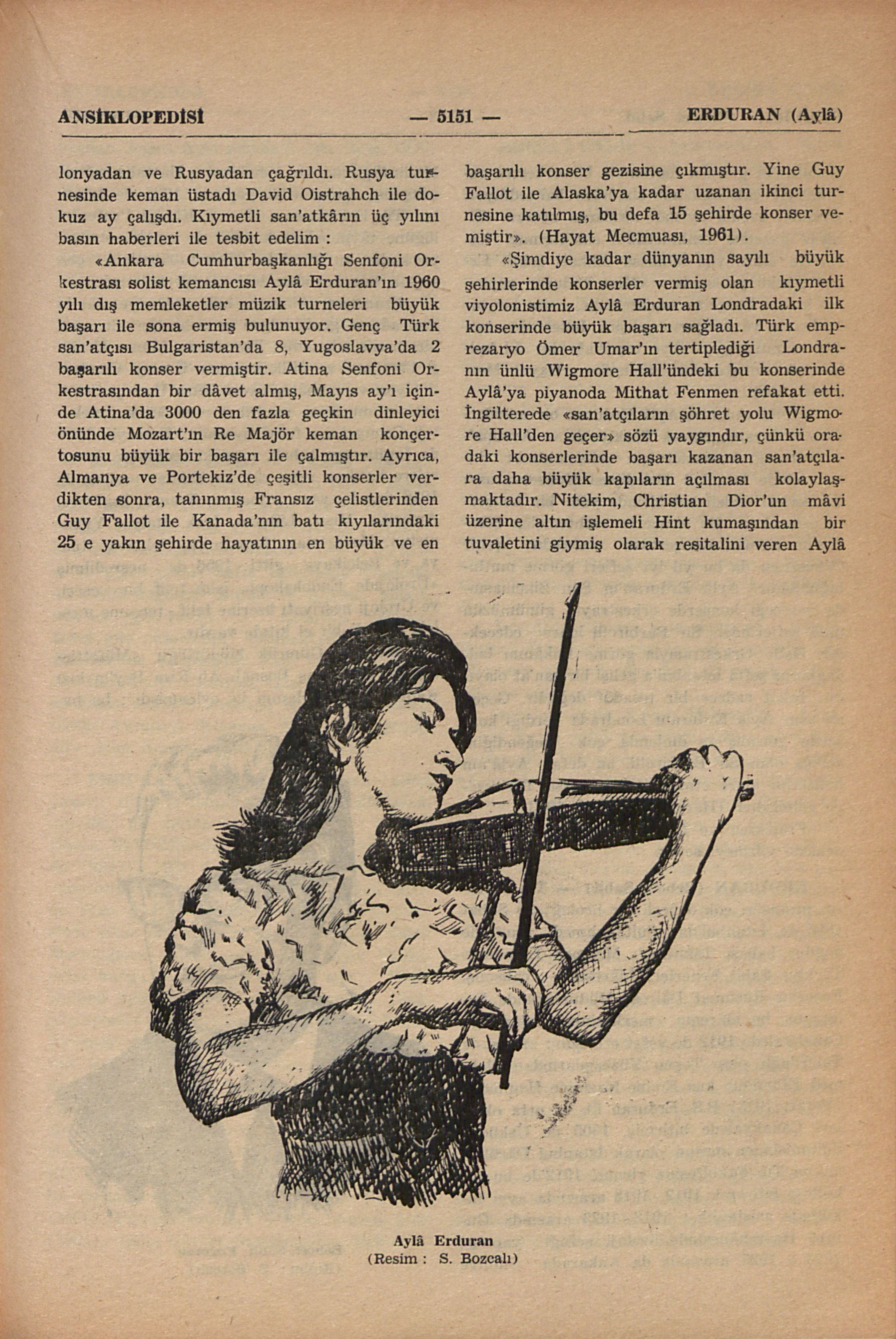 “Bir San’at Hâdisesi — Geçenlerde Ankara Devlet Konservatuarında verdiği hususî bir keman konserile başkentimizin en tanınmış müzik üstadlarını hayretler içinde bırakan bir kız çocuktan gazeteler bahsetmişlerdi. Yavru, Tıb Fakültesi profesörlerinden doktor Behçet Sabit Erduranın kızıdır. Henüz 10 yaşındadır. Fevkalâde istidadını erkenden keşfeden ailesi, onu, harbin ikinci yılında profesör Berkere götürmüş, muntazam ders almasını temin etmiştir. Küçük Aylâ, harb yılları içinde yetişmeğe başlamış bir Türk san’atkârıdır. Bir çok kemancıların yirmi senede yenemediği güçlükleri o, şimdiden arkada bırakmıştır. Keman edebiyatının en derin eserlerini yetişmiş bir artist kudretile ifâde edebilmektedir. Haber aldığımı...