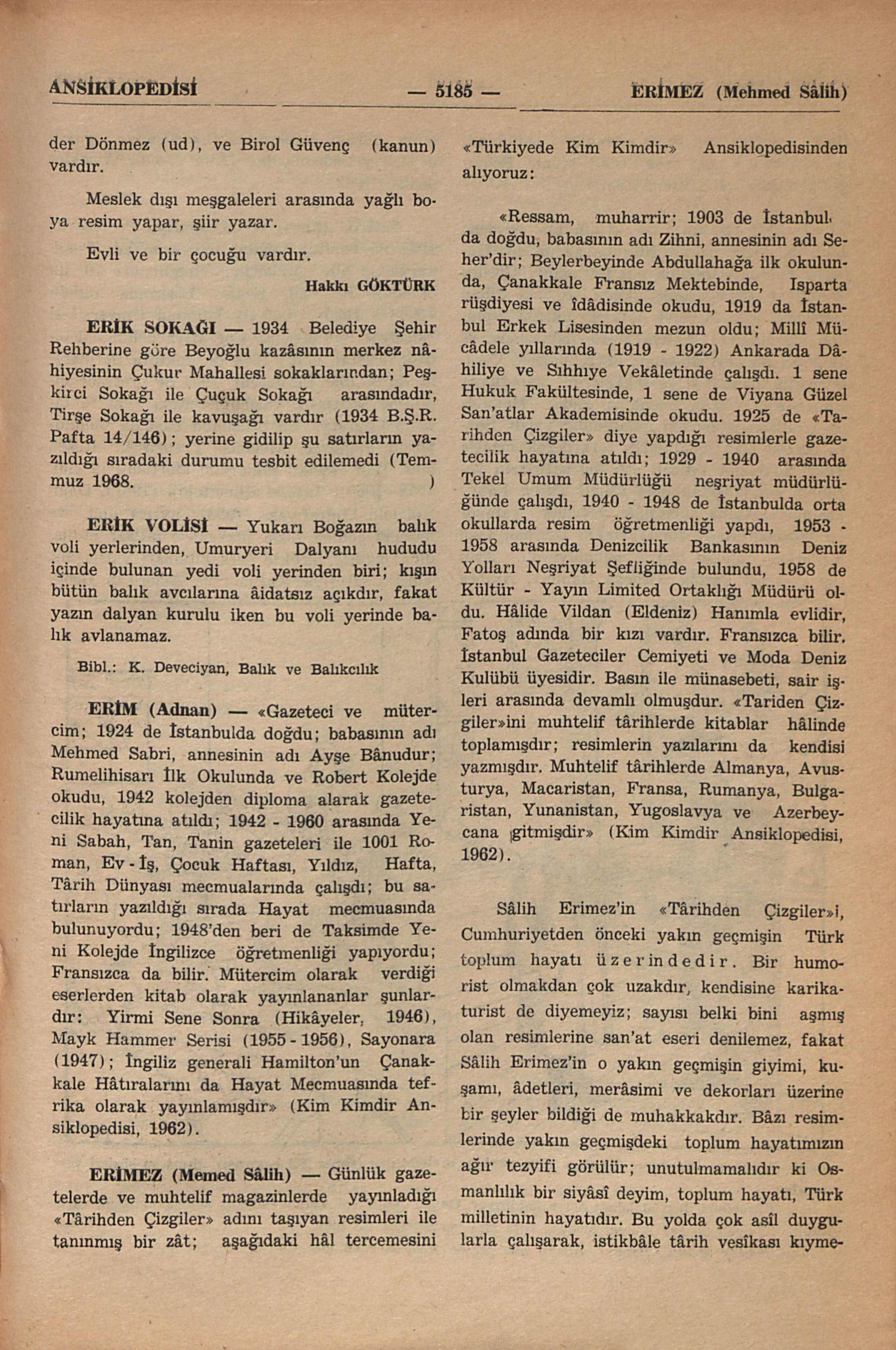 “Ressam, muharrir; 1903 de İstanbulda doğdu, babasının adı Zihni, annesinin adı Seher’dir; Beylerbeyinde Abdullahağa ilk okulunda, Çanakkale Fransız Mektebinde, Isparta rüşdiyesi ve îdâdisinde okudu, 1919 da İstanbul Erkek Lisesinden mezun oldu; Millî Mücâdele yıllarında (1919 - 1922) Ankarada Dâhiliye ve Sıhhıye Vekâletinde çalışdı. 1 sene Hukuk Fakültesinde, 1 sene de Viyana Güzel San’atlar Akademisinde okudu. 1925 de “Tarihden Çizgiler “ diye yapdığı resimlerle gazetecilik hayatına atıldı; 1929 - 1940 arasında Tekel Umum Müdürlüğü neşriyat müdürlüğünde çalışdı, 1940 - 1948 de İstanbulda orta okullarda resim öğretmenliği yapdı, 1953 - 1958 arasında Denizcilik Bankasının Deniz Yolları Neşriyat Şefliğinde bulundu, 1958 de Kültür - Yayın Limited Ortaklığı Müdürü oldu. Hâlide Vildan (Eldeniz) Hanımla evlidir, Fatoş adında bir kızı vardır. Fransızca bilir. İstanbul Gazeteciler Cemiyeti ve Moda Deniz Kulübü üyesidir. Basın ile münasebeti, sair işleri arasında devamlı olmuşdur. “Tariden Çizgiler”ini muhtelif târihlerde kitablar hâlinde toplamışdır; resimlerin yazılarını da kendisi yazmışdı...