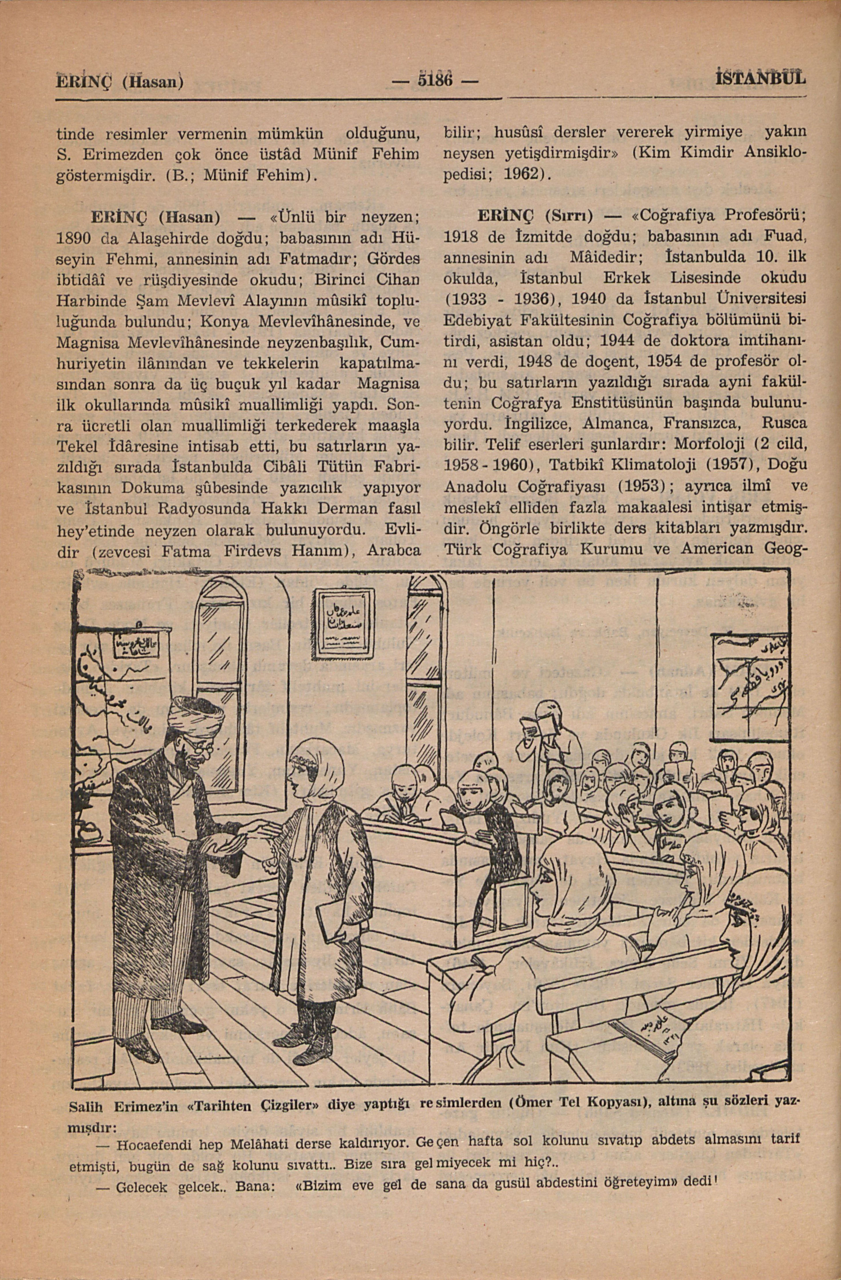 Sâlih Erimez’in “Târihden Çizgiler”i, Cumhuriyetden önceki yakın geçmişin Türk toplum hayatı üzerindedir. Bir humorist olmakdan çok uzakdır, kendisine karikaturist de diyemeyiz; sayısı belki bini aşmış olan resimlerine san’at eseri denilemez, fakat Sâlih Erimez’in o yakın geçmişin giyimi, kuşamı, âdetleri, merâsimi ve dekorları üzerine bir şeyler bildiği de muhakkakdır. Bâzı resimlerinde yakın geçmişdeki toplum hayatımızın ağır tezyifi görülür; unutulmamalıdır ki Osmanlılık bir siyâsî deyim, toplum hayatı, Türk milletinin hayatıdır. Bu yolda çok asîl duygularla çalışarak, istikbâle târih vesîkası kıymetinde resimler vermenin mümkün olduğunu, S. Erimezden çok önce üstâd Münif Fehim göstermişdir. (B.; Münif Fehim).