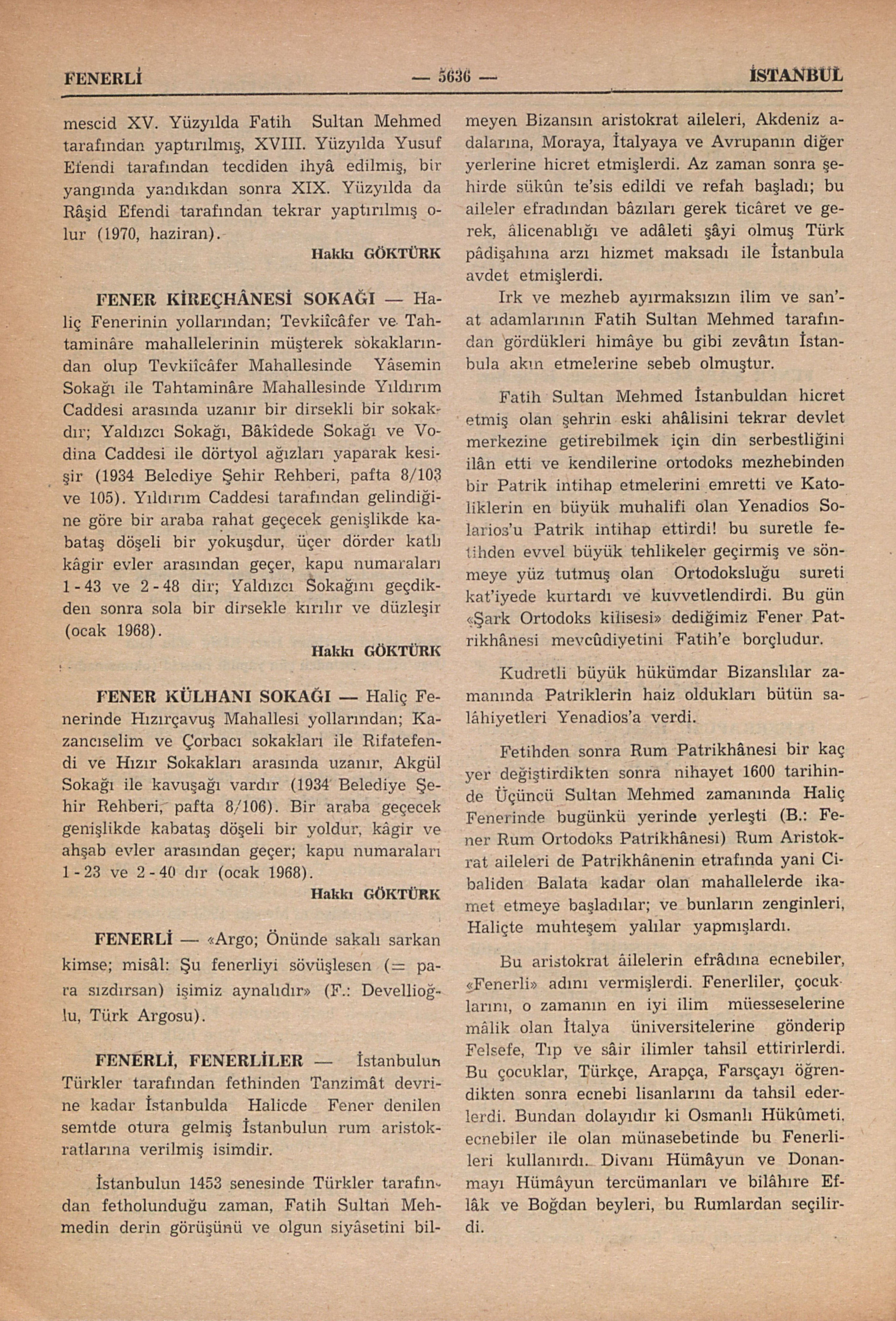İstanbulun Türkler tarafından fethinden Tanzimât devrine kadar İstanbulda Halicde Fener denilen semtde otura gelmiş İstanbulun rum aristokratlarına verilmiş isimdir. İstanbulun 1453 senesinde Türkler tarafından fetholunduğu zaman, Fatih Sultan Mehmedin derin görüşünü ve olgun siyâsetini bilmeyen Bizansın aristokrat aileleri, Akdeniz adalarına, Moraya, İtalyaya ve Avrupanın diğer yerlerini hicret etmişlerdi. Az zaman sonra şehirde sükûn te’sis edildi ve refah başladı; bu aileler efradından bâzıları gerek ticâret ve gerek, âlicenablığı ve adâleti şâyi olmuş Türk pâdişahına arzı hizmet maksadı ile İstanbula avdet etmişlerdi. Irk ve mezheb ayırmaksızın ilim ve san’at adamlarının Fatih Sultan Mehmed tarafından gördükleri himâye bu gibi zevâtın İstanbula akın etmelerine sebeb olmuşdur. Fatih Sultan Mehmed İstanbuldan hicret etmiş olan şehrin eski ahâlisini tekrar devlet merkezine getirebilmek içindin serbestliğini ilân etti ve kendilerine ortodoks mezhebinden bir Patrik intihap etmelerini emretti ve Katoliklerin en büyük muhalifi olan Yenadios Solarios’u Patrik intihap ettirdi! Bu suretle fetihten evvel büyük tehlikeler geçirmiş ve sönmeye yüz tutmuş olan Ortodoksluğu sureti kat’iyede kurtardı ve kuvvetlendirdi. Bu gün “Şark Ortodoks kilisesi” dediğimiz Fener Patrikhânesi mevcûdiyetini...
