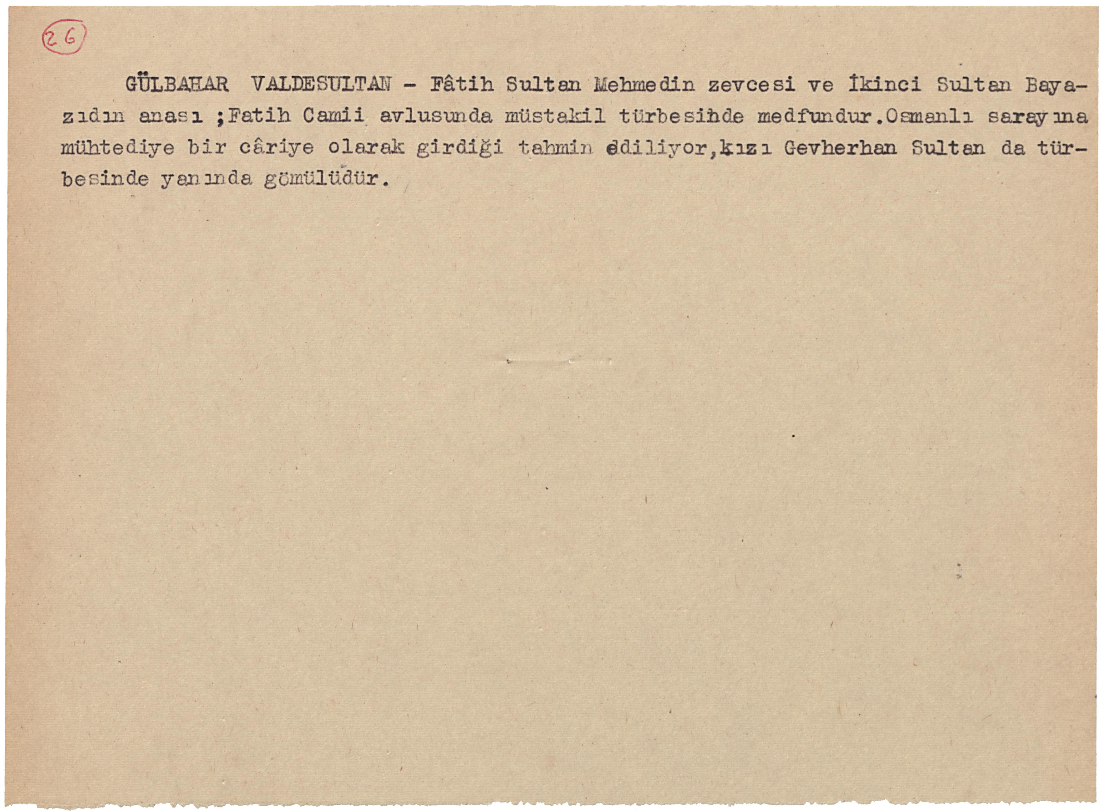 GÜLBAHAR VALDESULTAN – Fâtih Sultan Mehmedin zevcesi ve İkinci Sultan Bayazıdın anası ;Fatih Camii avlusunda müstakil türbesinde medfundur.Osmanlı sarayına mühtediye bir câriye olarak girdiği tahmin ediliyor,kızı Gevherhan Sultan da türbesinde yanında gömülüdür.