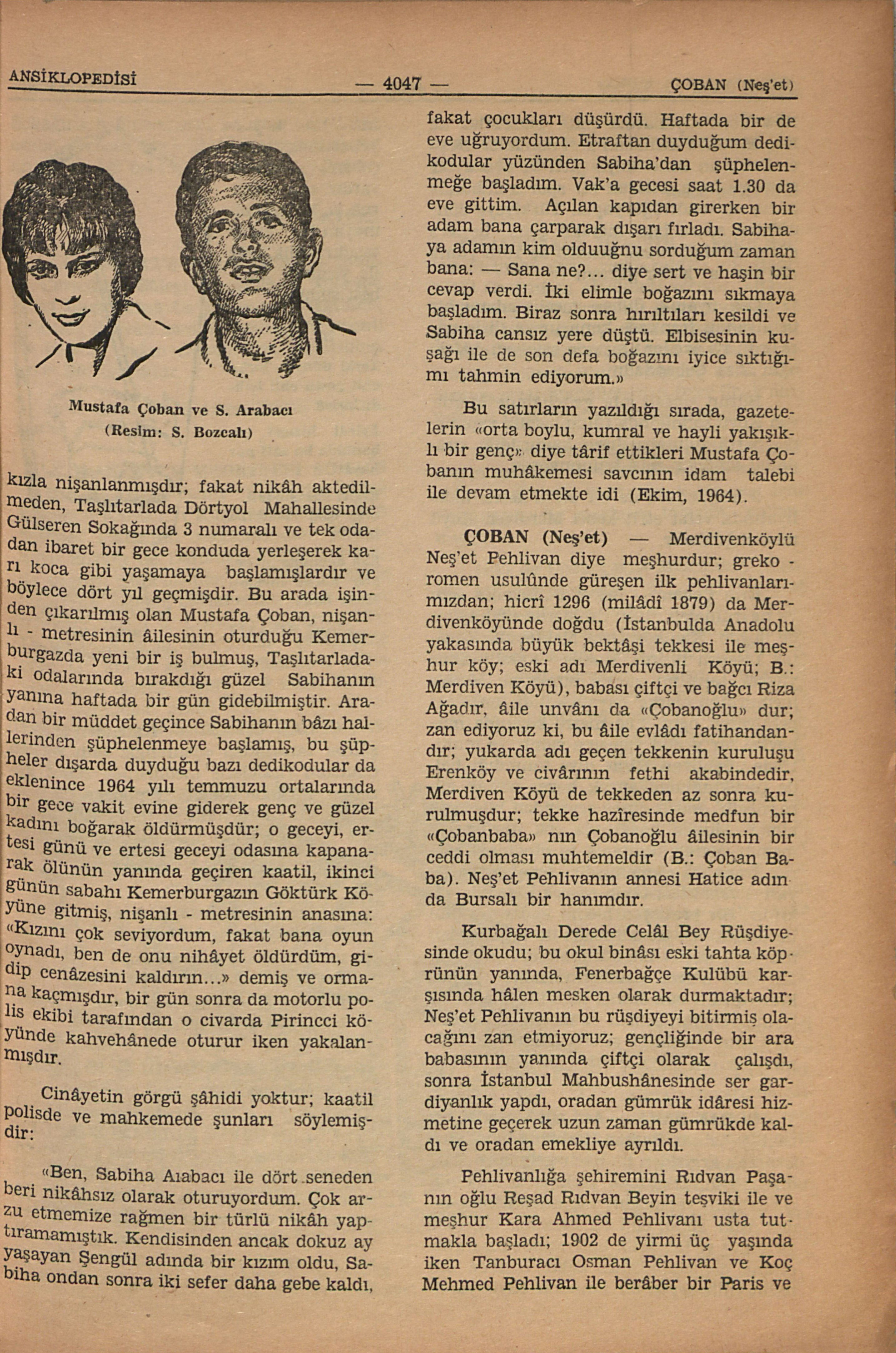 1960 yılında çalışdığı fabrikada 17 yaşında Saliha Arabacı adında çok güzel bir işçi kız görerek sevmiş ve ailesi Kemerburgaz’ın Göktürk köyünde oturan bu güzel kızla nişanlanmışdır; fakat nikâh aktedilmeden, Taşlıtarlada Dörtyol Mahallesinde Gülseren Sokağında 3 numaralı ve tek odadan ibaret bir gece konduda yerleşerek karı koca gibi yaşamaya başlamışlardır ve böylece dört yıl geçmişdir. Bu arada işinden çıkarılmış olan Mustafa Çoban, nişanlı - metresinin âilesinin oturduğu Kemerburgazda yeni bir iş bulmuş, Taşlıtarladaki odalarında bırakdığı güzel Sabihanın yanına haftada bir gün gidebilmiştir. Aradan bir müddet geçince Sabihanın bâzı hallerinden şüphelenmeye başlamış, bu şüpheler dışarda duyduğu bazı dedikodular da eklenince 1964 yılı temmuzu ortalarında bir gece vakit evine giderek genç ve güzel kadını boğarak öldürmüşdür; o geceyi, ertesi günü ve ertesi geceyi odasına kapanarak ölünün yanında geçiren kaatil, ikinci günün sabahı Kemerburgazın Göktürk Köyüne gi...