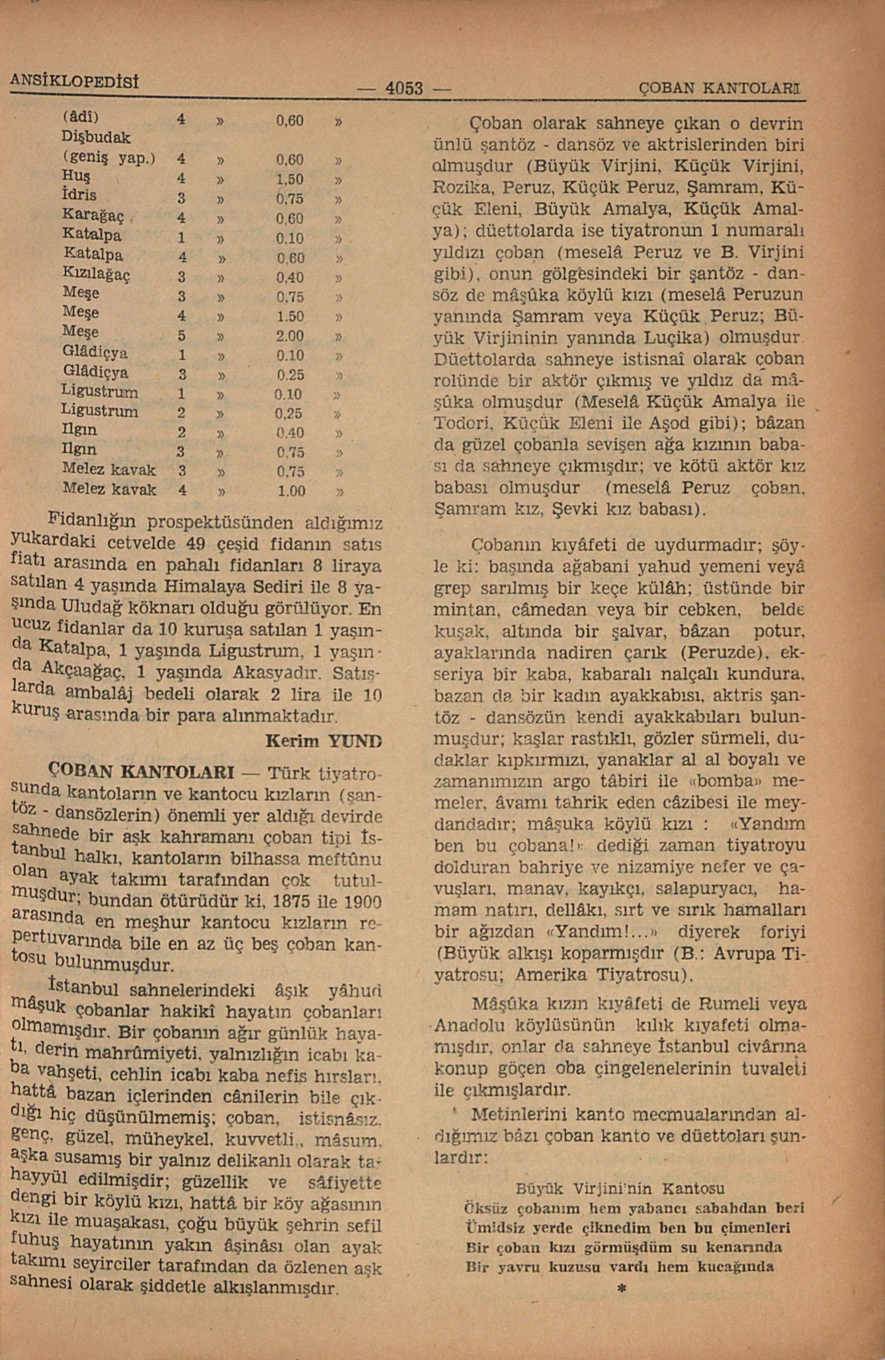 Türk tiyatrosunda kantoların ve kantocu kuzların (şantöz - dansözlerin) önemli yer aldığı devirde sahnede bir aşk kahramanı çoban tipi İstanbul halkı, kantoların bilhassa meftûnu olan ayak takımı tarafından çok tutulmuşdur; bundan ötürüdür ki, 1875 ile 1900 arasında en meşhur kantocu kızların repertuvarında bile en az üç beş çoban kantosu bulunmuşdur.