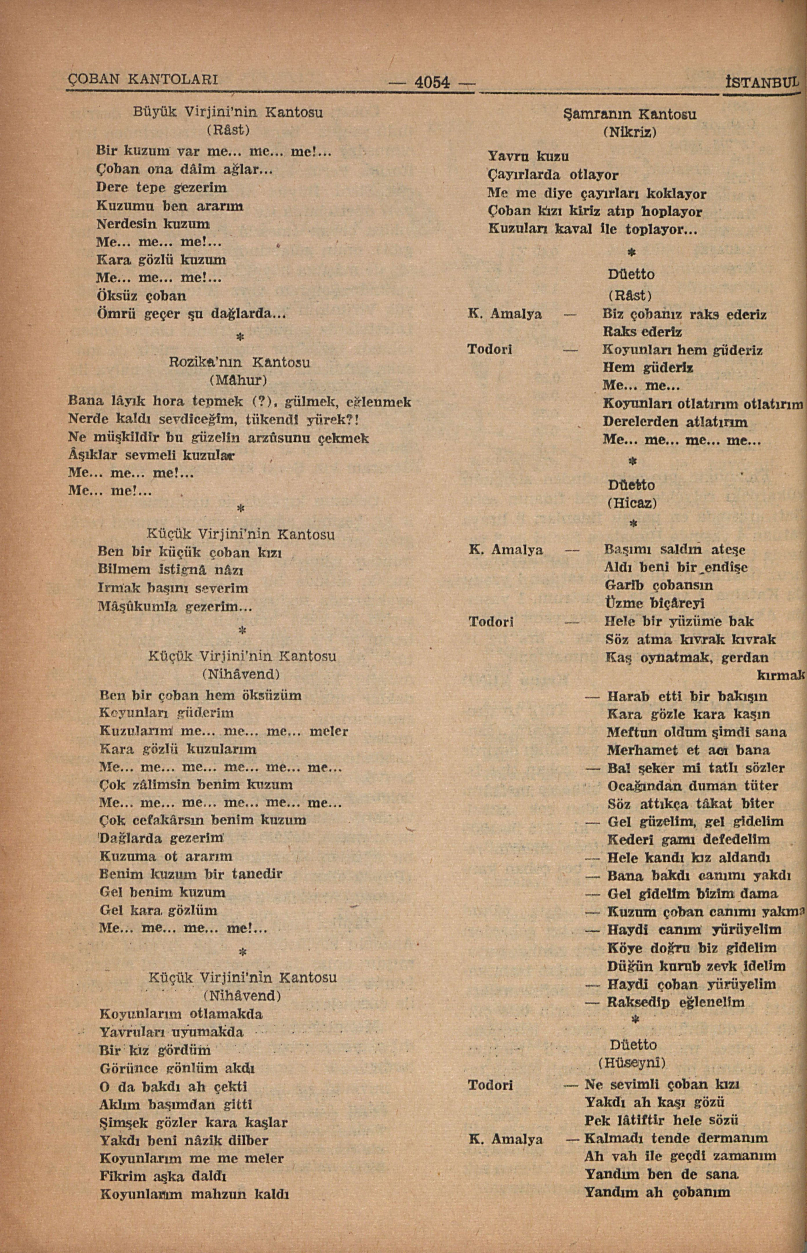 Metinlerini kanto mecmualarından aldığımız bâzı çoban kanto ve düettoları şunlardır:
