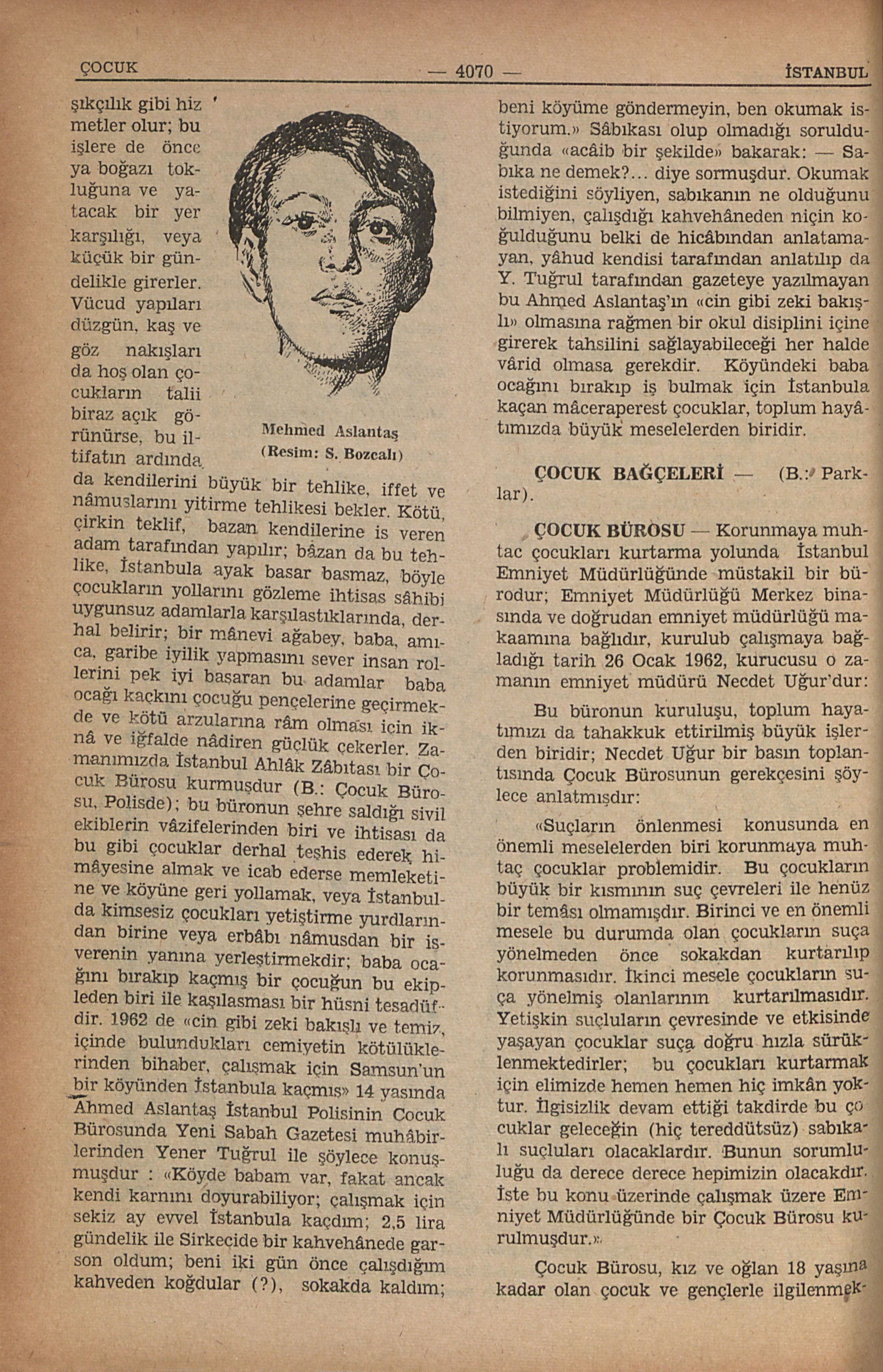 Türkiyenin hemen her tarafından baba ocağını bırakıb İstanbula kaçan çocuklar pek çokdur. Mâceraperest, dolayısı ile zeki çocuklardı; çoğunlukla köylü olub zekâları köy hayatı mahrumiyetlerini kuvvetle duymalarına yol açmış, bir nefis güveni ile de baba ocağını terk ederek türlü vâsıtalarla İstanbula gelmişlerdir. İçlerinde küçük yaşda yetim ve öksüz kalmış, bahtını, geçimini İstanbulda aramak istemiş olanlar da vardır. Bu çocuklar İstanbula ayak basar basmaz hemen hepsi önce büyük bir hayal kırıklığına uğrarlar. Bir iş kapusu buluncaya kadar ceblerinde kendilerini geçindirecek paraları çok azdır; yatakları, yorganları yokdur, hattâ çocuğun koltuğunda bir çamaşır boğçası dahi yokdur. Kendilerini ilk şaşırtan mesele çok ucuz bir yatacak yer temini olur; yolda esvapları günlerce sırtlarından çıkmamıştır; İstanbulda da ilk geceler, belki, esvapları ile bir köşede büzülüp uyumakla geçirmişdir; dış görünüşleri perişanlaşır, çamaşırları da kirlenmişdir; perişanlık ve kirlilik dürüst ve âlicenab hâmileri bulacak muhitlere, müesseselere girmelerine engel olur; kendilerine açılabilecek iş kapuları, müşterileri ayak takımı, hattâ ayak takımının uygunsuz güruhu olan otellerde, kahvehânelerde, aşçı dükkânlarında uşaklık, çıraklık, bulaşıkçılık gibi hizmetler olur; bu işlere de önce ya boğazı tokluğuna ve yatacak bir yer karşılığı veya küçük bir gündelikle girerler. Vücud yapıları düzgün, kaş ve göz nakışları da hoş olan çocukların talii biraz açık görünürse, bu iltifatın ardında da kendilerini büyük bir tehlike, iffet ve nâmuslarını yitirme tehlikesi bekler. Kötü, çirkin teklif, bazan kendilerine is veren adam tarafından yapılır; bâzan da bu tehlike, İstanbula ayak basar basmaz, böyle çocukların yollarını gözleme ihtisas sâhibi uygunsuz adamlarla karşılaştıklarında, derhal belirir; bir mânevi ağabey, baba, amıca, garibe iyilik yapmasını sever insan rollerini pek iyi başaran bu adamlar baba ocağı kaçkını çocuğu pençelerine geçirmekde ve kötü arzularına râm olması için iknâ ve iğfalde nâdiren güçlük çekerler. Zamanımızda İstanbul Ahlâk Zâbıtası bir Çocuk Bürosu kurmuşdur (B.: Çocuk Bürosu, Polisde); bu büronun şehre saldığı sivil ekiblerin vâzifelerinden biri ve ihtisası da bu gibi çocuklar derhal teşhis ederek himâyesine almak ve icab ederse memleketine ve köyüne geri yollamak, veya İstanbulda kimsesiz çocukları yetiştirme yurdlarından birine veya erbâbı nâmusdan bir işverenin yanına yerleştirmekdir; baba ocağını bırakıp kaçmış bir çocuğun bu ekipleden biri ile kaşılaşması bir hüsni tesadüfdir. 1962 de “cin gibi zeki bakışlı ve temiz, içinde bulundukları cemiyetin kötülüklerinden bihaber, çalışmak için Samsun’un bir köyünden İstanbula kaçmış” 14 yaşında Ahmed Aslantaş İstanbul Polisinin Çocuk Bürosunda Yeni Sabah Gazetesi muhâbirlerinden Yener Tuğrul ile şöyle konuşmuşdur: “Köyde babam var, fakat ancak kendi karnını doyurabiliyor; çalışmak için sekiz ay evvel İstanbula kaçdım; 2,5 lira gündelik ile Sirkecide bir kahvehânede garson oldum; beni iki gün önce çalışdığım kahveden koğdular (?), sokakda kaldım; beni köyüme göndermeyin, ben okumak istiyorum.” Sâbıkası olup olmadığı sorulduğunda “acâib bir şekilde” bakarak: — Sabıka ne demek?... diye sormuşdur. Okumak istediğini söyliyen, sabıkanın ne olduğunu bilmiyen, çalışdığı kahvehâneden niçin koğulduğunu belki de hicâbından anlatamayan, yâhud kendisi tarafından anlatılıp da Y. Tuğrul tarafından gazeteye yazılmayan bu Ahmet Aslantaş’ın “cin gibi zeki bakışlı” olmasına rağmen bir okul disiplini içine girerek tahsilini sağlayabileceği her halde vârid olmasa gerekdir. Köyündeki baba ocağını bırakıp iş bulmak için İstanbula kaçan mâceraperest çocuklar, toplum hayâtımızda büyük meselelerden biridir. Mehmed Aslantaş (Resim: S. Bozcalı)