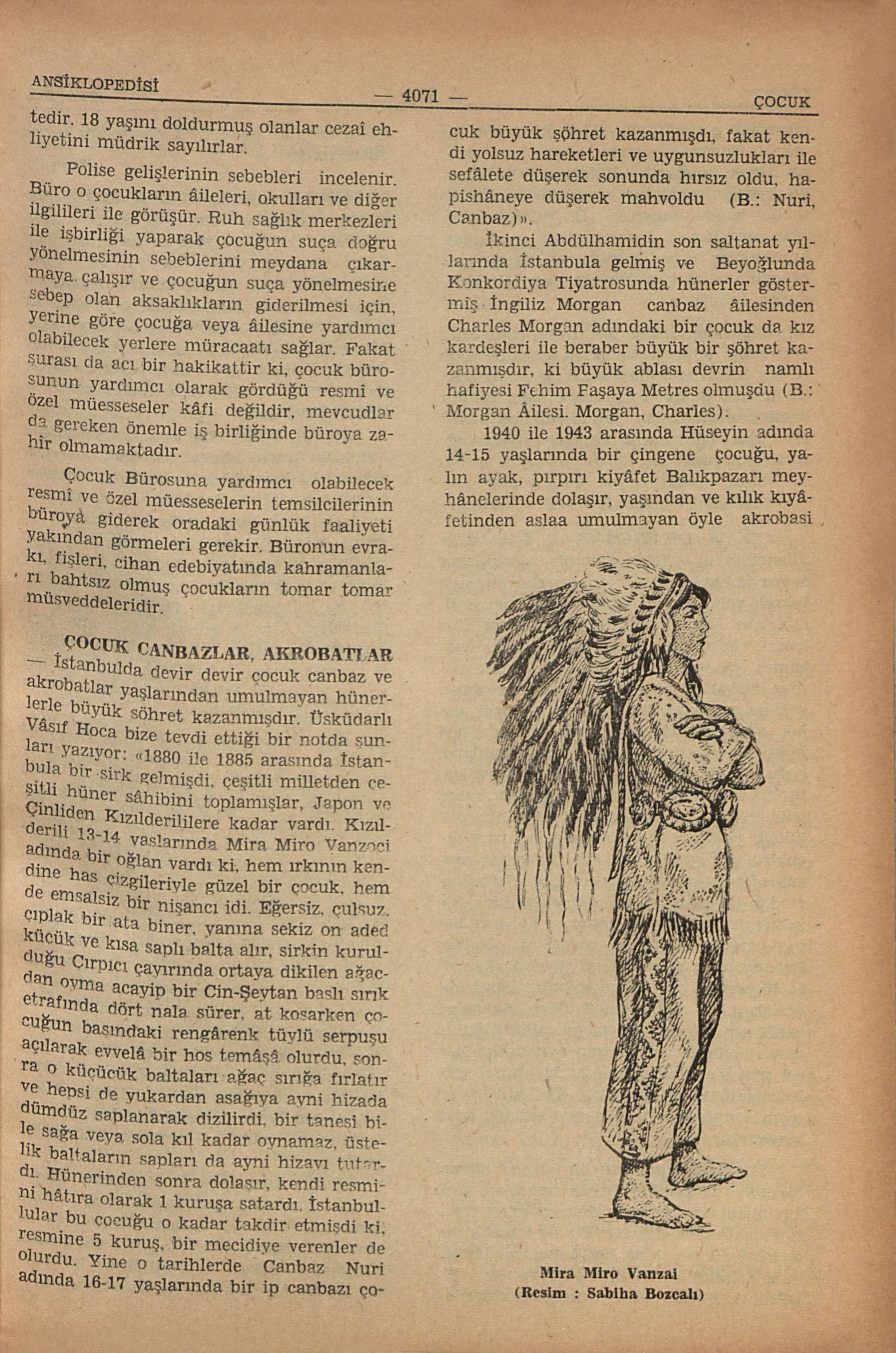 İstanbulda devir devir çocuk canbaz ve akrobatlar yaşlarından umulmayan hünerlerle büyük şöhret kazanmışdır. Üsküdarlı Vâsıf Hoca bize tevdi ettiği bir notda şunları yazıyor: “1880 ile 1885 arasında İstanbula bir sirk gelmişdi, çeşitli milletden çeşitli hüner sâhibini toplamışlar, Japon ve Çinliden Kızılderililere kadar vardı. Kızılderili 13-14 yaşlarında Mira Miro Vanzoci adında bir oğlan vardı ki, hem ırkının kendine has çizgileriyle güzel bir çocuk, hem de emsalsiz bir nişancı idi. Eğersiz, çulsuz, çıplak bir ata biner, yanına sekiz on aded küçük ve kısa saplı balta alır, sirkin kurulduğu Çırpıcı çayırında ortaya dikilen ağaçdan oyma acayip bir Cin-Şeytan başlı sırık etrafında dört nala sürer, at koşarken çocuğun başındaki rengârenk tüylü serpuşu açılarak evvelâ bir hoş temâşâ olurdu, sonra o küçücük baltaları ağaç sırığa fırlatır ve hepsi de yukardan aşağıya ayni hizada dümdüz saplanarak dizilirdi, bir tanesi bile sağa veya sola kıl kadar oynamaz, üstelik baltaların sapları da ayni hizayı tutardı. Hünerinden sonra dolaşır, kendi resmini hâtıra olarak 1 kuruşa satardı. İstanbullular bu çocuğu o kadar takdir etmişdi ki, resmine 5 kuruş, bir mecidiye verenler de olurdu. Yine o tarihlerde Canbaz Nuri adında 16-17 yaşlarında bir ip canbazı çocuk büyük şöhret kazanmışdı, fakat kendi yolsuz hareketleri ve uyğunsuzlukları ile sefâlete düşerek sonunda hırsız oldu, hapishâneye düşerek mahvoldu (B.: Nuri, Canbaz)”.
