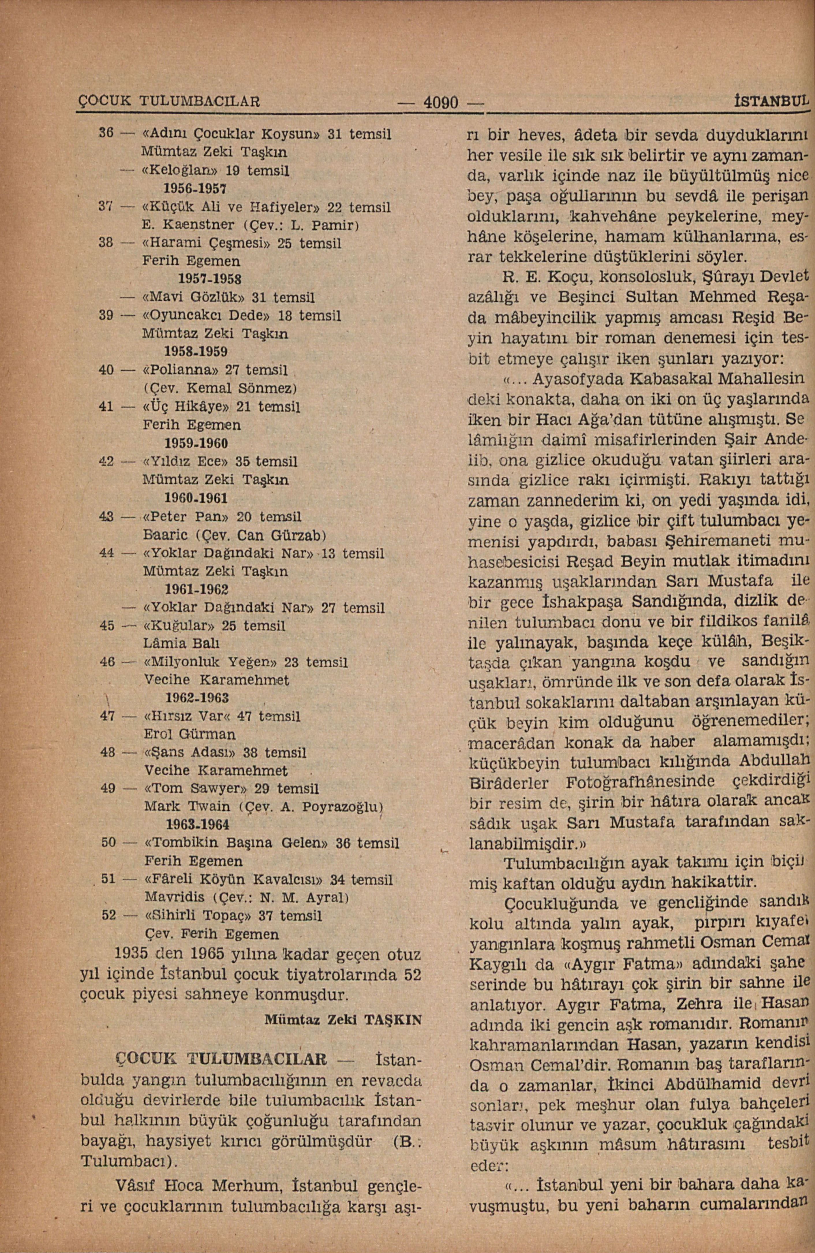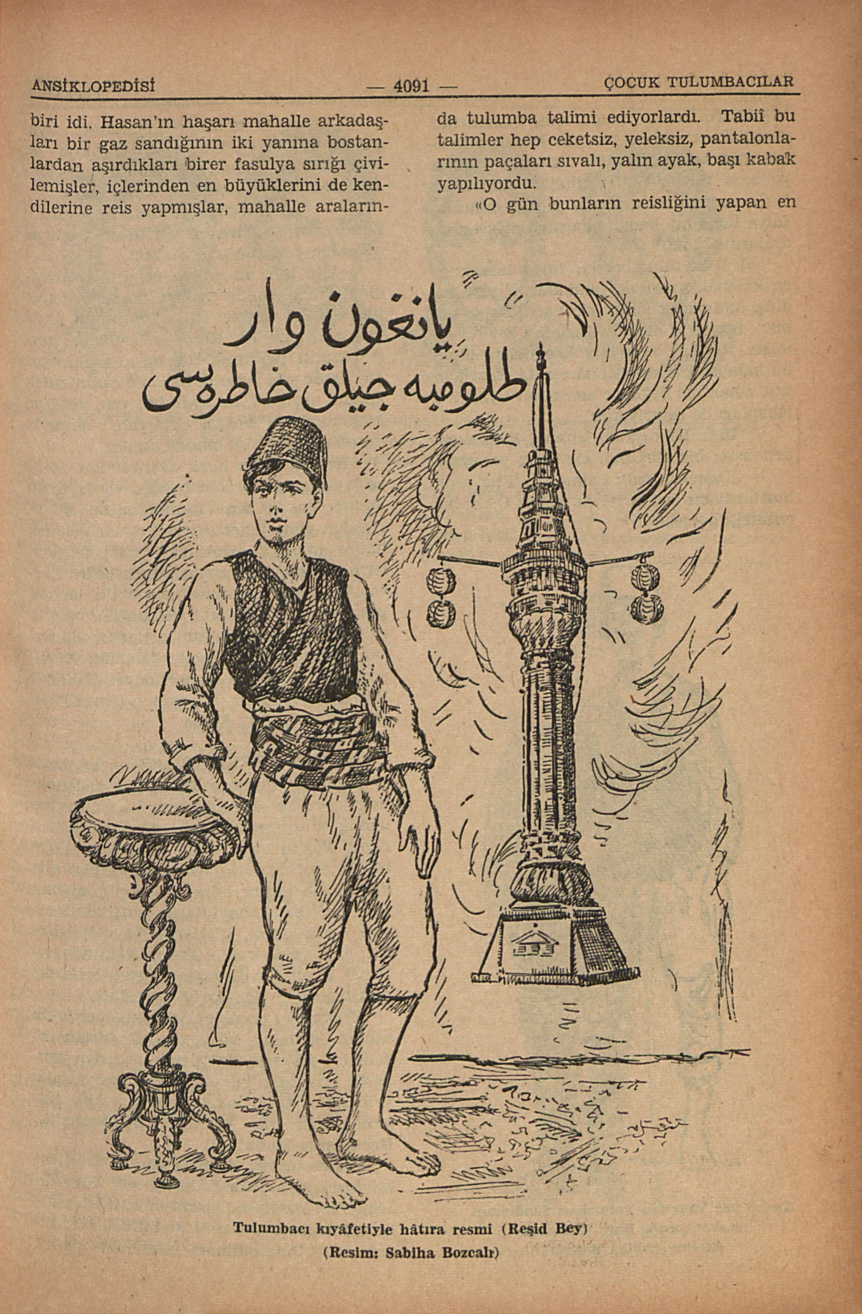 İstanbulda yangın tulumbacılığının en revacda olduğu devirlerde bile tulumbacılık İstanbul halkının büyük çoğunluğu tarafından bayağı, haysiyet kırıcı görülmüşdür (B.: Tulumbacı). Vâsıf Hoca Merhum, İstanbul gençleri ve çocuklarının tulumbacılığa karşı aşırı bir heves, âdeta bir sevda duyduklarını her vesile ile sık sık belirtir ve aynı zamanda, varlık içinde naz ile büyütülmüş nice bey, paşa oğullarının bu sevdâ ile perişan olduklarını, kahvehâne peykelerine, meyhâne köşelerine, hamam külhanlarına, esrar tekkelerine düştüklerini söyler. R. E. Koçu, konsolosluk, Şûrayı Devlet azâlığı ve Beşinci Sultan Mehmed Reşada mâbeyincilik yapmış amcası Reşid Beyin hayatını bir roman denemesi için tesbit etmeye çalışır iken şunları yazıyor: “... Ayasofyada Kabasakal Mahallesindeki konakta, daha on iki on üç yaşlarında iken bir Hacı Ağa’dan tütüne alışmıştı. Selâmlığın daimî misafirlerinden Şair Andelib, ona gizlice okuduğu vatan şiirleri arasında gizlice rakı içirmişti. Rakıyı tattığı zaman zannederim ki, on yedi yaşında idi, yine o yaşda, gizlice bir çift tulumbacı yemenisi yapdırdı, babası Şehiremaneti muhasebesicisi Reşad Beyin mutlak itimadını kazanmış uşaklarından Sarı Mustafa ile bir gece İshakpaşa Sandığında, dizlik denilen tulumbacı donu ve bir fildikos fanilâ ile yalınayak, başında keçe külâh, Beşiktaşda çıkan yangına koşdu ve sandığın uşakları, ömründe ilk ve son defa olarak İstanbul sokaklarını daltaban arşınlayan küçük beyin kim olduğunu öğrenemediler; macerâdan konak da haber alamamışdı; küçükbeyin tulumbacı kılığında Abdullah Birâderler Fotoğrafhânesinde çekdirdiği bir resim de, şirin bir hâtıra olarak ancak sâdık uşak Sarı Mustafa tarafından saklanabilmişdir.” Tulumbacılığın ayak takımı için biçilmiş kaftan olduğu aydın hakikattir. Çocukluğunda ve gençliğinde sandık kolu altında yalın ayak, pırpırı kıyafet yangınlara koşmuş rahmetli Osman Cemal Kaygılı da “Aygır Fatma” adındaki şaheserinde bu hâtırayı çok şirin bir sahne ile anlatıyor. Aygır Fatma, Zehra ile hasan adında iki gencin aşk romanıdır. Romanın kahramanlarından Hasan, yazarın kendisi Osman Cemal’dir. Romanın baş taraflarında o zamanlar, İkinci Abdülhamid devri sonları pek meşhur olan fulya bahçeleri tasvir olunur ve yazar, çocukluk çağındaki büyük aşkının mâsum hâtırasını tesbit eder: “... İstanbul yeni bir bahara daha kavuşmuştu, bu yeni baharın cumalarından biri idi. Hasan’ın haşarı mahalle arkadaşları bir gaz sandığının iki yanına bostanlardan aşırdıkları birer fasulya sırığı çivilemişler, içlerinden en büyüklerini de kendilerine reis yapmışlar, mahalle aralarında tulumba talimi ediyorlardı. Tabiî bu talimler hep ceketsiz, yeleksiz, pantalonlarının paçaları sıvalı, yalın ayak, başı kabak yapılıyordu. “O gün bunların reisliğini yapan en büyükleri, Cuma olduğu için, mahallenin çekirdekten yetişme olan bu küçük tulumbacı namzedlerini önüne katmış, onlara yollarda türlü şaklabanlıklar yaptırarak, türlü naralar savurtarak, sandık omuzda, fulya tarlasına kadar çıkarmıştı. Hasan da aralarında idi. “Küçük tulumbacılar fulya tarlasının en kalabalık yerinde sandıklarını yere indirip dinlenmek için yerlere serdikleri zaman, bunların etrafını bir sürü seyirci almıştı. Reisleri olan büyükçe oğlan şimdi bu kalabalığın karşısında etrafa caka için salt adları ile değil de sonradan uydurma lâkapları ile çağırıyordu: — Ulan Kılkuyruk Şaban... kalk şuradan bana bir ateş bul, cıgaramı yakayım. — Ulan Cimdallı Saim, haydi bakalım burnunla bir zurna çal da Topuz Ömer bir çiftetelli oynasın — Ulan Zümbülbekek Mehmed... ayağına yolda diken batmış, al şu çakıyı da dikeni çıkar, malum ya, dönüşde çarşıdan geçeceğiz, baş takımı siz kovacaksınız!... — Ulan Kuşkonmaz Hasan... oturduğun yerden yeniden bir beyitli nara düz de giderken yollarda onu atalım!... “İşte tam bu sırada etrafını sarmış olanların arasında uzunca boylu, esmerce bir kızın gözlerine ilişen Hasan o anda kıpkırmızı kesildi. Kızın da kendisine karşı yüzünü ekşitmesi üzerine o kıpkırmızı yüz limon gibi sararak Hasan o canım misk kokulu, ap açık, ap aydınlık, yem yeşil ve koskoca fulya tarlası simsiyah, daracık, havasız, berbad bir zından kesildi...” Her sandığın ayak takımından 14-15 yaşlarında bir maskot çocuğu vardı; grup hâlinde çekdirtilen resimlerde bu oğlancıkların eline fener vermek de bir gelenek haline gelmişdi, o resimleri görüp fenercilerin çocuk olduğu zan edilmemelidir; maskot tulumbacı çocuklar takım ile ancak pek yakın semtlerdeki yangınlara koşdurulurdu. Bu çocuk tulumbacılardan da ancak üçünün adını tesbit edebildik: Kazlıçeşme Sandığından Kara Hidâyet, Üsküdar Dâirelilerden Filiz Hüseyin, Çengelköyü Kiliselilerden Kız Ahiba. Tulumbacı kıyâfetiyle hâtıra resmi (Reşid Bey) (Resim: Sabiha Bozcalı) Kazlıçeşme Yangının Tulumbacı Sandığının maskot çocuğu Kara Süleyman (Resim: Sabiha Bozcalı)