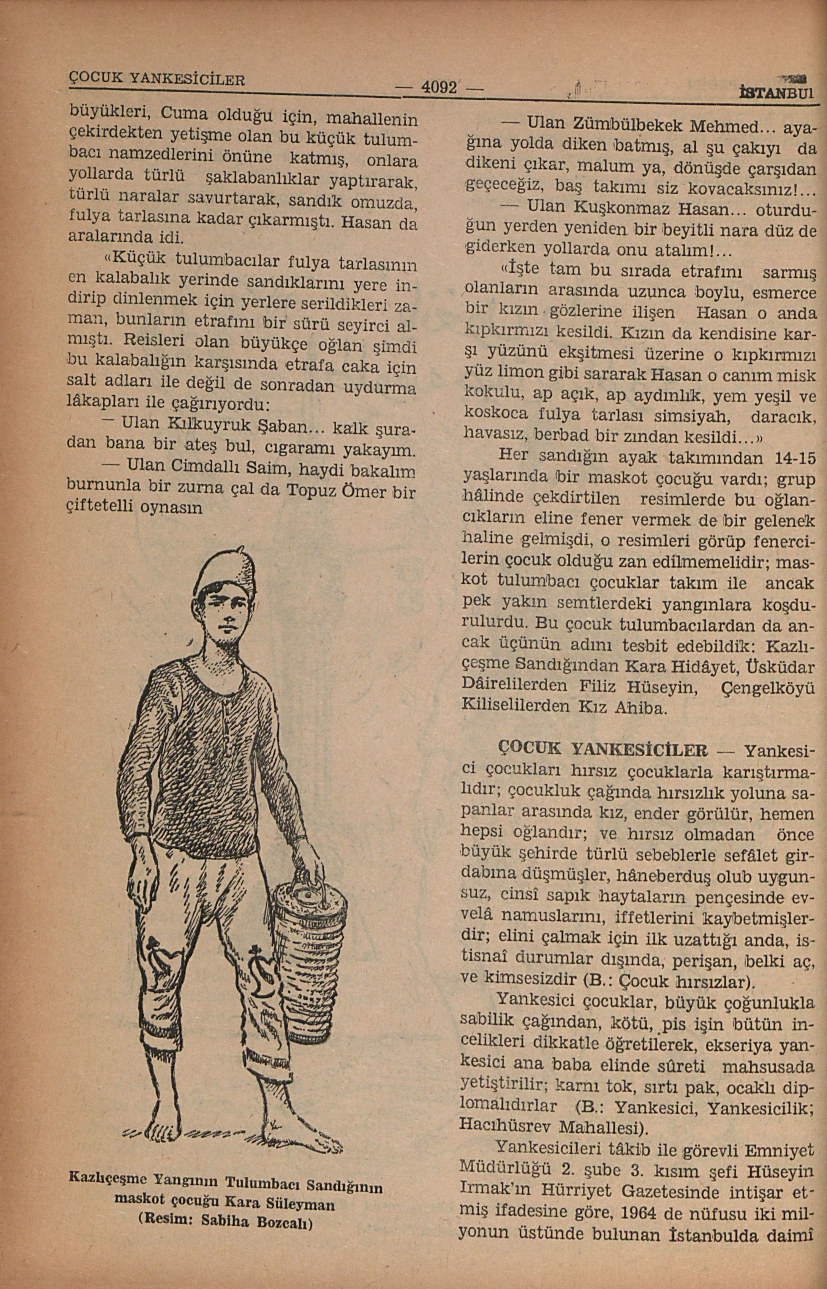 “Zeyneb Kemendi: Hacıhüsrev Mahallesinin yankesici kız çocuklarından; ondan fazla sabıkası vardır; Nuray Kemendi; yankesiciliğin bütün usullerini bilir, yirmi defa polisin eline geçmiş ve savcılığa sevkedilmişdir; Şengül Baldır: 7 yaşındadır, çok küçük olmasına rağmen çanta açmakta müthiş maharet edinmişdir; Yüksel Suna: 9 yaşındaki bu kız yeni suç işlemeye başlamışdır, iyi yetiştirilmiş, usta parmaklara sâhibdir: Hamiyet Seymener: yaşından umulmayan zekâya (kurnazlığa) sâhibdir; çocuk yankesicilerin en müdhişlerinden biridir; Muammer Çelikdağ: 11 yaşındaki bu oğlanın beş sabıkası vardır, yaman yankesicidir, yardımcı olarak çalışır” “Hürriyet Gazetesi 14 Şubat 1964)