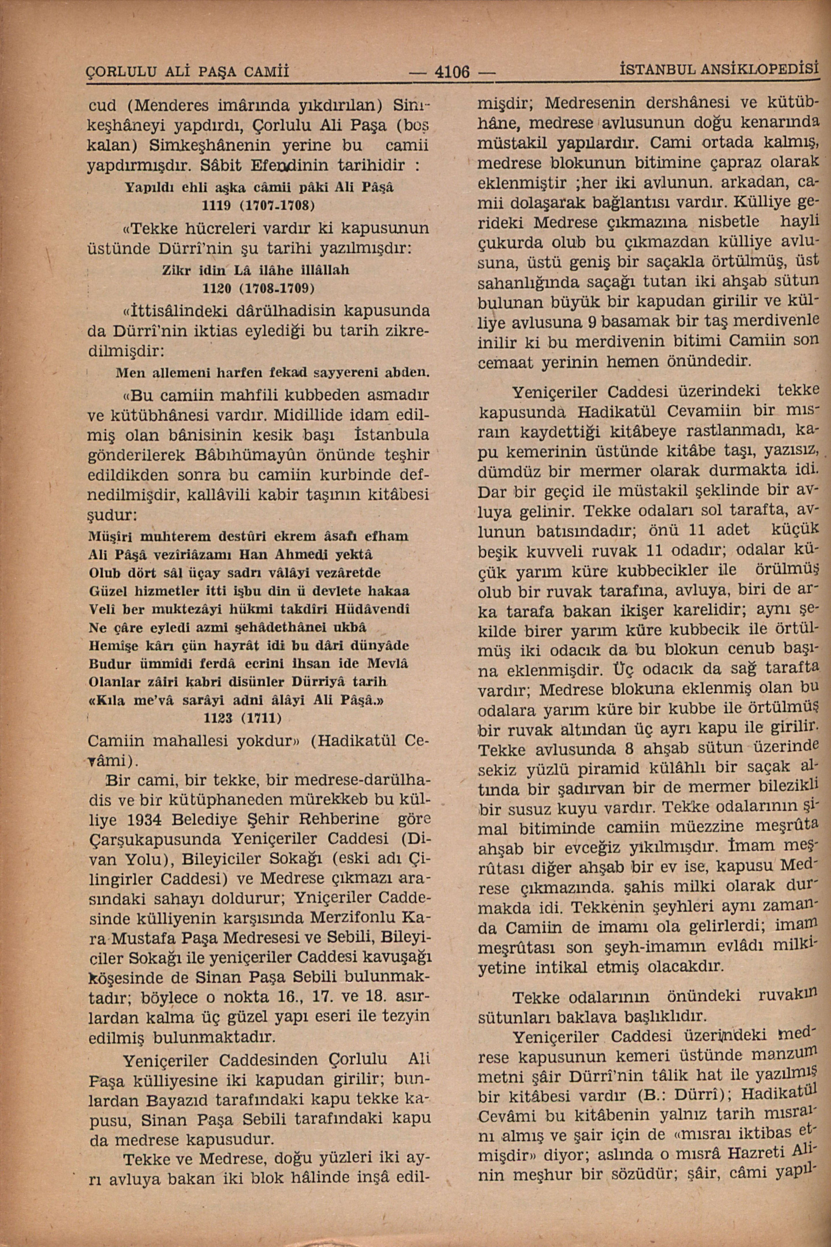 Çarşıkapusunda Yeniçeriler Caddesi üzerindedir; türk İstanbulu süsleyen ecdad yadigârlarından, on sekizinci asır eserlerindendir; bânisi sadırâzam Çorlulu Ali Paşadır (B.: Ali Paşa, Çorlulu, cild 2, sayfa 680). Hadikatül Cevami şu malûmatı veriyor: “Camiin yeri aslında Simkeşhâne idi; (Beyazıddaki) Darbhâne Enderuna (Bâbıhümayun içinde Aya İrini Kilisesi yanındaki binaya) nakil olundukta Darbhânenin yerine pâdişahın başkadını hâlen mevcud (Menderes imârında yıkdırılan) Simkeşhâneyi yaptırdı, Çorlulu Ali Paşa (boş kalan) Simkeşhânenin yerine bu camii yapdırmışdır. Sâbit Efendinin tarihidir : Yapıldı ehli aşka câmii pâki Ali Pâşâ 1119 (1707-1708) “Tekke hücreleri vardır ki kapusunun üstünde Dürrî’nin şu tarihi yazılmışdır: Zikr idin Lâ ilâhe illâllah 1120 (1708-1709) “İttisâlindeki dârülhadisin kapusunda da Dürrî’nin iktias eylediği bu tarih zikredilmişdir: Men allemeni harfen fekad sayyereni abden. “Bu camiin mahfili kubbeden asmadır ve kütübhânesi vardır. Midillide idam edilmiş olan bânisinin kesik başı İstanbula gönderilerek Bâbıhümayûn önünde teşhir edildikten sonra bu camiin kurbinde defnedilmişdir, kallâvili kabir taşının kitâbesi şudur: Müşîri muhterem destûri ekrem âsafı efham Ali Pâşa vezîriâzamı Han Ahmedi yektâ Olub dört sâl üçay sadrı vâlâyi vezâretde Güzel hizmetler itti işbu din ü devlete hakaa Velî ber muktezâyi hükmi takdîri Hüdâvendî Ne çâre eyledi azmi şehâdethânei ukbâ Hemişe kârı çün hayrât idi bu dâri dünyâde Budur ümmîdi ferdâ ecrini ihsan ide Mevlâ Olanlar zâiri kabri disünler Dürriyâ tarih “Kıla me’vâ sarâyi adni âlâyi Ali Pâşâ.” 1123 (1711) Camiin mahallesi yokdur” (Hadikatül Cevâmi). Bir cami, bir tekke, bir medrese-darülhadis ve bir kütüphaneden mürekkeb bu külliye 1934 Belediye Şehir Rehberine göre Çarşukapusunda Yeniçeriler Caddesi (Divan Yolu), Bileyciler Sokağı (eski adı Çilingirler Caddesi) ve Medrese çıkmazı arasındaki sahayı doldurur; Yniçeriler Caddesinde külliyenin karşısında Merzifonlu Kara Mustafa Paşa Medresesi ve Sebili, Bileyiciler Sokağı ile yeniçeriler Caddesi kavuşağı köşesinde de Sinan Paşa Sebili bulunmaktadır; böylece o nokta 16., 17. ve 18. asırlardan kalma üç güzel yapı eseri ile tezyin edilmiş bulunmaktadır. Yeniçeriler Caddesinden Çorlulu Ali Paşa külliyesine iki kapudan girilir; bunlardan Bayazıd tarafındaki kapu tekke kapusu, Sinan Paşa Sebili tarafındaki kapu da medrese kapusudur. Tekke ve Medrese, doğu yüzleri iki ayrı avluya bakan iki blok hâlinde inşâ edilmişdir; Medresenin dershânesi ve kütübhâne, medrese avlusunun doğu kenarında müstakil yapılardır. Cami ortada kalmış, medrese blokunun bitimine çapraz olarak eklenmiştir ;her iki avlunun arkadan, camii dolaşarak bağlantısı vardır. Külliye gerideki Medrese çıkmazına nisbetle hayli çukurda olub bu çıkmazdan külliye avlusuna, üstü geniş bir saçakla örtülmüş, üst sahanlığında saçağı tutan iki ahşab sütun bulunan büyük bir kapudan girilir ve külliye avlusuna 9 basamak bir taş merdivenle inilir ki bu merdivenin bitimi Camiin son cemaat yerinin hemen önündedir. Yeniçeriler Caddesi üzerindeki tekke kapusunda Hadikatül Cevamiin bir mısraın kaydettiği kitâbeye rastlanmadı, kapu kemerinin üstünde kitâbe taşı, yazısız, dümdüz bir mermer olarak durmakta idi. Dar bir geçid ile müstakil şeklinde bir avluya gelinir. Tekke odaları sol tarafta, avlunun batısındadır; önü 11 adet küçük beşik kuvveli ruvak 11 odadır; odalar küçük yarım küre kubbecikler ile örülmüş olub bir ruvak tarafına, avluya, biri de arka tarafa bakan ikişer karelidir; aynı şekilde birer yarım küre kubbecik ile örtülmüş iki odacık da bu blokun cenub başına eklenmişdir. Üç odacık da sağ tarafta vardır; Medrese blokuna eklenmiş olan bu odalara yarım küre bir kubbe ile örtülmüş bir ruvak altından üç ayrı kapu ile girilir. Tekke avlusunda 8 ahşab sütun üzerinde sekiz yüzlü piramid külâhlı bir saçak altında bir şadırvan bir de mermer bilezikli bir susuz kuyu vardır. Tekke odalarının şimal bitiminde camiin müezzine meşrûta ahşab bir evceğiz yıkılmışdır. İmam meşrûtası diğer ahşab bir ev ise, kapusu Medrese çıkmazında. şahis milki olarak durmakda idi. Tekkenin şeyhleri aynı zamanda Camiin de imamı ola gelirlerdi; imam meşrûtası son şeyh-imamın evlâdı milkiyetine intikal etmiş olacakdır. Tekke odalarının önündeki ruvakın sütunları baklava başlıklıdır. Yeniçeriler Caddesi üzerindeki medrese kapusunun kemeri üstünde manzum metni şâir Dürrî’nin tâlik hat ile yazılmış bir kitâbesi vardır (B.: Dürrî); Hadikatül Cevâmi bu kitâbenin yalnız tarih mısraını almış ve şair için de “mısraı iktibas etmişdir” diyor; aslında o mısrâ Hazreti Alinin meşhur bir sözüdür; şâir, câmi yapıldığında bir kâmil kişinin Hz. Aliyi rüyâsında gördüğünü, ve o rüyâ içinde bizzat Hz. Ali tarafından bu sözün binâya tarih düşdüğünün hatırlatıldığını anlatıyor; kitabe metni şudur: Destûri kerem perver sadri nasfet küster Serdârı hayr yâver yâni Ali Pâşâ Ol âsafı deryâ dil hayrâta olub mâil Koydu bu cihan içre nice eseri vâlâ Bu buk’ai garibânı bünyâda kılub himmet Hulâsa sây eyledi yapdırdı güzel hakkaa Sükkâna hitâmında bir kâmili rûşen dil Târihi içün görmüş bir vâkiai gerrâ İbni ammi Peygamber yâni Ali Hayder İtmiş ol rüyâde bu kavli ana inhâ Kim gaayete yittikde bu medresei âlî Târihini itsünler bir mısrâ ile inşâ Zirâ adedi ânın bu sâle muvâfıkdır Vâkide güzel düşdü (yekpârevü müstesnâ) Gûyâ ki kerâmettir Dürri ana bu târih “Men allemeni harfen fekad sayyereni abden.” Tekkede olduğu