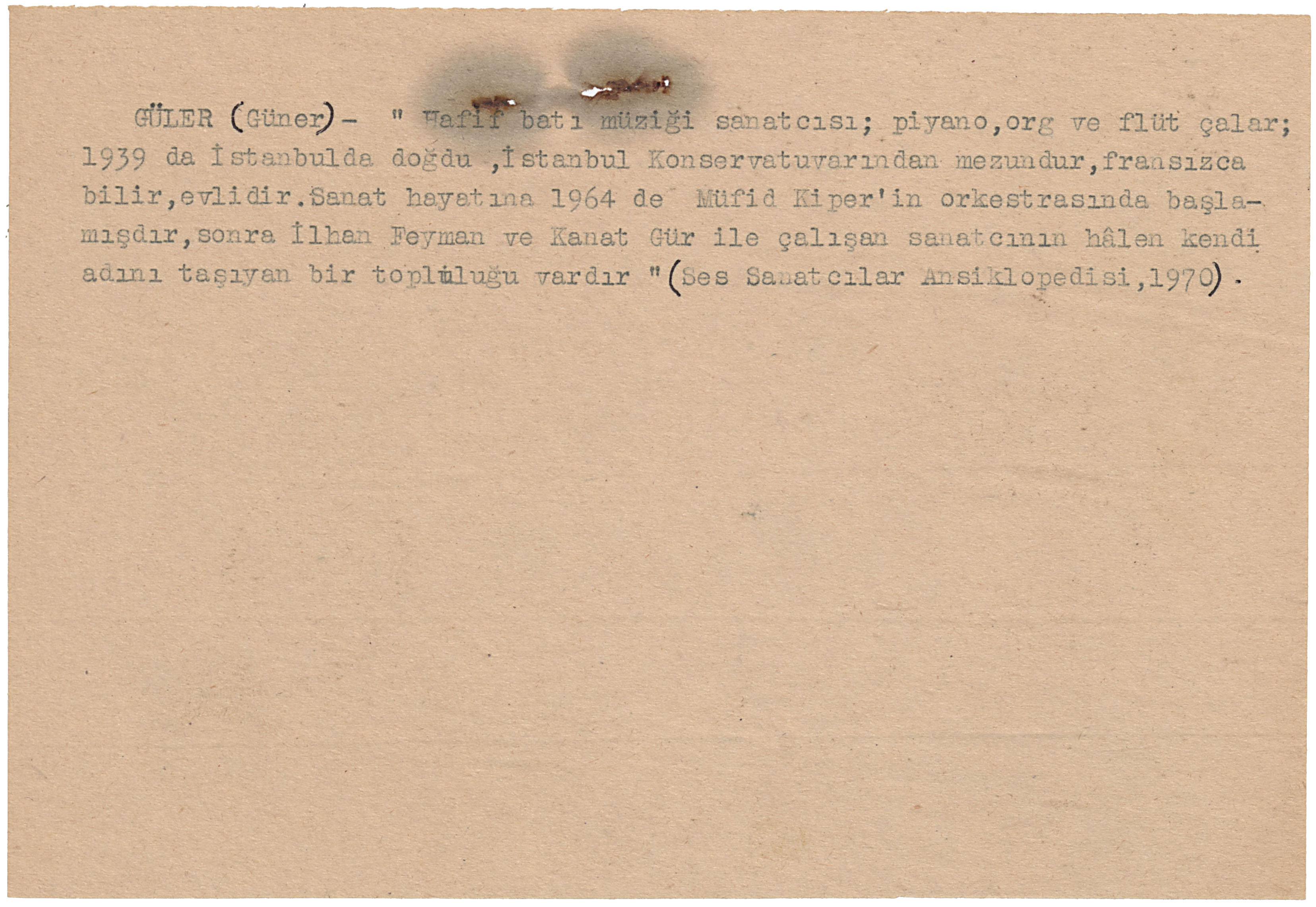 GÜLER (Güner) – “ Hafif batı müziği sanatcısı; piyano,org ve flüt çalar; 1939 da İstanbulda doğdu ,İstanbul Konservatuvarından mezundur,fransızca bilir,evlidir.Sanat hayatına 1964 de Müfid Kiper’in orkestrasında başlamışdır,sonra İlhan Feyman ve Kanat Gür ile çalışan sanatcının hâlen kendi adını taşıyan bir topluluğu vardır ” (Ses Sanatcılar Ansiklopedisi,1970).