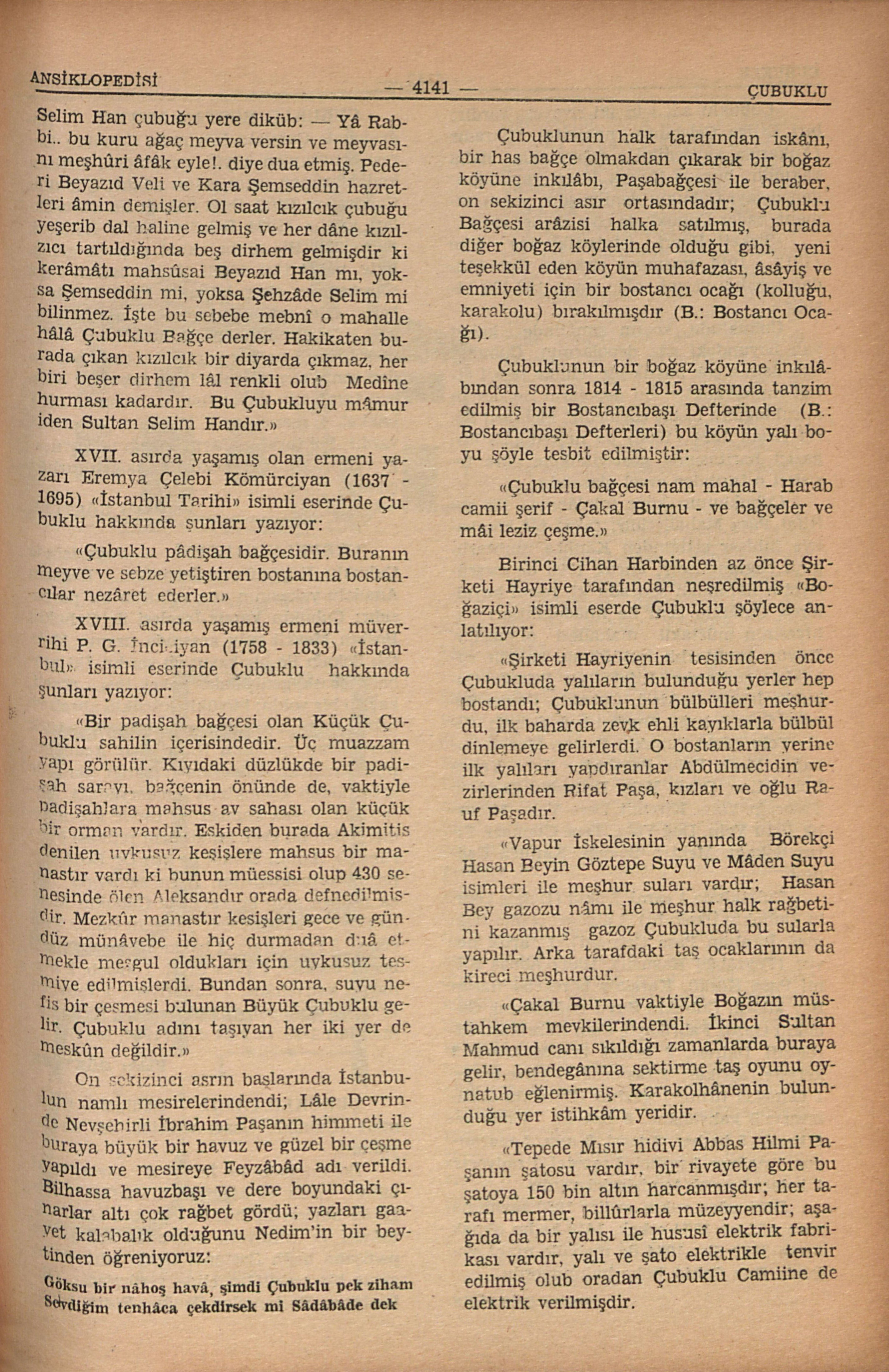 “Çubuklu pâdişah bağçesidir. Buranın meyve ve sebze yetiştiren bostanına bostancılar nezâret ederler.”