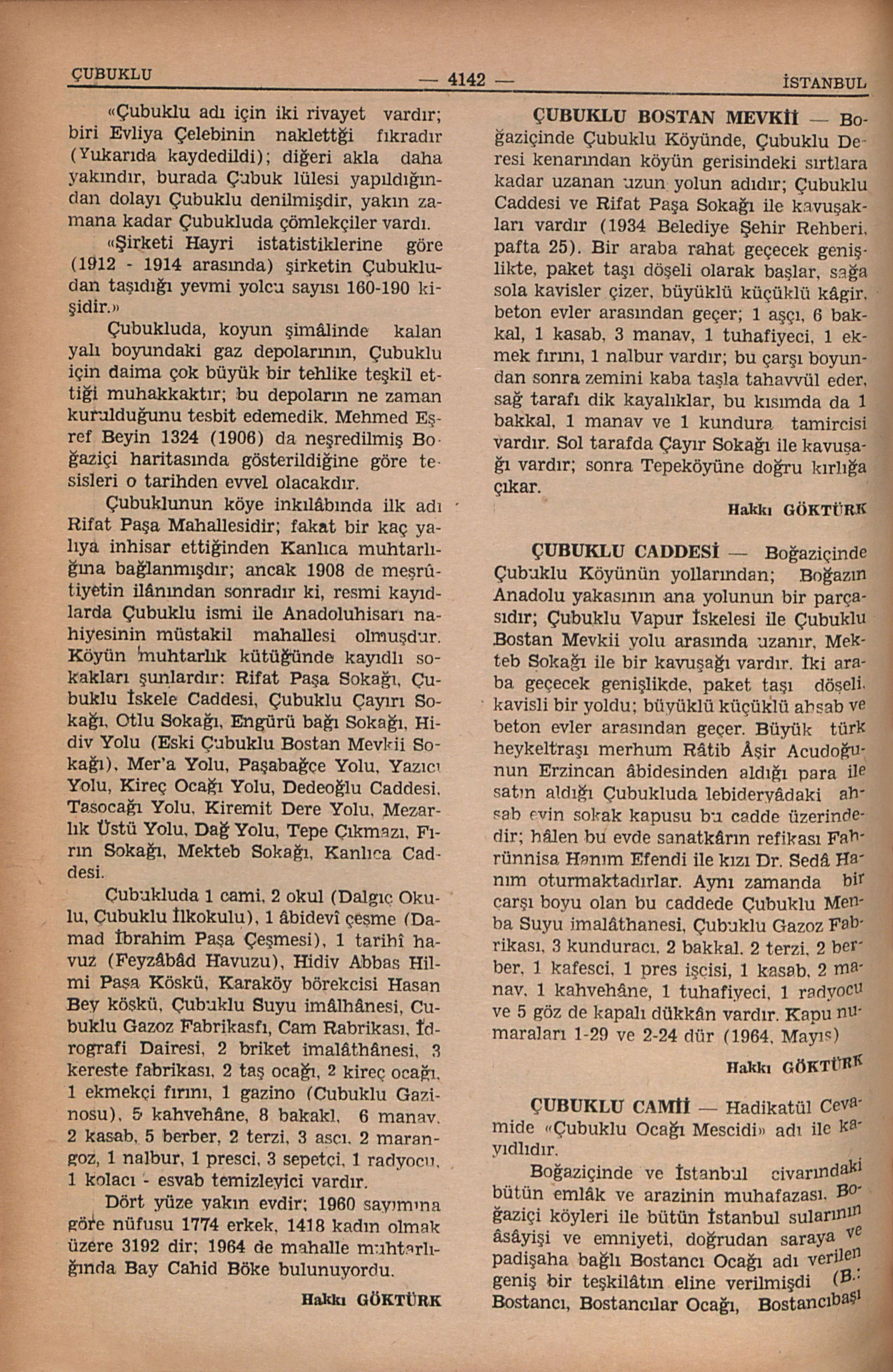Boğaziçinde Çubuklu Köyünde, Çubuklu Deresi kenarından köyün gerisindeki sırtlara kadar uzanan uzun yolun adıdır; Çubuklu Caddesi ve Rifat Paşa Sokağı ile kavuşakları vardır (1934 Belediye Şehir Rehberi, pafta 25). Bir araba rahat geçecek genişlikte, paket taşı döşeli olarak başlar, sağa sola kavisler çizer, büyüklü küçüklü kâgir, beton evler arasından geçer; 1 aşçı, 6 bakkal, 1 kasab, 3 manav, 1 tuhafiyeci, 1 ekmek fırını, 1 nalbur vardır; bu çarşı boyundan sonra zemini kaba taşla tahavvül eder, sağ tarafı dik kayalıklar, bu kısımda da 1 bakkal, 1 manav ve 1 kundura tamircisi vardır. Sol tarafda Çayır Sokağı ile kavuşağı vardır; sonra Tepeköyüne doğru kırlığa çıkar.
