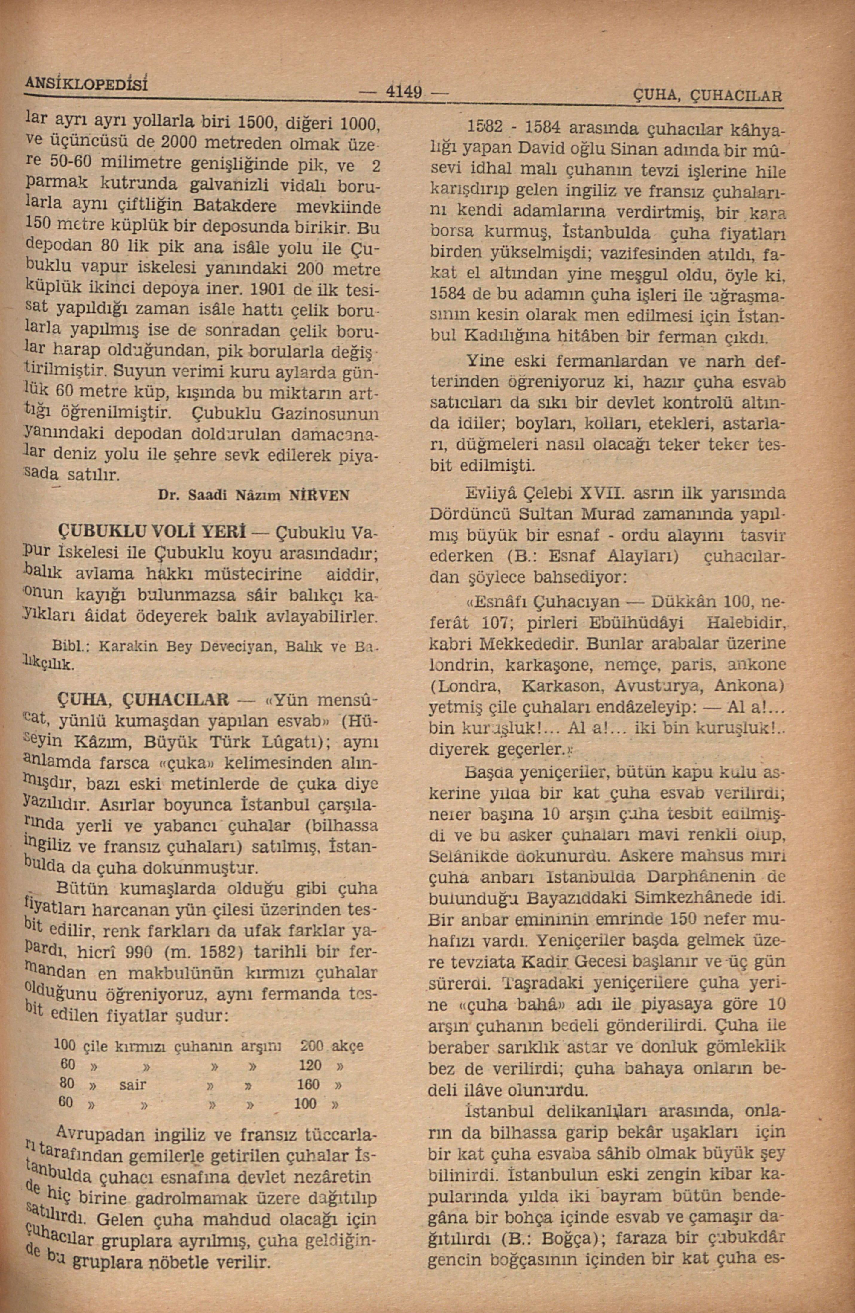 İstanbul delikanlıları arasında, onların da bilhassa garip bekâr uşakları için bir kat çuha esvaba sâhib olmak büyük şey bilinirdi. İstanbulun eski zengin kibar kapularında yılda iki bayram bütün bendegâna bir bohça içinde esvab ve çamaşır dağıtılırdı (B.: Boğça); faraza bir çubukdâr gencin boğçasının içinden bir kat çuha esvab yıkması efendinin ona aşırı iltifatı bilinirdi.