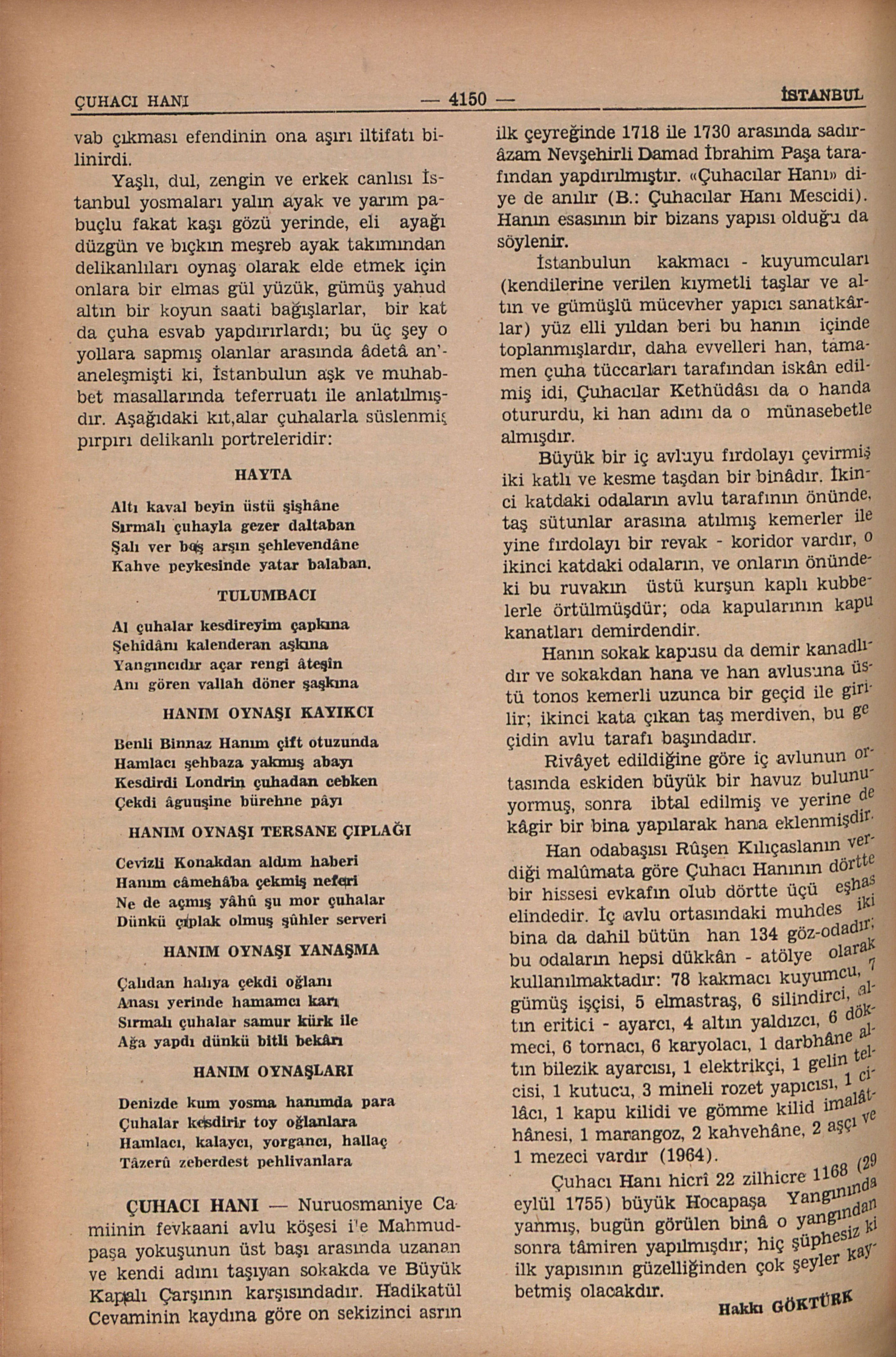 “Esnâfı Çuhacıyan — Dükkân 100, neferât 107; pirleri Ebülhüdâyi Halebidir, kabri Mekkededir. Bunlar arabalar üzerine londrin, karkaşone, nemçe, paris, ankone (Londra, Karkason, Avusturya, Ankona) yetmiş çile çuhaları endâzeleyip: — Al a!... bin kuruşluk!... Al a!... iki bin kuruşluk!.. diyerek geçerler.”