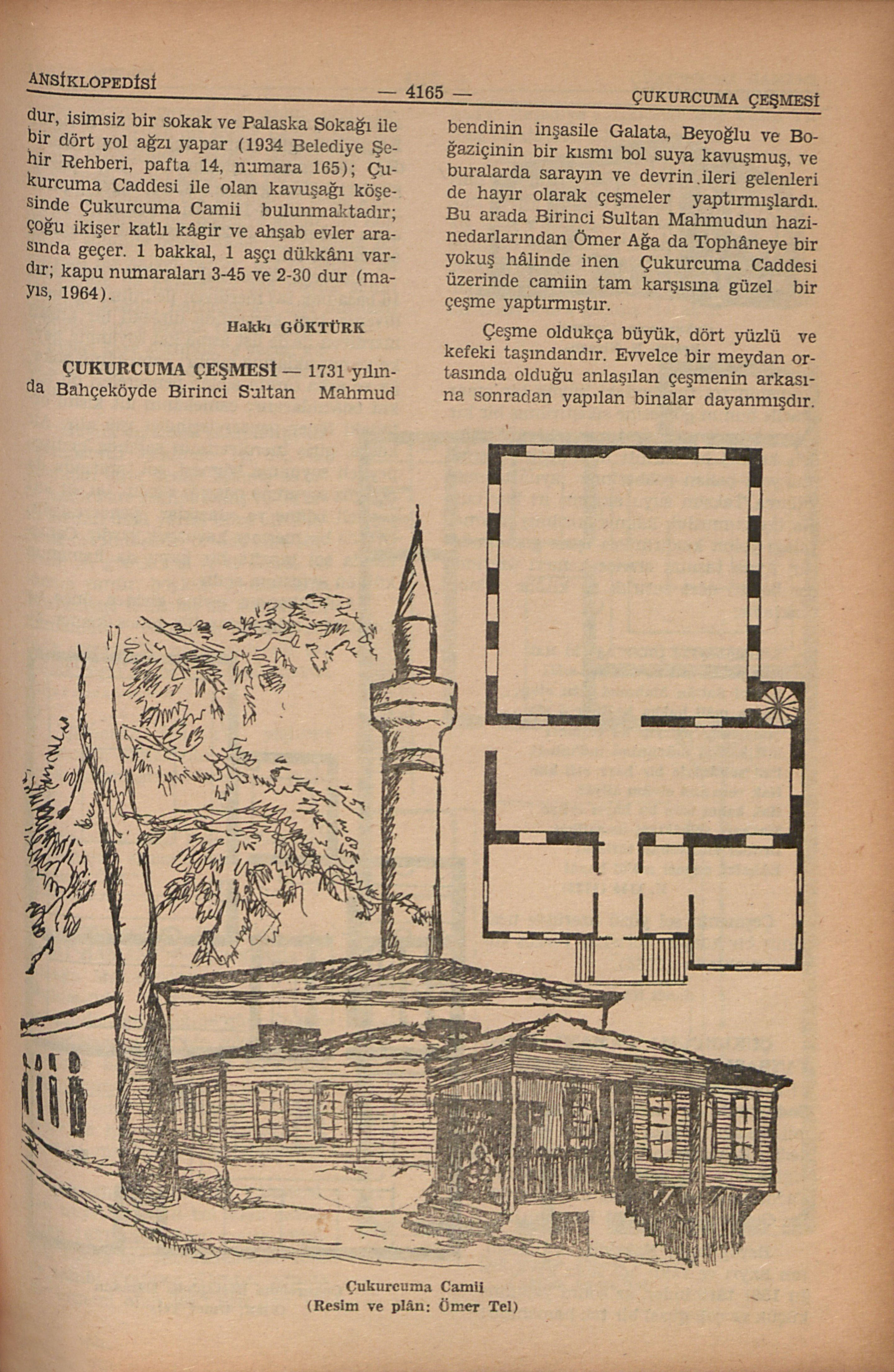 1731 yılında Bahçeköyde Birinci Sultan Mahmud bendinin inşasile Galata, Beyoğlu ve Boğaziçinin bir kısmı bol suya kavuşmuş, ve buralarda sarayın ve devrin ileri gelenleri de hayır olarak çeşmeler yaptırmışlardı. Bu arada Birinci Sultan Mahmudun hazinedarlarından Ömer Ağa ve Tophâneye bir yokuş hâlinde inen Çukurcuma Caddesi üzerinde camiin tam karşısına güzel bir çeşme yaptırmışdır.