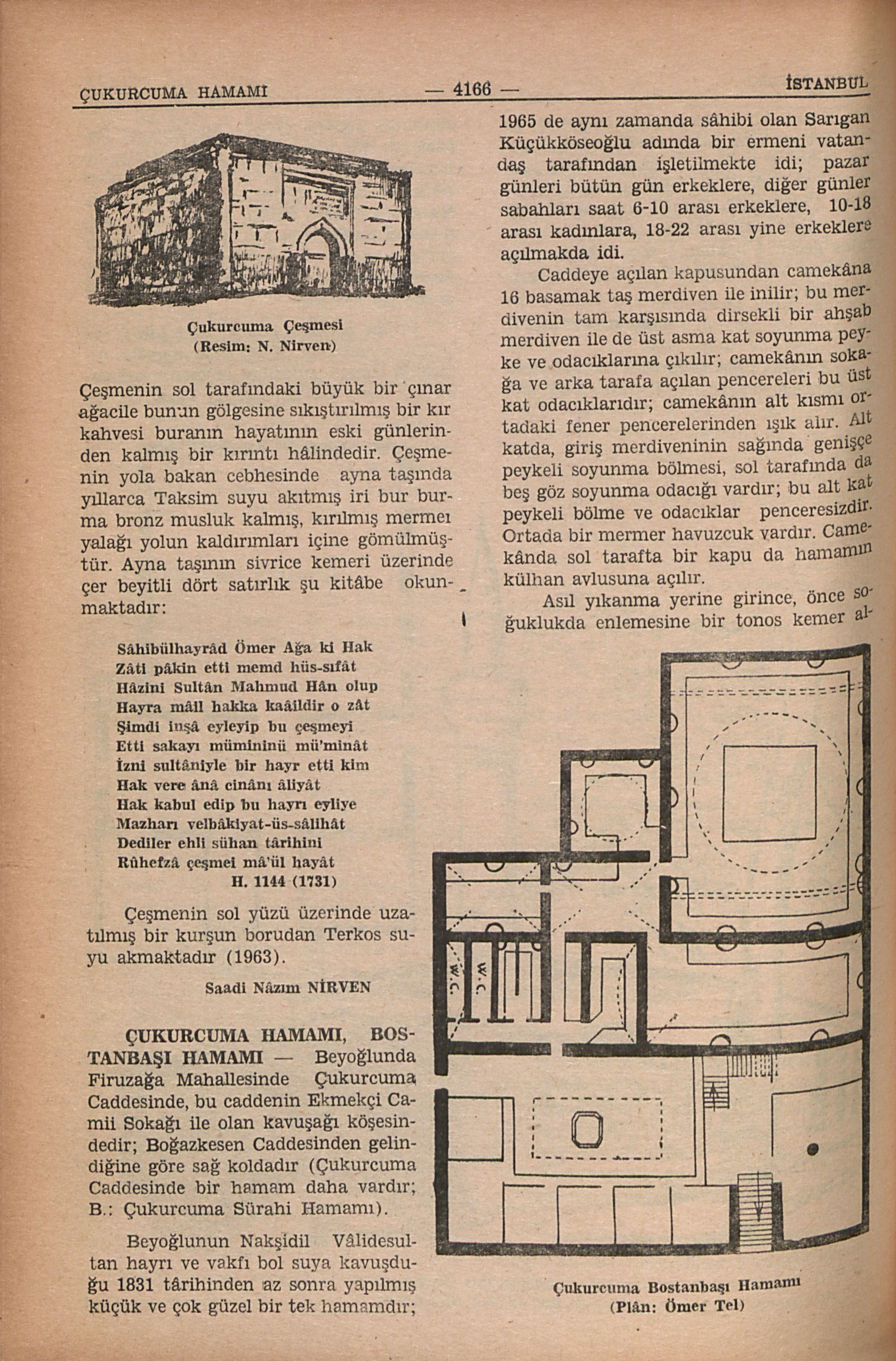 Beyoğlunun Nakşidil Vâlidesultan hayrı ve vakfı bol suya kavuşduğu 1831 târihinden az sonra yapılmış küçük ve çok güzel bir tek hamamdır; 1965 de aynı zamanda sâhibi olan Sarıgan Küçükköseoğlu adında bir ermeni vatandaş tarafından işletilmekte idi; pazar günleri bütün gün erkeklere, diğer günler sabahları saat 6-10 arası erkeklere, 10-18 arası kadınlara, 18-22 arası yine erkeklere açılmakda idi.