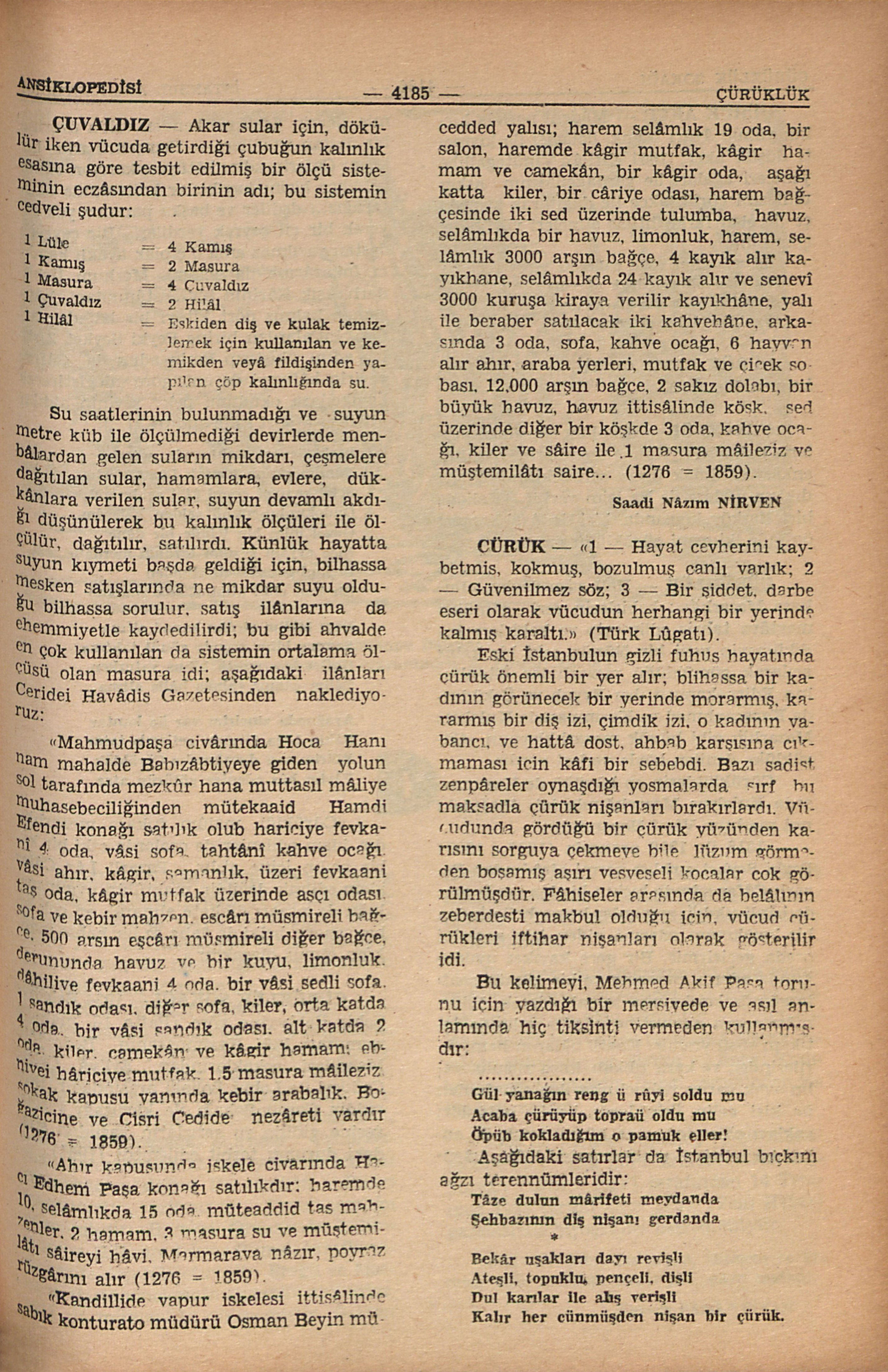Su saatlerinin bulunmadığı ve suyun metre küb ile ölçülmediği devirlerde menbâlardan gelen suların mikdarı, çeşmelere dağıtılan sular, hamamlara, evlere, dükkânlara verilen sular, suyun devamlı akdığı düşünülerek bu kalınlık ölçüleri ile ölçülür, dağıtılır, satılırdı. Künlük hayatta suyun kıymeti başda geldiği için, bilhassa mesken satışlarında ne mikdar suyu olduğu bilhassa sorulur, satış ilânlarına da ehemmiyetle kaydedilirdi; bu gibi ahvalde en çok kullanılan da sistemin ortalama ölçüsü olan masura idi; aşağıdaki ilânları Ceridei Havâdis Gazetesinden naklediyoruz: