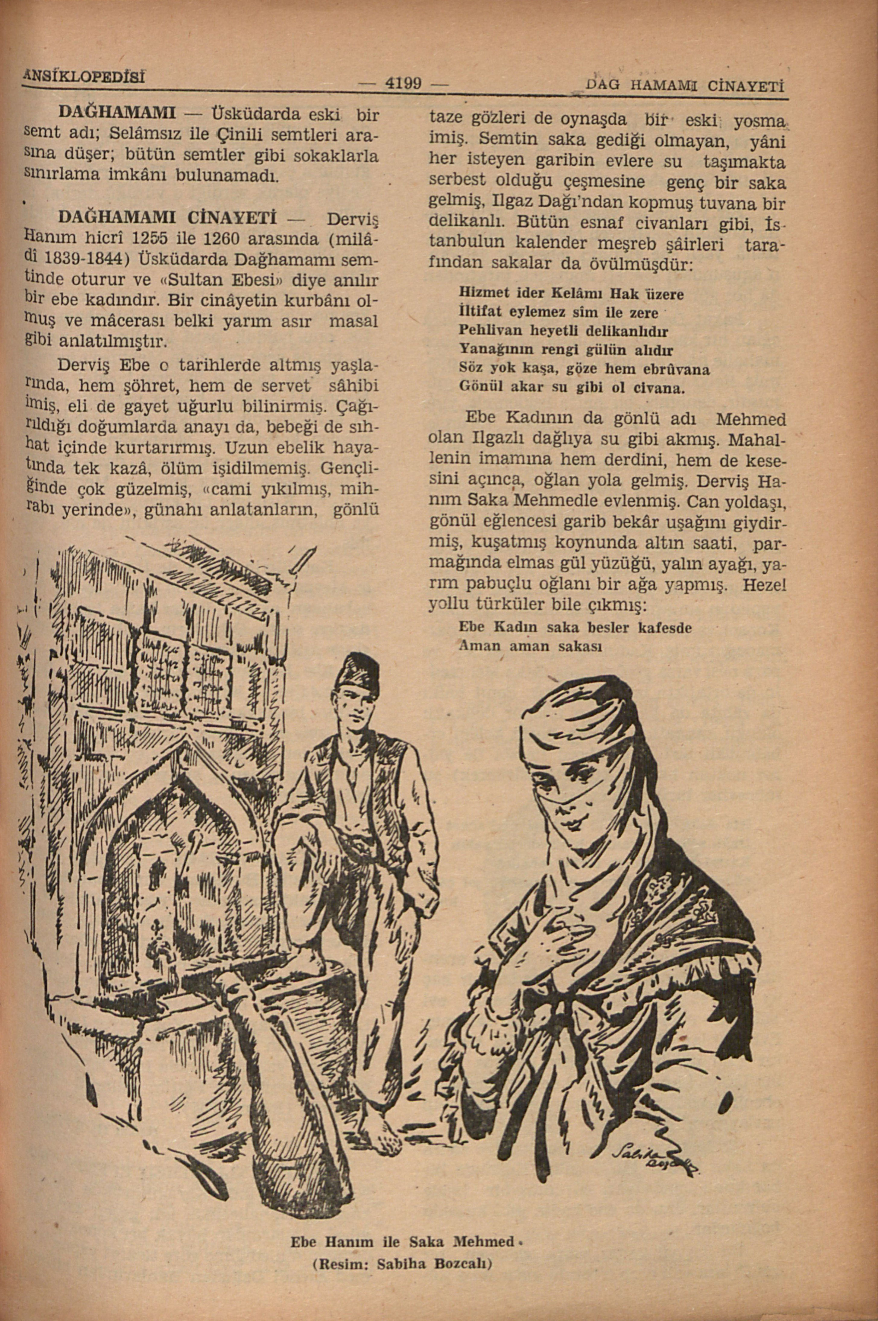 Derviş Ebe o tarihlerde altmış yaşlarında, hem şöhret, hem de servet sâhibi imiş, eli de gayet uğurlu bilinirmiş. Çağırıldığı doğumlarda anayı da, bebeği de sıhhat içinde kurtarırmış. Uzun ebelik hayatında tek kazâ, ölüm işidilmemiş. Gençliğinde çok güzelmiş, “cami yıkılmış, mihrabı yerinde”, günahı anlatanların, gönlü taze gözleri de oynaşda bir eski yosma imiş. Semtin saka gediği olmayan, yâni her isteyen garibin evlere su taşımakta serbest olduğu çeşmesine genç bir saka gelmiş, Ilgaz Dağı’ndan kopmuş tuvana bir delikanlı. Bütün esnaf civanları gibi, İstanbulun kalender meşreb şâirleri tarafından sakalar da övülmüşdür: