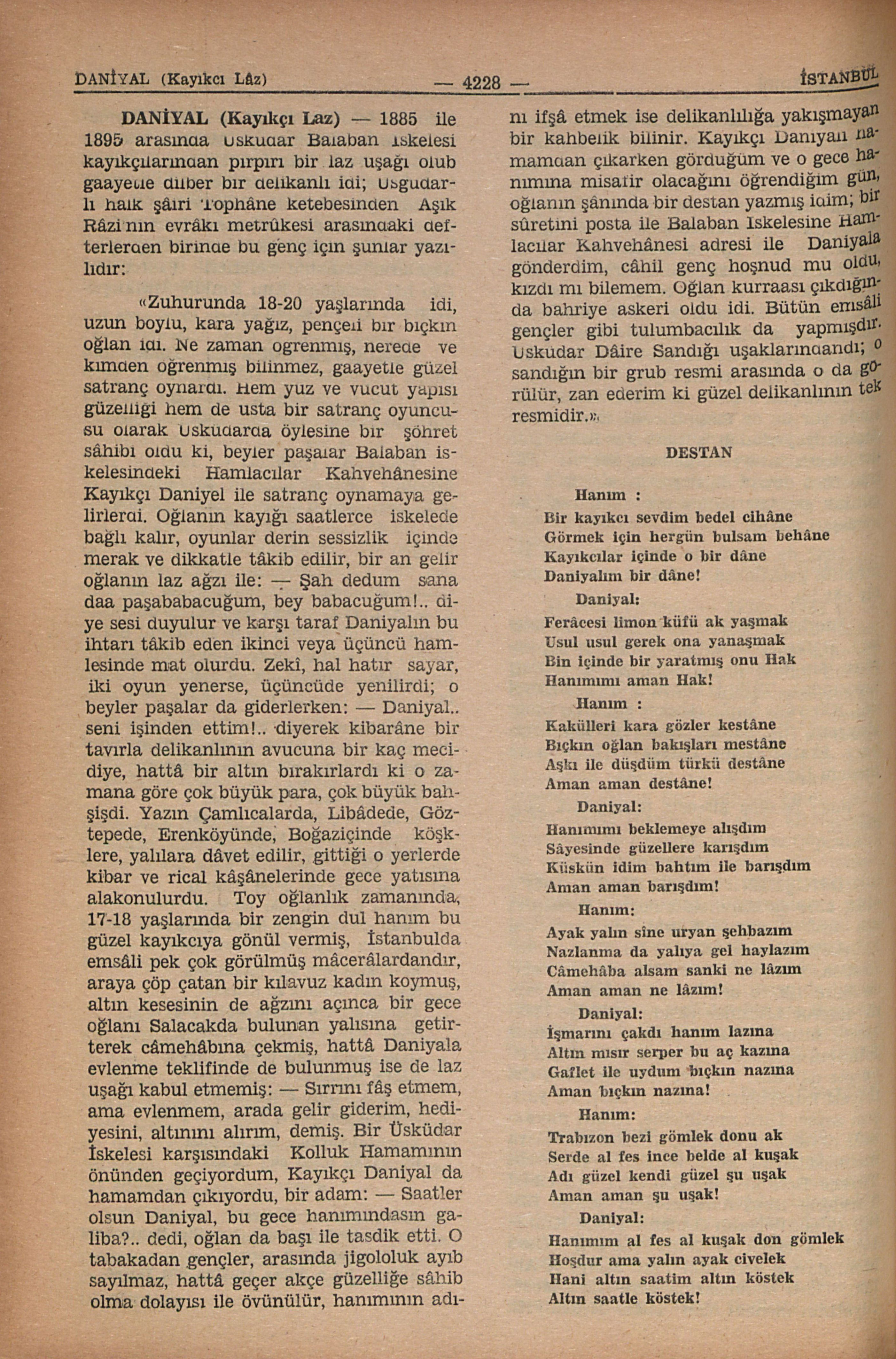 1885 ile 1895 arasında Üsküdar Balaban İskelesi kayıkçılarından pırpırı bir laz uşağı olub gaayetle dilber bir delikanlı idi; Üsgüdarlı halk şâiri Tophâne ketebesinden Aşık Râzi’nin evrâkı metrûkesi arasındaki defterlerden birinde bu genç için şunlar yazılıdır: “Zuhurunda 18-20 yaşlarında idi, uzun boylu, kara yağız, pençeli bir bıçkın oğlan idi. Ne zaman öğrenmiş, nerede ve kimden öğrenmiş bilinmez, gaayetle güzel satranç oynardı. Hem yüz ve vücut yapısı güzelliği hem de usta bir satranç oyuncusu olarak Üsküdarda öylesine bir şöhret sâhibi oldu ki, beyler paşalar Balaban iskelesindeki Hamlacılar Kahvehânesine Kayıkçı Daniyel ile satranç oynamaya gelirlerdi. Oğlanın kayığı saatlerce iskelede bağlı kalır, oyunlar derin sessizlik içinde merak ve dikkatle tâkib edilir, bir an gelir oğlanın laz ağzı ile: — Şah dedum sana daa paşababacuğum, bey babacuğum!.. diye sesi duyulur ve karşı taraf Daniyalın bu ihtarı tâkib eden ikinci veya üçüncü hamlesinde mat olurdu. Zekî, hal hatır sayar, iki oyun yenerse, üçüncüde yenilirdi; o beyler paşalar da giderlerken: — Daniyal.. seni işinden ettim!.. diyerek kibarâne bir tavırla delikanlının avucuna bir kaç mecidiye, hattâ bir altın bırakırlardı ki o zamana göre çok büyük para, çok büyük bahşişdi. Yazın Çamlıcalarda, Libâdede, Göztepede, Erenköyünd...