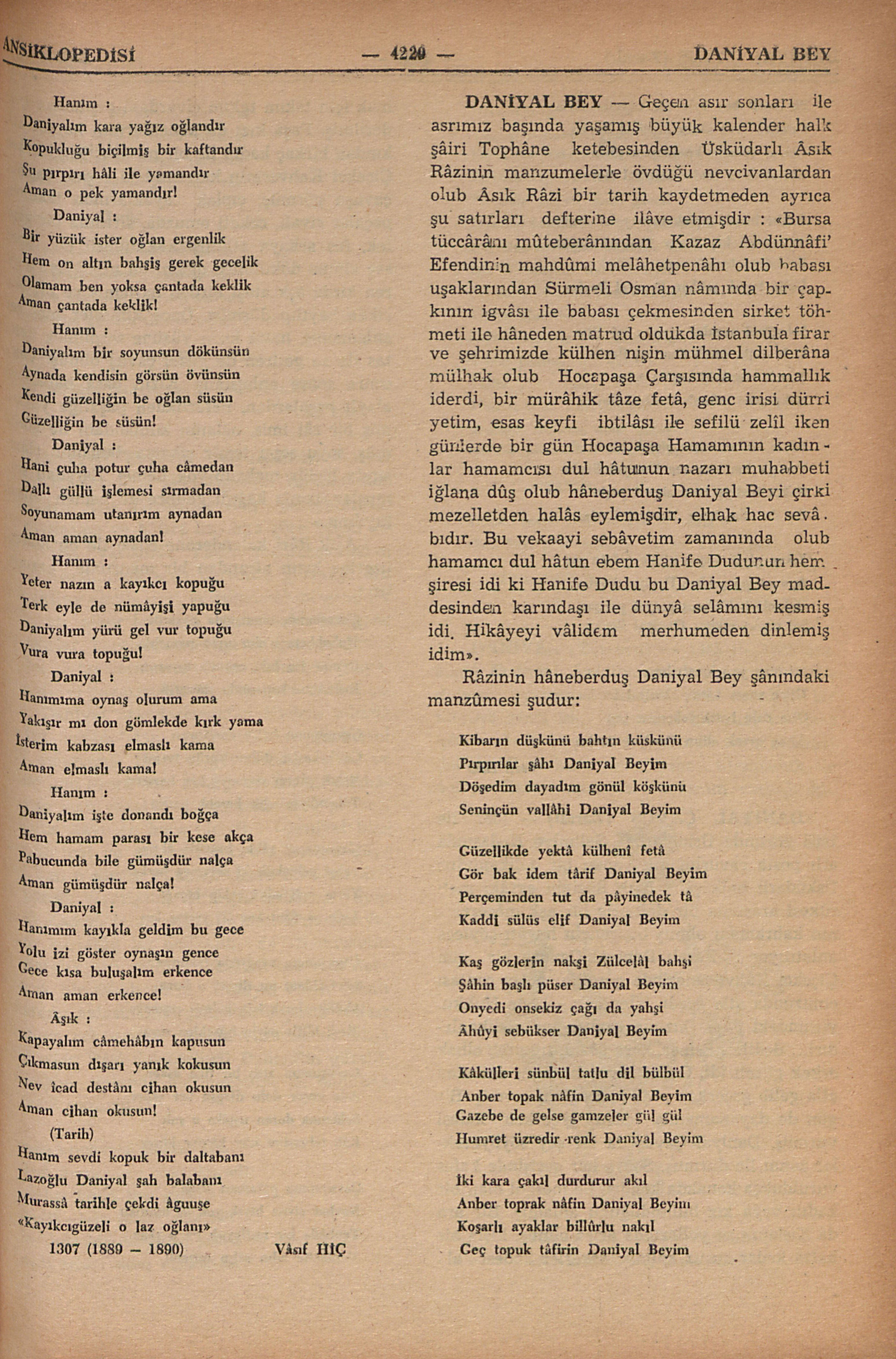 1885 ile 1895 arasında Üsküdar Balaban İskelesi kayıkçılarından pırpırı bir laz uşağı olub gaayetle dilber bir delikanlı idi; Üsgüdarlı halk şâiri Tophâne ketebesinden Aşık Râzi’nin evrâkı metrûkesi arasındaki defterlerden birinde bu genç için şunlar yazılıdır: “Zuhurunda 18-20 yaşlarında idi, uzun boylu, kara yağız, pençeli bir bıçkın oğlan idi. Ne zaman öğrenmiş, nerede ve kimden öğrenmiş bilinmez, gaayetle güzel satranç oynardı. Hem yüz ve vücut yapısı güzelliği hem de usta bir satranç oyuncusu olarak Üsküdarda öylesine bir şöhret sâhibi oldu ki, beyler paşalar Balaban iskelesindeki Hamlacılar Kahvehânesine Kayıkçı Daniyel ile satranç oynamaya gelirlerdi. Oğlanın kayığı saatlerce iskelede bağlı kalır, oyunlar derin sessizlik içinde merak ve dikkatle tâkib edilir, bir an gelir oğlanın laz ağzı ile: — Şah dedum sana daa paşababacuğum, bey babacuğum!.. diye sesi duyulur ve karşı taraf Daniyalın bu ihtarı tâkib eden ikinci veya üçüncü hamlesinde mat olurdu. Zekî, hal hatır sayar, iki oyun yenerse, üçüncüde yenilirdi; o beyler paşalar da giderlerken: — Daniyal.. seni işinden ettim!.. diyerek kibarâne bir tavırla delikanlının avucuna bir kaç mecidiye, hattâ bir altın bırakırlardı ki o zamana göre çok büyük para, çok büyük bahşişdi. Yazın Çamlıcalarda, Libâdede, Göztepede, Erenköyünde, Boğaziçinde köşklere, yalılara dâvet edilir, gittiği o yerlerde kibar ve rical kâşânelerinde gece yatısına alakonulurdu. Toy oğlanlık zamanında, 17-18 yaşlarında bir zengin dul hanım bu güzel kayıkcıya gönül vermiş, İstanbulda emsâli pek çok görülmüş mâcerâlardandır, araya çöp çatan bir kılavuz kadın koymuş, altın kesesinin de ağzını açınca bir gece oğlanı Salacakda bulunan yalısına getirterek câmehâbına çekmiş, hattâ Daniyala evlenme teklifinde de bulunmuş ise de laz uşağı kabul etmemiş: — Sırrını fâş etmem, ama evlenmem, arada gelir giderim, hediyesini, altınını alırım, demiş. Bir Üsküdar İskelesi karşısındaki Kolluk Hamamının önünden geçiyordum, Kayıkçı Daniyal da hamamdan çıkıyordu, bir adam: — Saatler olsun Daniyal, bu gece hanımındasın galiba?.. dedi, oğlan da başı ile tasdik etti. O tabakadan gençler, arasında jigololuk ayıb sayılmaz, hattâ geçer akçe güzelliğe sâhib olma dolayısı ile övünülür, hanımının adını ifşâ etmek ise delikanlılığa yakışmayan bir kahbelik bilinir. Kayıkçı Daniyalı hamamdan çıkarken gördüğüm ve o gece hanımına misafir olacağını öğrendiğim gün, oğlanın şânında bir destan yazmış idim; bir sûretini posta ile Balaban İskelesine Hamlacılar Kahvehânesi adresi ile Daniyala gönderdim, câhil genç hoşnud mu oldu, kızdı mı bilemem. Oğlan kurraası çıkdığında bahriye askeri oldu idi. Bütün emsâli gençler gibi tulumbacılık da yapmışdır. Üsküdar Dâire Sandığı uşaklarındandı; o sandığın bir grub resmi arasında o da görülür, zan ederim ki güzel delikanlının tek resmidir.” DESTAN Hanım : Bir kayıkcı sevdim bedel cihâne Görmek için hergün bulsam behâne Kayıkcılar içinde o bir dâne Daniyalım bir dâne! Daniyal: Ferâcesi limon küfü ak yaşmak Usul usul gerek ona yanaşmak Bin içinde bir yaratmış onu Hak Hanımımı aman Hak! Hanım : Kakülleri kara gözler kestâne Bıkçın oğlan bakışları mestâne Aşkı ile düşdüm türkü destâne Aman aman destâne! Daniyal: Hanımımı beklemeye alışdım Sâyesinde güzellere karışdım Küskün idim bahtım ile barışdım Aman aman barışdım! Hanım: Ayak yalın sîne uryan şehbazım Nazlanma da yalıya gel haylazım Câmehâba alsam sanki ne lâzım Aman aman ne lâzım! Daniyal: İşmarını çakdı hanım lazına Altın mısır serper bu aç kazına Gaflet ile uydum bıçkın nazına Aman bıçkın nazına! Hanım: Trabızon bezi gömlek donu ak Serde al fes ince belde al kuşak Adı güzel kendi güzel şu uşak Aman aman şu uşak! Daniyal: Hanımım al fes al kuşak don gömlek Hoşdur ama yalın ayak civelek Hani altın saatim altın köstek Altın saatle köstek! Hanım : Daniyalım kara yağız oğlandır Kopukluğu biçilmiş bir kaftandır Şu pırpırı hâli ile yamandır Aman o pek yamandır! Daniyal : Bir yüzük ister oğlan ergenlik Hem on altın bahşiş gerek gecelik Olamam ben yoksa çantada keklik Aman çantada keklik! Hanım : Daniyalım bir soyunsun dökünsün Aynada kendisin görsün övünsün Kendi güzelliği be oğlan süsün Güzelliğin be süsün! Daniyal : Hani çuha potur çuha câmedan Dallı güllü işlemesi sırmadan Soyunamam utanırım aynadan Aman aman aynadan! Hanım : Yeter nâzın a kayıkcı kopuğu Terk eyle de nümâyişi yapuğu Daniyalım yürü gel vur topuğu Vura vura topuğu! Daniyal : Hanımıma oynaş olurum ama Yakışır mı don gömlekde kırk yama İsterim kabzası elmaslı kama Aman elmaslı kama! Hanım : Daniyalım işte donandı boğça Hem hamam parası bir kese akça Pabucunda bile gümüşdür nalça Aman gümüşdür nalça! Daniyal : Hanımım kayıkla geldim bu gece Yolu izi göster oynaşın gence Gece kısa buluşalım erkence Aman aman erkence! Âşık : Kapayalım câmehâbın kapusun Çıkmasun dışarı yanık kokusun Nev îcad destânı cihan okusun Aman ciban okusun! (Tarih) Hanım sevdi kopuk bir daltabanı Lazoğlu Daniyal şah balabanı Murassâ tarihle çekdi âguuşe “Kayıkcıgüzeli o laz olanı” 1307 (1889 – 1890) Vâsıf HİÇ