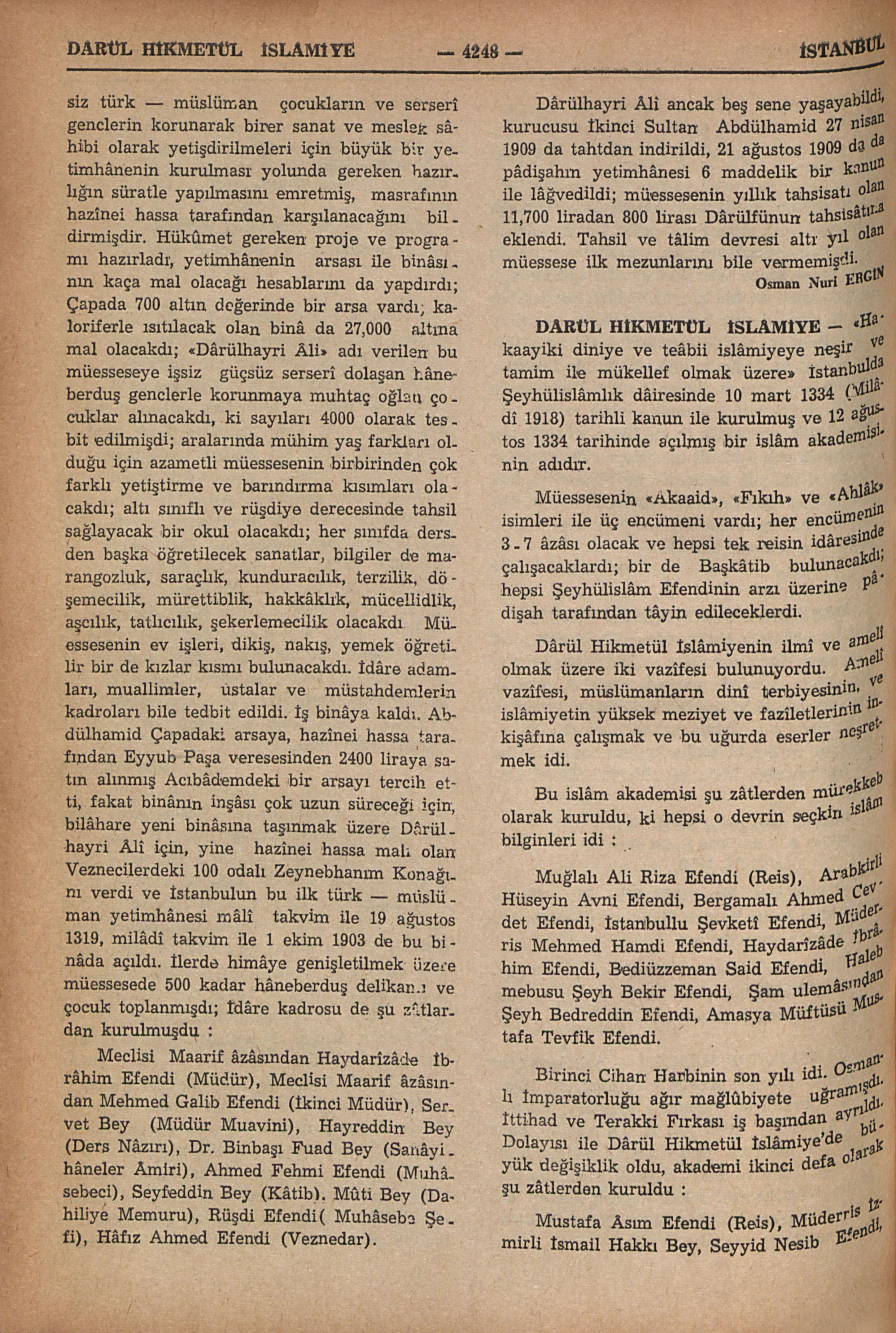 Veznecilerde meşhur “Zeynebhamım Konağı” nda (B.: Zeynebhanım Konağı) İkinci Sultan Abdülhamidin son yıllarında İstanbuldaki kimsesiz türk — müslüman çocukları himâye ederek sefâletten kurtarmak, bir meslek ve sanat sâhibi olarak yetişdirmek için kurulmuş ve ancak beş sene yaşamış bir dârüleytam, yetimhânedir. Doğrudan Sultan Abdülhamidin hayır eseridir; “Dârülhatır” adına “Alî” sıfatının eklenmesi de bu münâsebet iledir. Müessesenin kurulmasına 1899 yılında Yıldız Câmiinden bir cuma namazı dönmüşünde 6 yaşında kimsesiz bir oğlancığın pâdişaha verdiği bir dilekçe sebeb olmuşdu. Çocuk okuma yazma ve bir sanat öğrenmek için himâyesini istemişdi; Abdülhamidin şahsiyetini bilenler bu çocuğun derhal himâye altına alınmış olduğunu söylemekde tereddüd etmezler. Pâdişah bu vak’adan bir kaç gün sonra Bâbıâliye gönderdiği bir irâdei seniye ile, kimsesiz türk — müslüman çocukların ve serserî genclerin korunarak birer sanat ve meslek sâhibi olarak yetişdirilmeleri için büyük bir yetimhânenin kurulması yolunda gereken hazırlığın süratle yapılmasını emretmiş, masrafının hazînei hassa tarafından karşılanacağını bildirmişdir. Hükûmet gereken proje ve programı hazırladı, yetimhânenin arsası ile binâsının kaça mal olacağı hesablarını da yapdırdı; Çapada 700 altın değerinde bir arsa vardı, kaloriferle ısıtılacak olan binâ da 27,000 altına mal olacakdı; “Dârülhayri Âli” adı verilen bu müesseseye işsiz güçsüz serseri dolaşan hâneberduş genclerle korunmaya muhtaç oğlan çocuklar alınacakdı, ki sayıları 4000 olarak tesbit edilmişdi; aralarında mühim yaş farkları olduğu için azametli müessesenin birbirinden çok farklı yetiştirme ve barındırma kısımları olacakdı; altı sınıflı ve rüşdiye derecesinde tahsil sağlayacak bir okul olacakdı; her sınıfda dersden başka öğretilecek sanatlar, bilgiler de marangozluk, saraçlık, kunduracılık, terzilik, döşemecilik, mürettiblik, hakkâklık, mücellidlik, aşcılık, tatlıcılık, şekerlemecilik olacakdı. Müessesenin ev işleri, dikiş, nakış, yemek öğretilir bir de kızlar kısmı bulunacakdı. İdâre adamları, muallimler, ustalar ve müstahdemlerin kadroları bile tedbit edildi. İş binâya kaldı. Abdülhamid Çapadaki arsaya, hazînei hassa tarafından Eyyub Paşa veresesinden 2400 liraya satın alınmış Acıbâdemdeki bir arsayı tercih etti, fakat binânın inşâsı çok uzun süreceği için, bilâhare yeni binasına taşınmak üzere Dârülhayri Âlî için, yine hazînei hassa malı olan Veznecilerdeki 100 odalı Zeynebhanım Konağını verdi ve İstanbulun bu ilk türk — müslüman yetimhânesi mâlî takvim ile 19 ağustos 1319, milâdî takvim ile 1 ekim 1903 de bu binâda açıldı. İlerde himâye genişletilmek üzere müessesede 500 kadar hâneberduş delikanlı ve çocuk toplanmışdı; İdâre kadrosu de şu zâtlardan kurulmuşdu :