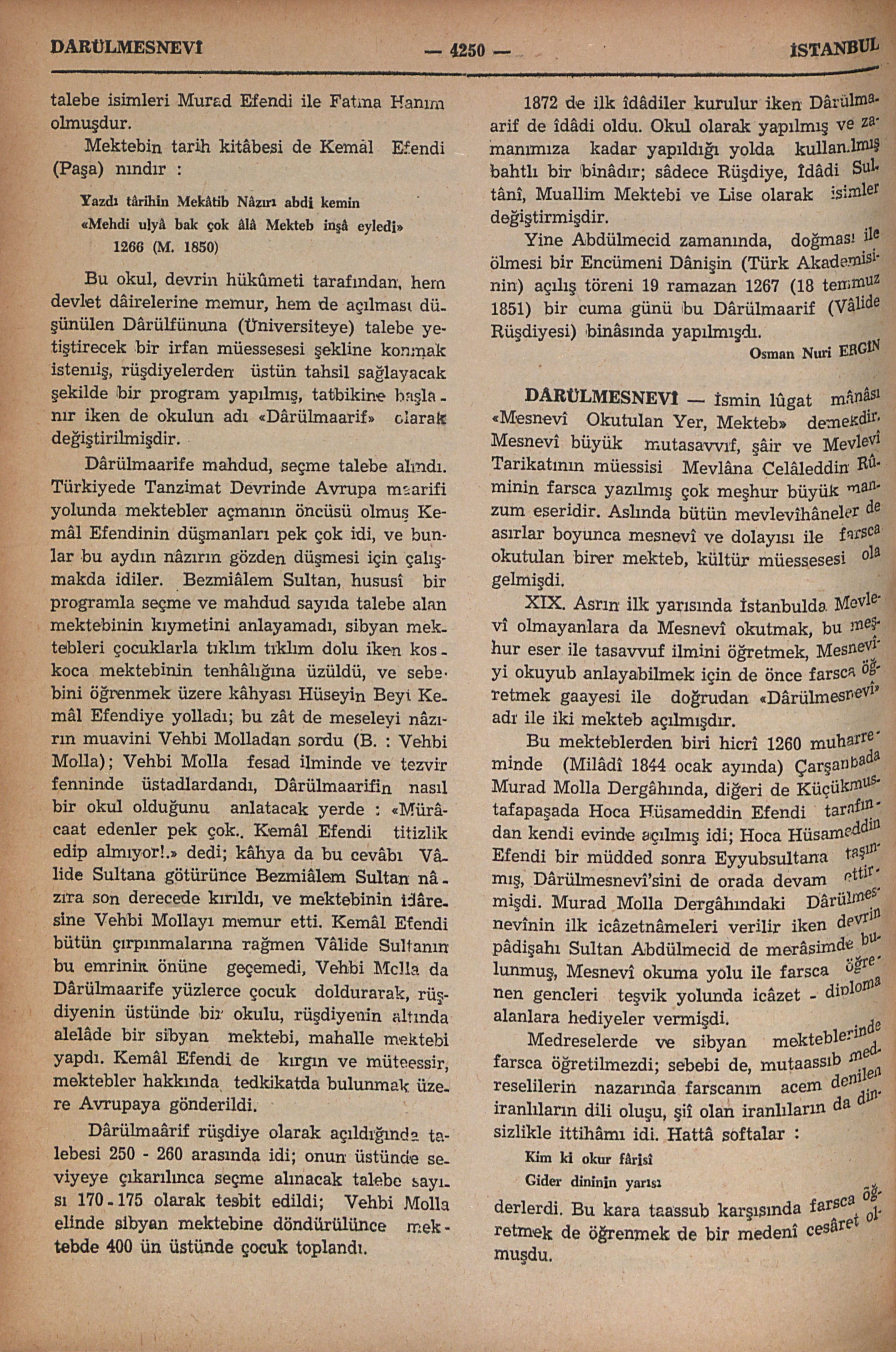 XIX. Asrın ilk yarısında İstanbulda Mevlevî olmayanlara da Mesnevî okutmak, bu meşhur eser ile tasavvuf ilmini öğretmek, Mesnevîyi okuyub anlayabilmek için de önce farsca öğretmek gaayesi ile doğrudan “Dârülmesnevî” adı ile iki mekteb açılmışdır.