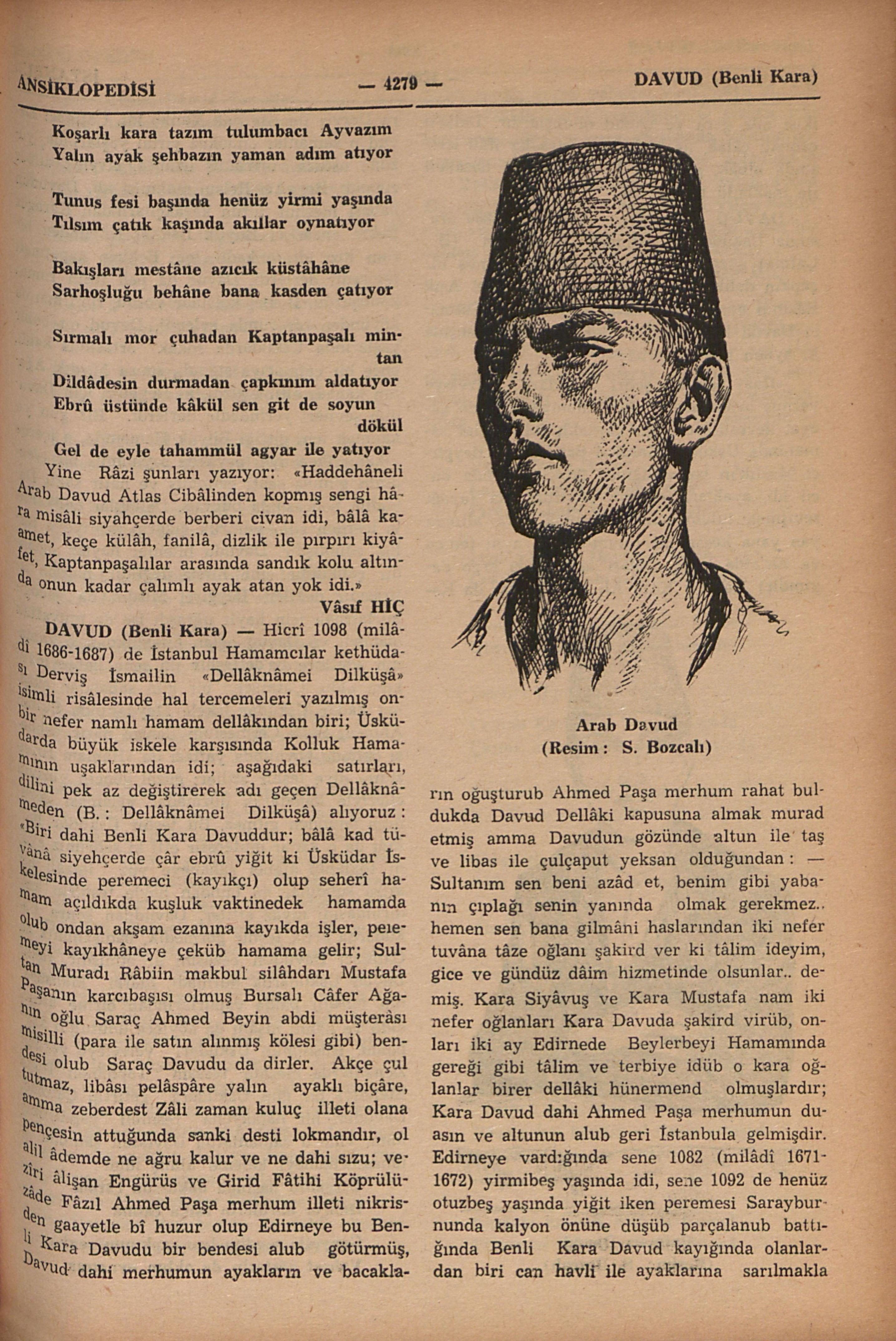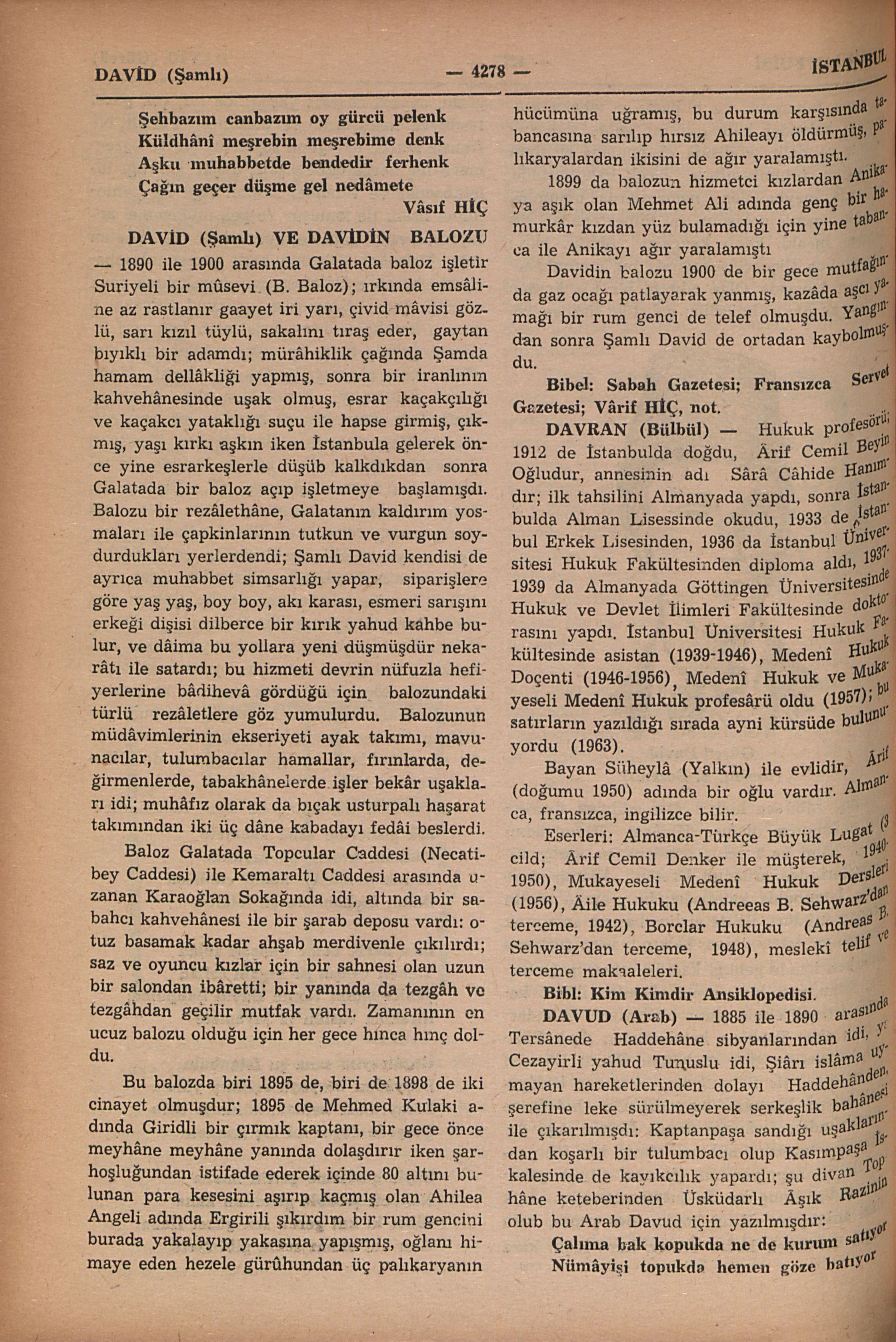 1885 ile 1890 arasında Tersânede Haddehâne sibyanlarından idi, ya Cezayirli yahud Tunuslu idi, Şiârı islâma uymayan hareketlerinden dolayı Haddehânden, şerefine leke sürülmeyerek serkeşlik bahânesi ile çıkarılmışdı: Kaptanpaşa sandığı uşaklarından koşarlı bir tulumbacı olup Kasımpaşa İskalesinde de kayıkcılık yapardı; şu divan Tophâne keteberinden Üsküdarlı Âşık Razinin olub bu Arab Davud için yazılmışdır: