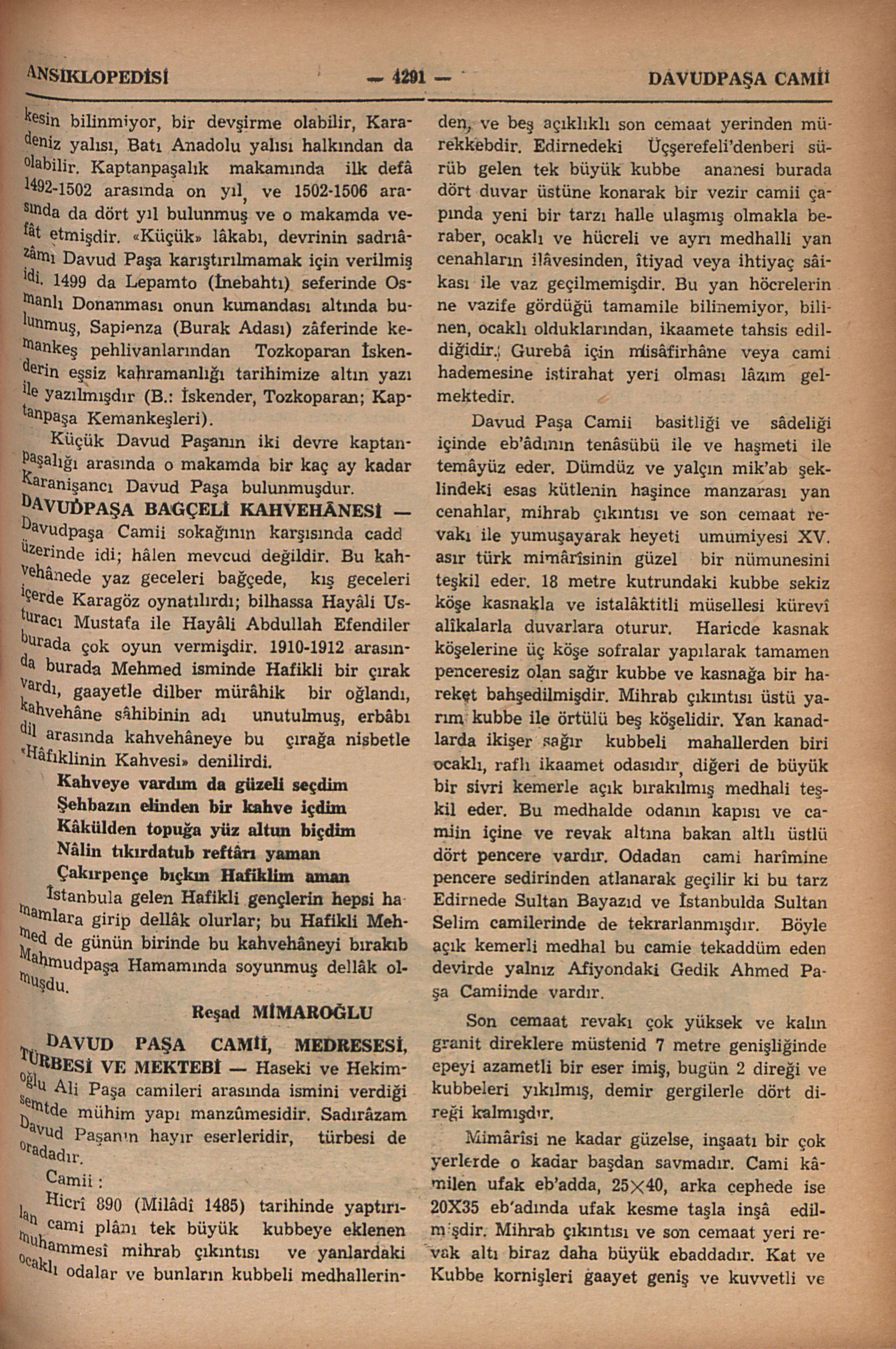Davudpaşa Camii sokağının karşısında cadd üzerinde idi; hâlen mevcud değildir. Bu kahvehânede yaz geceleri bağçede, kış geceleri içerde Karagöz oynatılırdı; bilhassa Hayâli Usturacı Mustafa ile Hayâli Abdullah Efendiler burada çok oyun vermişdir. 1910-1912 arasında burada Mehmed isminde Hafikli bir çırak vardı, gaayetle dilber mürâhik bir oğlandı, kahvehâne sâhibinin adı unutulmuş, erbâbı dil arasında kahvehâneye bu çırağa nisbetle “Hâfıklinin Kahvesi” denilirdi.