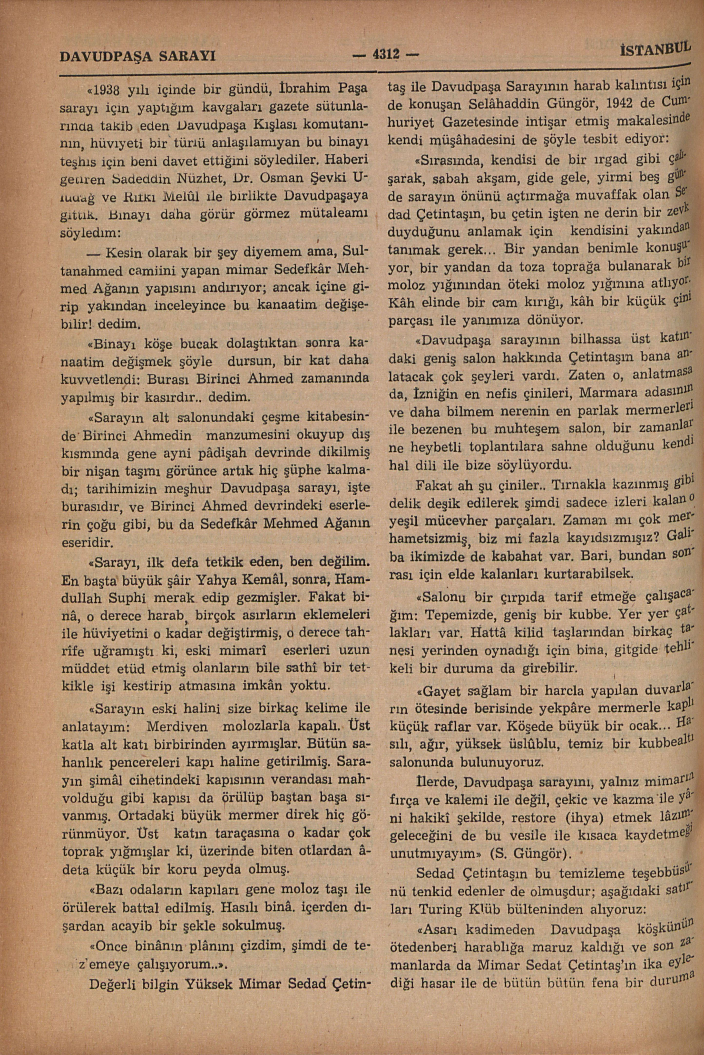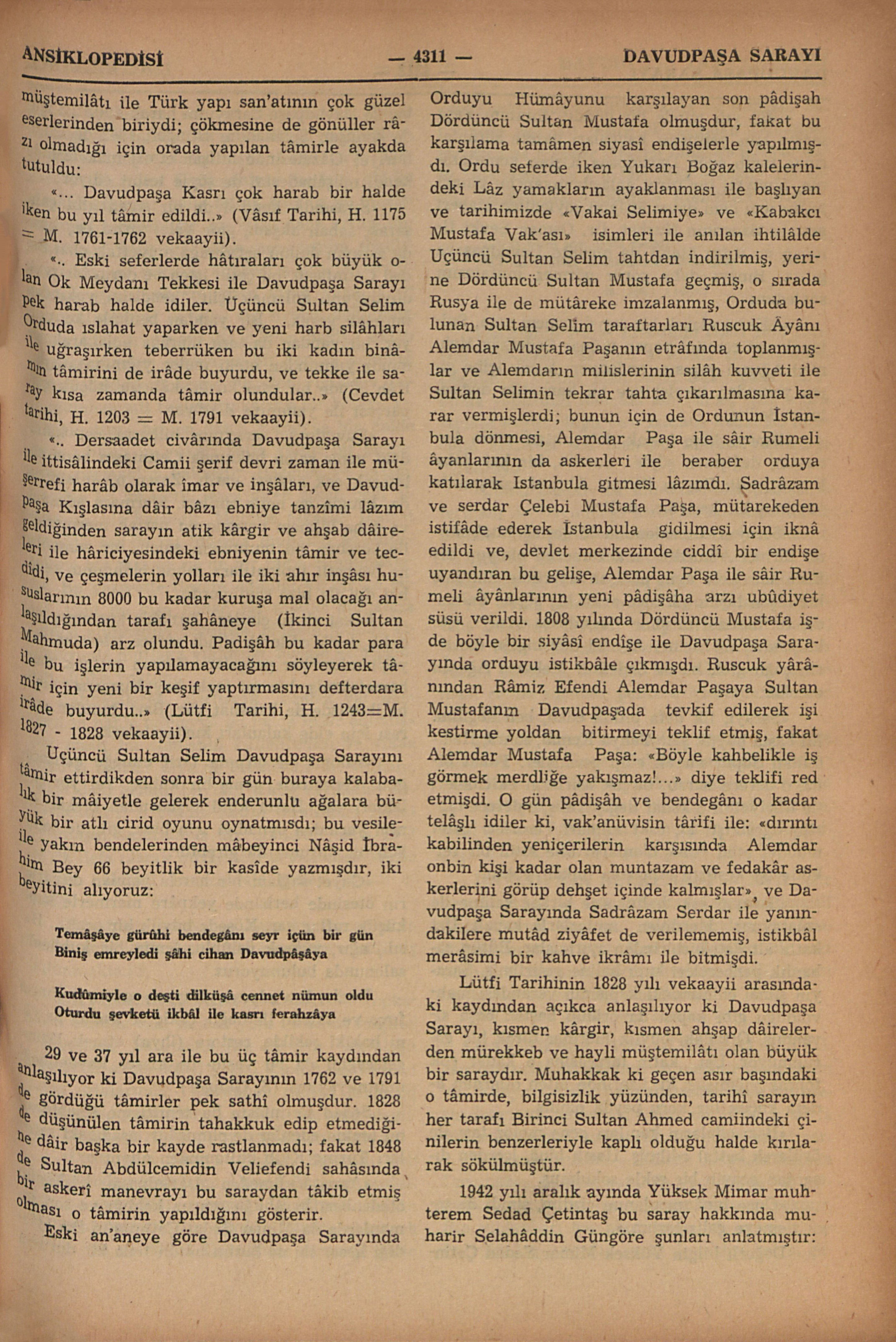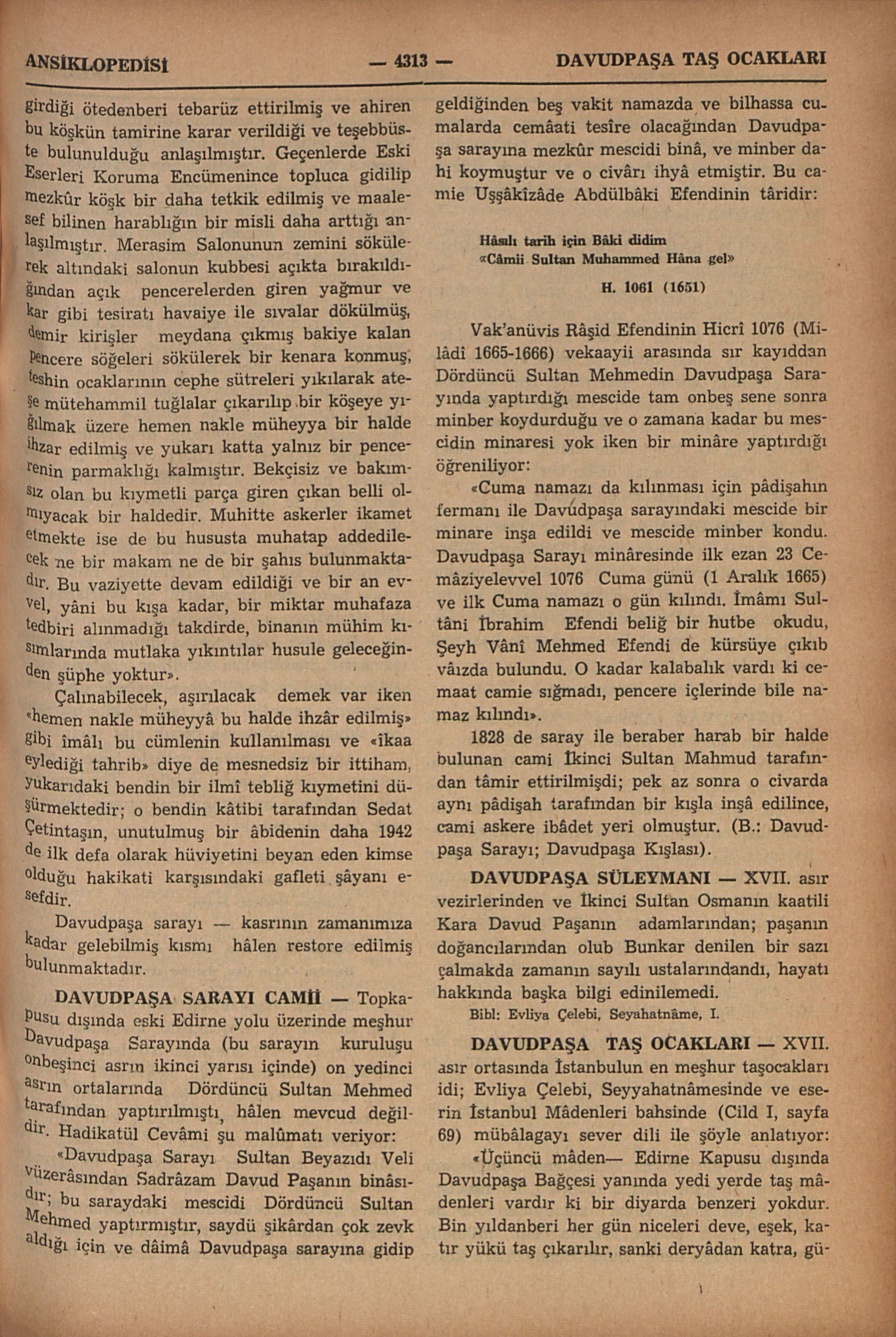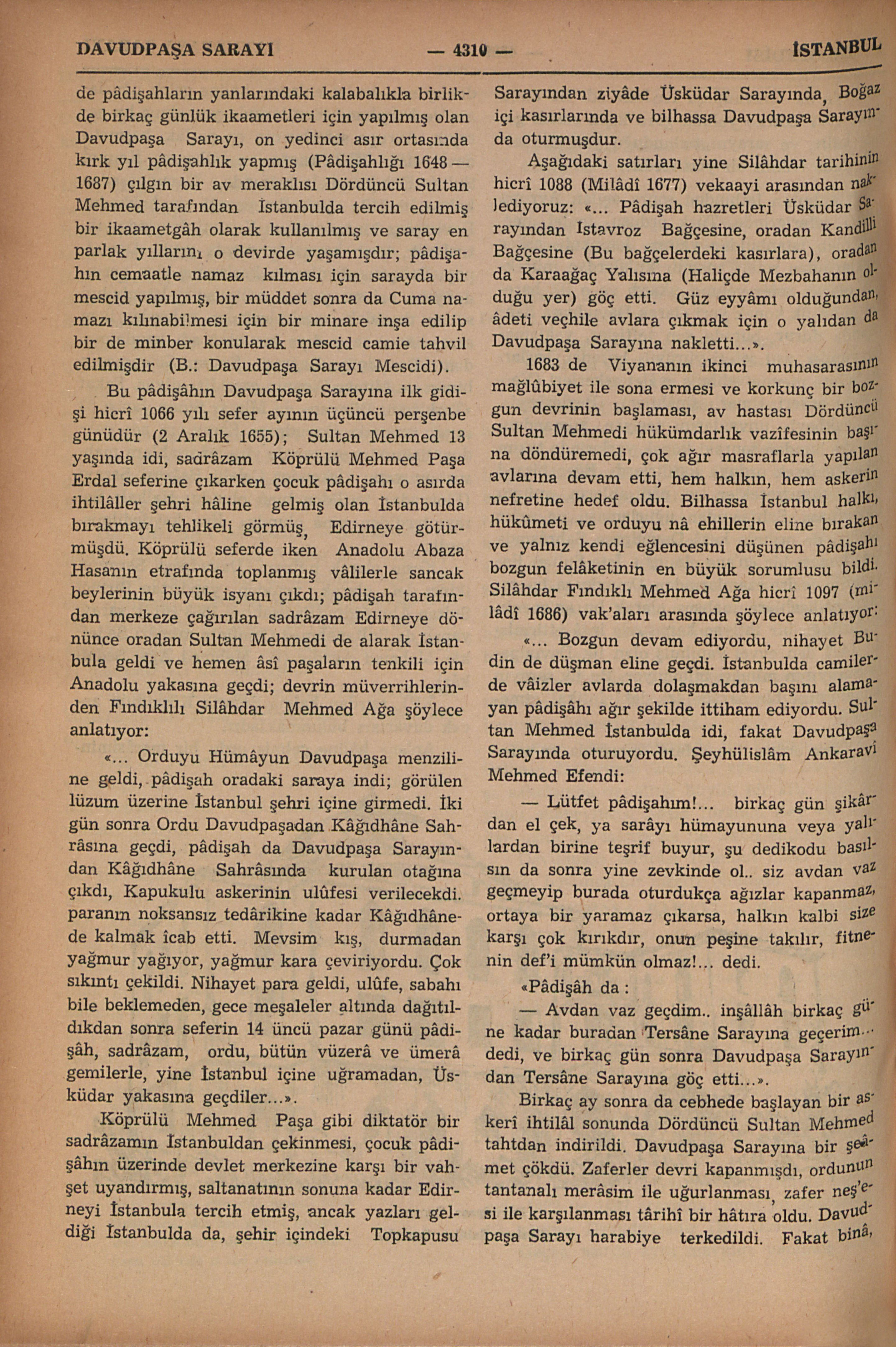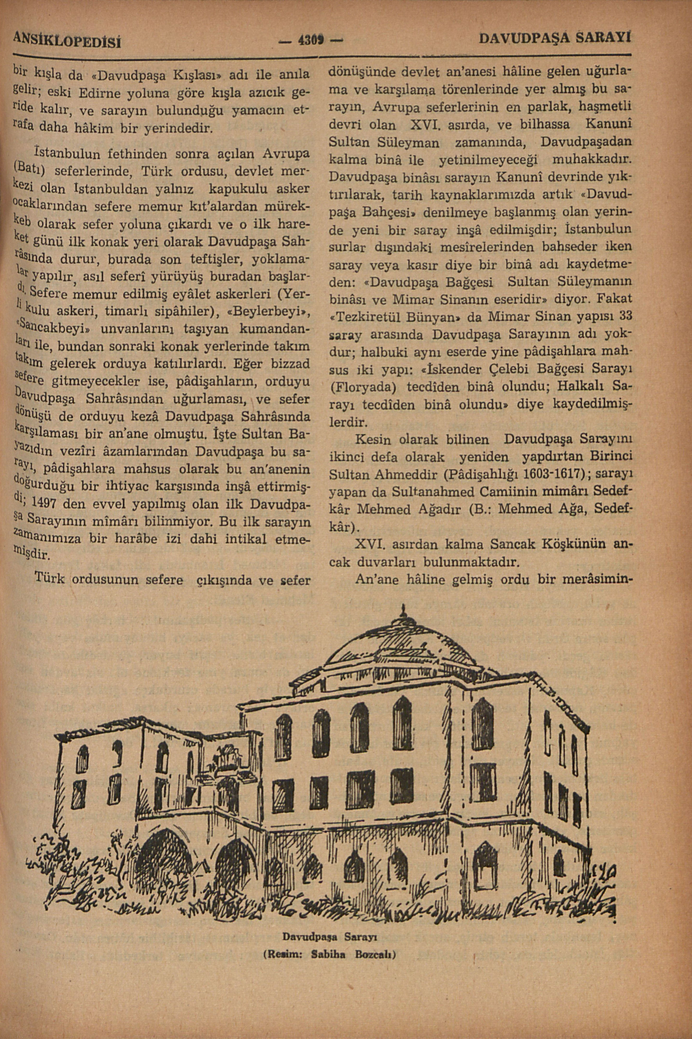 Bâzı metinlerde Davudpaşa Kasrı adı ile de kaydedilir; İstanbulun şehir sınırı dışında hem mimârî hem de hâtıraları mühim ve meşhur bir binâdır: Topkapu dışında eski Edirne yolu üzerinde kendi adına nisbetle Davudpaşa Sahrâsı diye anıla gelmiş mevkîde, Çırpıcı ve Haznedar dereleri arasındaki tepenin doğu yamacı üzerinde, bir yandan İstanbul surlarına, diğer yandan Bakırköyüne doğru uzanan geniş bir sâhaya hâkim bir noktadadır. Bu sarayın XV. asrın ikinci yarısında temelini atan, saraya ve kurulduğu sahrâya adını veren İkinci Sultan Bayazıda 1482 ile 1497 arasında onbeş yıl sadrâzamlık yapmış Davudpaşadır (B.: Davudpaşa). Geçen asırda aynı mevkîde yapılmış olan bir kışla da “Davudpaşa Kışlası” adı ile anıla gelir; eski Edirne yoluna göre kışla azıcık geride kalır, ve sarayın bulunduğu yamacın etrafa daha hâkim bir yerindedir. İstanbulun fethinden sonra açılan Avrupa (Batı) seferlerinde, Türk ordusu, devlet merkezi olan Istanbuldan yalnız kapukulu asker ocaklarından sefere memur kıt’alardan mürekkeb olarak sefer yoluna çıkardı ve o ilk hareket günü ilk konak yeri olarak Davudpaşa Sahrâsında durur, burada son teftişler, yoklamalar yapılır, asıl seferî yürüyüş buradan başlardı. Sefere memur edilmiş eyâlet askerleri (Yerli kulu askeri, timarlı sipâhiler), “Beylerbeyi”, “Sancakbeyi” un...