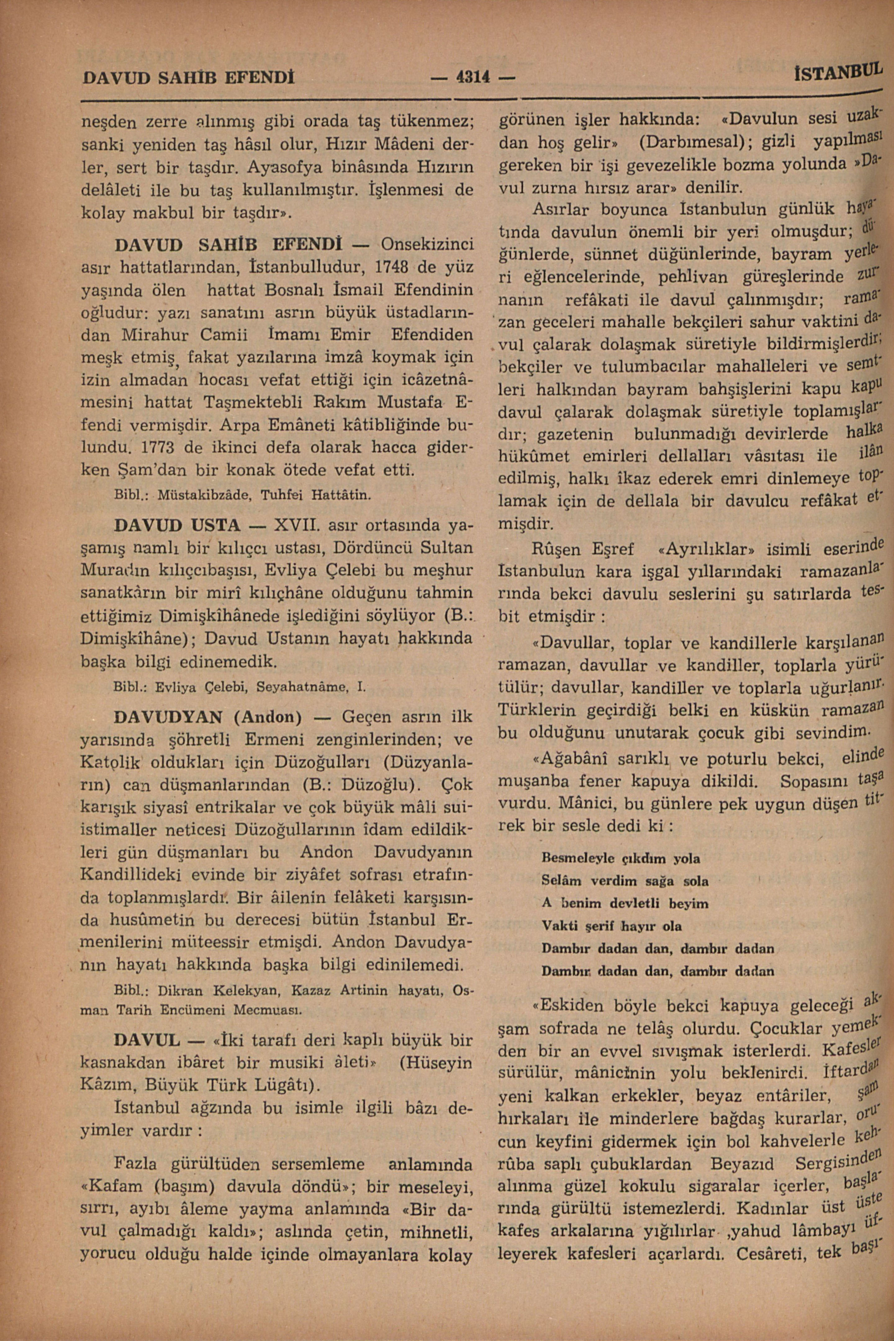 Asırlar boyunca İstanbulun günlük hayatında davulun önemli bir yeri olmuşdur; düğünlerde, sünnet düğünlerinde, bayram yerleri eğlencelerinde, pehlivan güreşlerinde zurnanın refâkati ile davul çalınmışdır; ramazan geceleri mahalle bekçileri sahur vaktini davul çalarak dolaşmak süretiyle bildirmişlerdir; bekçiler ve tulumbacılar mahalleleri ve semtleri halkından bayram bahşişlerini kapu kapu davul çalarak dolaşmak süretiyle toplamışlardır; gazetenin bulunmadığı devirlerde halka hükûmet emirleri dellalları vâsıtası ile ilân edilmiş, halkı îkaz ederek emri dinlemeye toplamak için de dellala bir davulcu refâkat etmişdir.