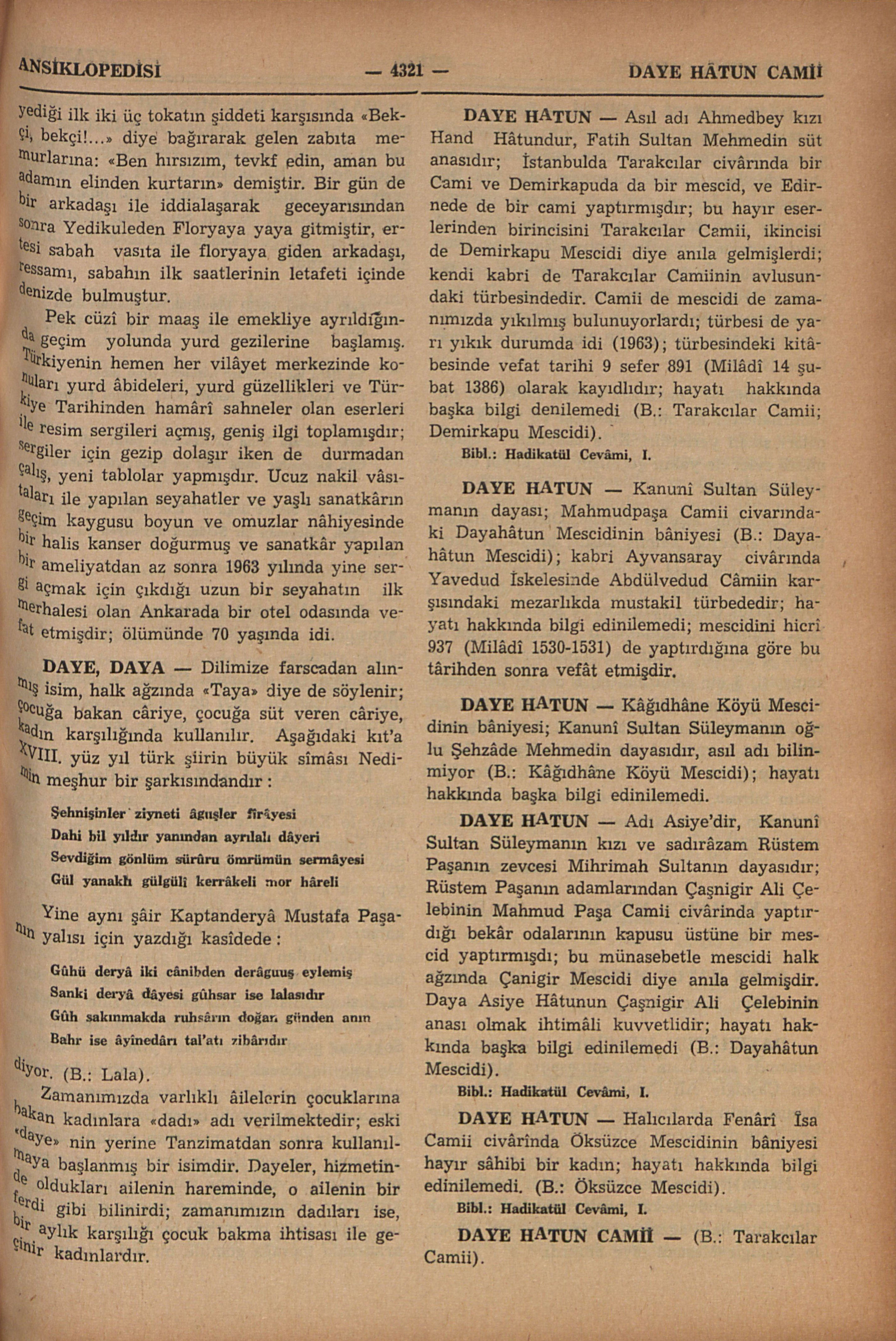 Zamanımızda varlıklı âilelerin çocuklarına bakan kadınlara “dadı” adı verilmektedir; eski “daye” nin yerine Tanzimatdan sonra kullanılmaya başlanmış bir ismidir. Dayeler, hizmetinde oldukları ailenin hareminde, o ailenin bir ferdi gibi bilinirdi; zamanımızın dadıları ise, bir aylık karşılığı çocuk bakma ihtisası ile geçinir kadınlardır.