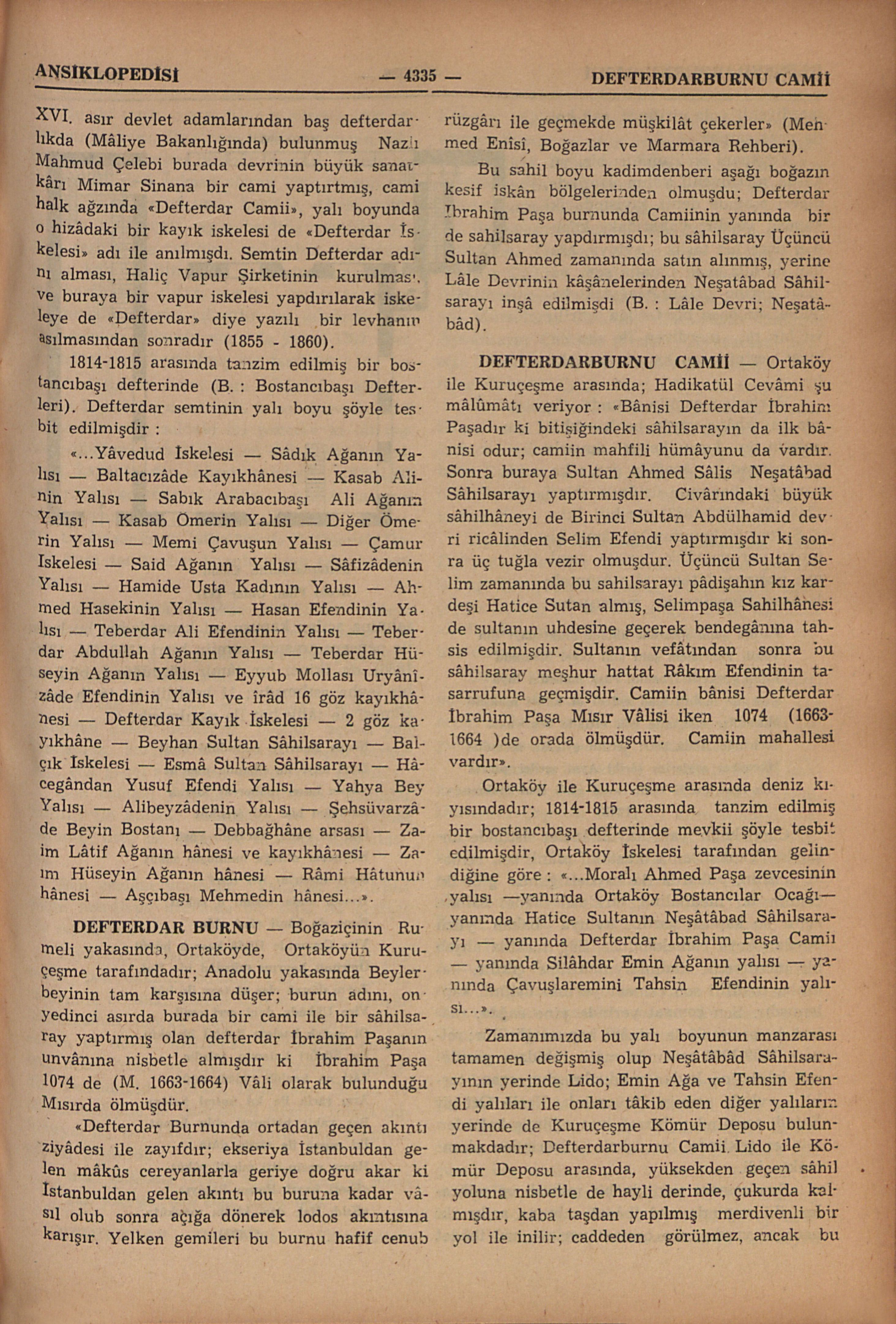Boğaziçinin Rumeli yakasında, Ortaköyde, Ortaköyün Kuruçeşme tarafındadır; Anadolu yakasında Beylerbeyinin tam karşısına düşer; burun adını, on yedinci asırda burada bir cami ile bir sâhilsaray yaptırmış olan defterdar İbrahim Paşanın unvânına nisbetle almışdır ki İbrahim Paşa 1074 de (M. 1663-1664) Vâli olarak bulunduğu Mısırda ölmüşdür. “Defterdar Burnunda ortadan geçen akıntı ziyâdesi ile zayıfdır; ekseriya İstanbuldan gelen mâkûs cereyanlarla geriye doğru akar ki İstanbuldan gelen akıntı bu buruna kadar vâsıl olub sonra açığa dönerek lodos akıntısına karışır. Yelken gemileri bu burnu hafif cenub rüzgârı ile geçmekde müşkilât çekerler” (Mehmed Enîsî, Boğazlar ve Marmara Rehberi). Bu sahil boyu kadimdenberi aşağı boğazın kesif iskân bölgelerinden olmuşdu; Defterdar İbrahim Paşa burnunda Camiinin yanında bir de sahilsaray yapdırmışdı; bu sâhilsaray Üçüncü Sultan Ahmed zamanında satın alınmış, yerine Lâle Devrinin kâşânelerinden Neşatâbad Sâhilsarayı inşâ edilmişdi (B. : Lale Devri; Neşatâbâd).