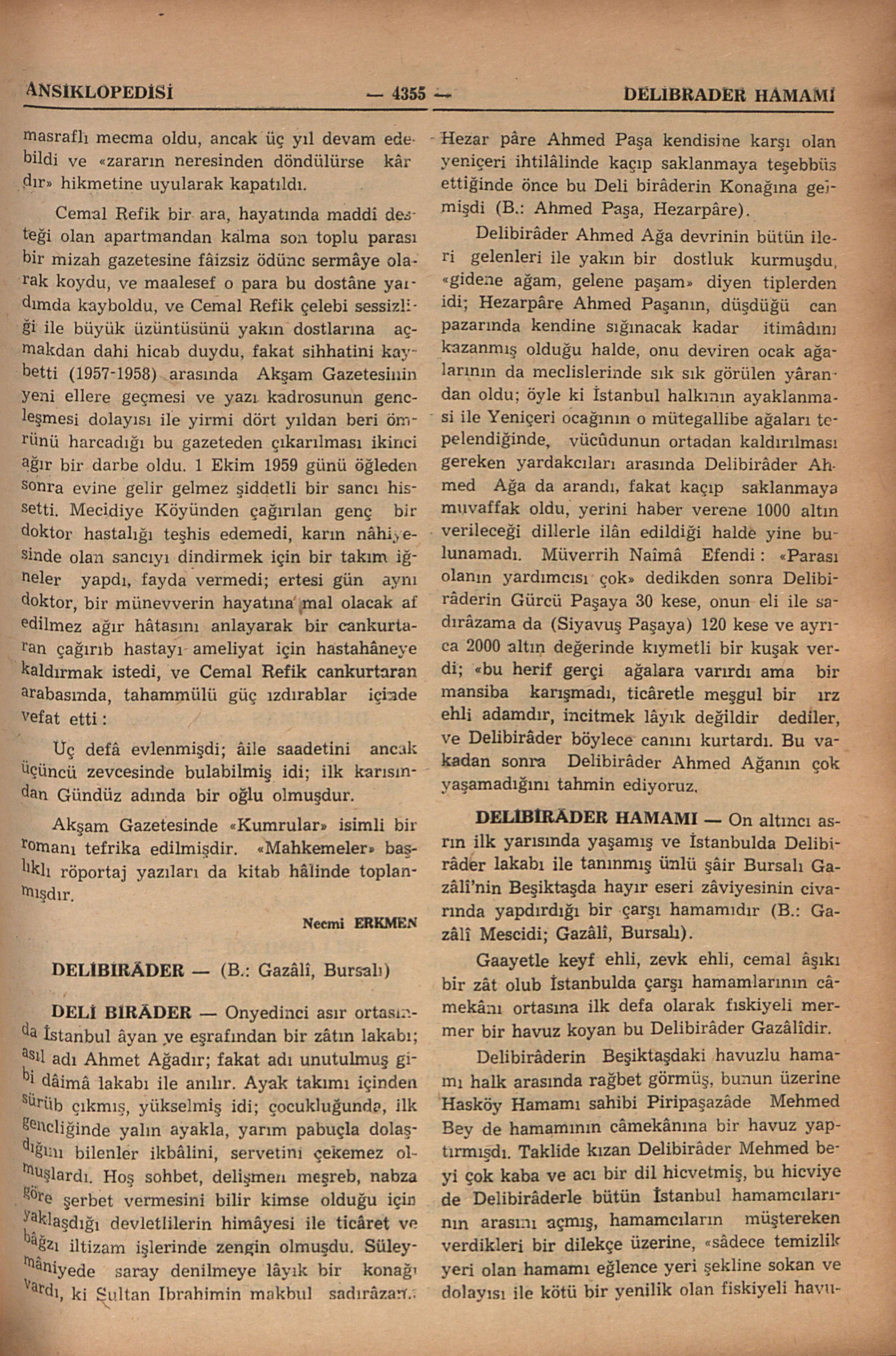 Delibirâder Ahmed Ağa devrinin bütün ileri gelenleri ile yakın bir dostluk kurmuşdu, “gidene ağam, gelene paşam” diyen tiplerden idi; Hezarpâre Ahmed Paşanın, düşdüğü can pazarında kendine sığınacak kadar itimâdını kazanmış olduğu halde, onu deviren ocak ağalarının da meclislerinde sık sık görülen yârandan oldu; öyle ki İstanbul halkının ayaklanması ile Yeniçeri ocağının o mütegallibe ağaları tepelendiğinde, vücûdunun ortadan kaldırılması gereken yardakcıları arasında Delibirâder Ahmed Ağa da arandı, fakat kaçıp saklanmaya muvaffak oldu, yerini haber...