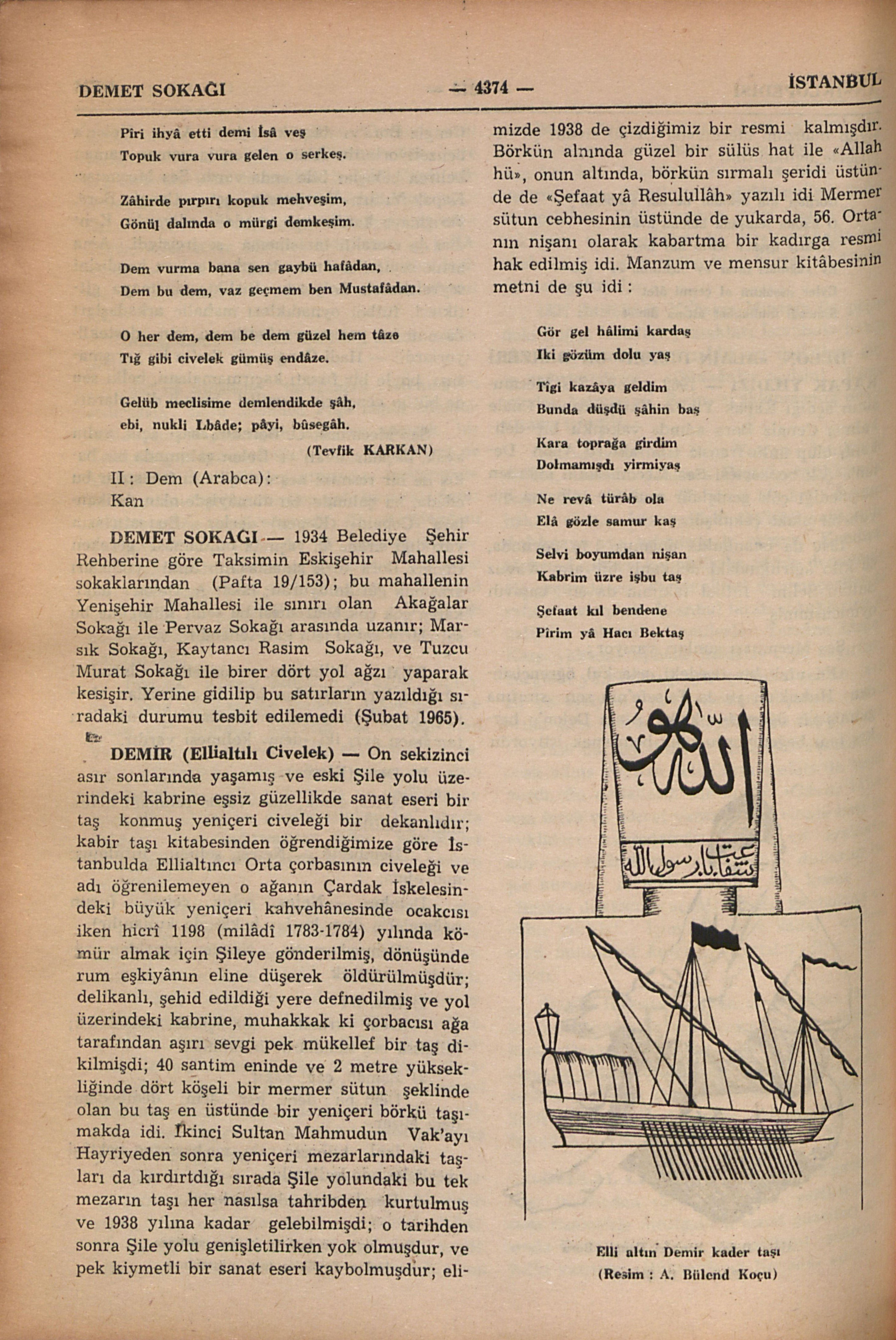 On sekizinci asır sonlarında yaşamış ve eski Şile yolu üzerindeki kabrine eşsiz güzellikde sanat eseri bir taş konmuş yeniçeri civeleği bir dekanlıdır; kabir taşı kitabesinden öğrendiğimize göre İstanbulda Ellialtıncı Orta çorbasının civeleği ve adı öğrenilemeyen o ağanın Çardak İskelesindeki büyük yeniçeri kahvehânesinde ocakcısı iken hicrî 1198 (milâdî 1783-1784) yılında kömür almak için Şileye gönderilmiş, dönüşünde rum eşkiyânın eline düşerek öldürülmüşdür; delikanlı, şehid edildiği yere defnedilmiş ve yol üzerindeki kabrine, muhakkak ki çorbacısı ağa tarafından aşırı sevgi pek mükellef bir taş dikilmişdi; 40 santim eninde ve 2 metre yüksekliğinde dört köşeli bir mermer sütun şeklinde olan bu taş en üstünde bir yeniçeri börkü taşımakda idi. İkinci Sultan Mahmudun Vak’ayı Hayriyeden sonra yeniçeri mezarlarındaki taşları da kırdırtdığı sırada Şile yolundaki bu tek mezarın taşı her nasılsa tahribden kurtulmuş ve 1938 yılına kadar gelebilmişdi; o tarihten sonra Şile yolu genişletilirken yok olmuşdur, ve pek kıymetli bir sanat eseri kaybolmuşdur; elimizde 1938 de çizdiğimiz bir resmi kalmışdır. Börkün alnında güzel bir sülüs hat ile “Allah hü”, onun altında, börkün sırmalı şeridi üstünde de “Şefaat yâ Resulullâh” yazılı idi Mermer sütun cebhesinin üstünde de yukarda, 56. Ortanın n...