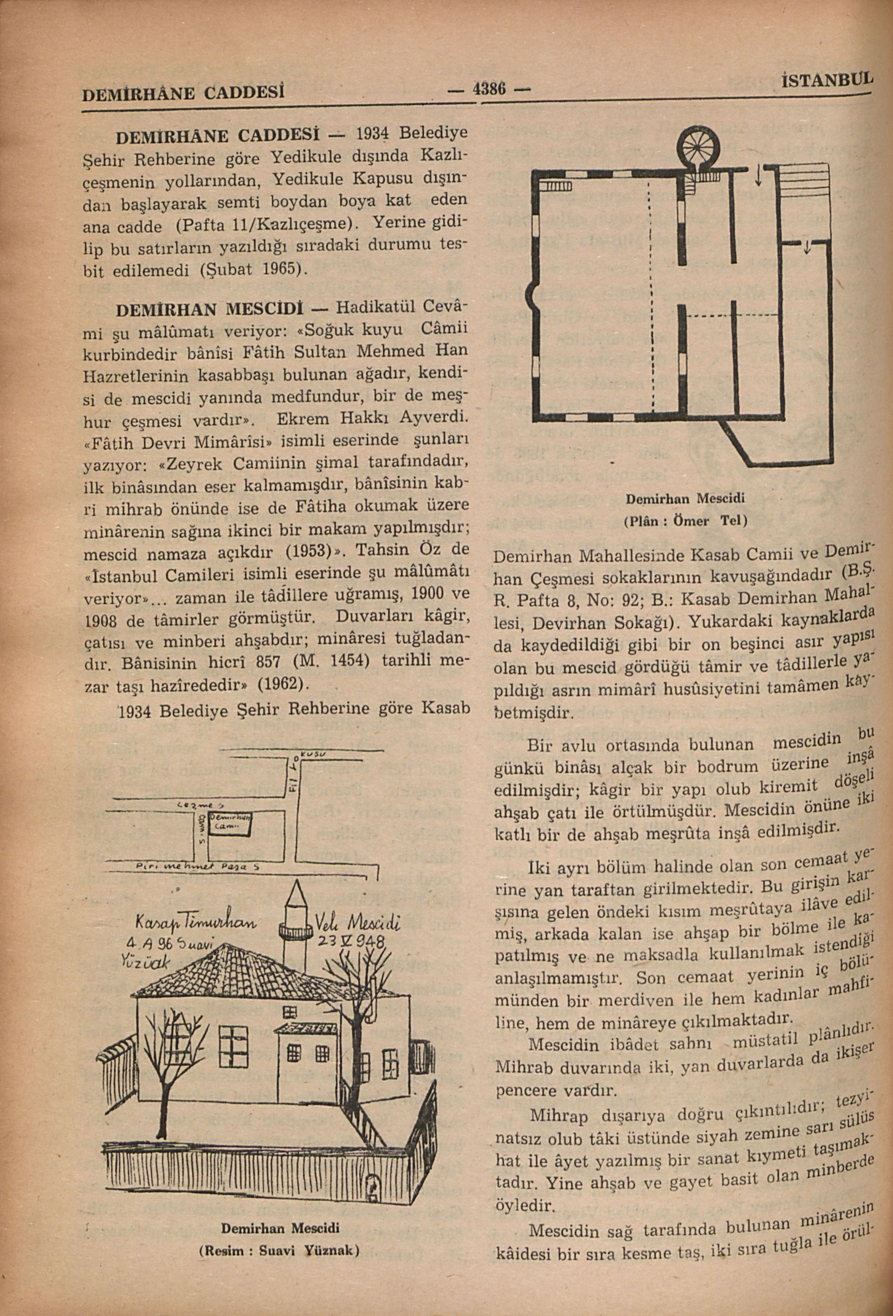 Hadikatül Cevâmi şu mâlûmatı veriyor: “Soğuk kuyu Câmii kurbindedir bânîsi Fâtih Sultan Mehmed Han Hazretlerinin kasabbaşı bulunan ağadır, kendisi de mescidi yanında medfundur, bir de meşhur çeşmesi vardır.” Ekrem Hakkı Ayverdi. “Fâtih Devri Mimârisi” isimli eserinde şunları yazıyor: “Zeyrek Camiinin şimal tarafındadır, ilk binâsından eser kalmamışdır, bânîsinin kabri mihrab önünde ise de Fâtiha okumak üzere minârenin sağına ikinci bir makam yapılmışdır; mescid namaza açıkdır (1953)”. Tahsin Öz de “İstanbul Camileri isimli eserinde şu mâlûmâtı veriyor”... zaman ile tâdillere uğramış, 1900 ve 1908 de tâmirler görmüştür. Duvarları kâgir, çatısı ve minberi ahşabdır; minâresi tuğladandır. Bânisinin hicrî 857 (M. 1454) tarihli mezar taşı hazîrededir” (1962). 1934 Belediye Şehir Rehberine göre Kasab Demirhan Mahallesinde Kasab Camii ve Demirhan Çeşmesi sokaklarının kavuşağındadır (B.Ş.R. Pafta 8, No: 92; B.: Kasab Demirhan Mahallesi, Devirhan Sokağı). Yukardaki kaynaklarda da kaydedildiği gibi bir on beşinci asır yapısı olan bu mescid gördüğü tâmir ve tâdillerle yapıldığı asrın mimârî husûsiyetini tamâmen kaybetmişdir. Bir avlu ortasında bulunan mescidin bu günkü binâsı alçak bir bodrum üzerine inşâ edilmişdir; kâgir bir yapı olub kiremit döşeli ahşab çatı ile örtülmüşdür. Mescidin önüne iki katlı bir de ahşab meşrûta inşâ edilmişdir. İki ayrı bölüm halinde olan son cemaat yerine yan taraftan girilmektedir. Bu girişin karşısına gelen öndeki kısım meşrûtaya ilâve edilmiş, arkada kalan ise ahşap bir bölme ile kapatılmış ve ne maksadla kullanılmak istendiği anlaşılmamıştır. Son cemaat yerinin iç bölümünden bir merdiven ile hem kadınlar mahfiline, hem de minâreye çıkılmaktadır. Mescidin ibâdet sahnı müstatil plânlıdır. Mihrab duvarında iki, yan duvarlarda da ikişer pencere vardır. Mihrap dışarıya doğru çıkıntılıdır; tezyinatsız olub tâki üstünde siyah zemine sarı sülüs hat ile âyet yazılmış bir sanat kıymeti taşımaktadır. Yine ahşab ve gayet basit olan minberde öyledir. Mescidin sağ tarafında bulunan minârenin kâidesi bir sıra kesme taş, iki sıra tuğla ile örülmek suretiyle yuvarlak şekilde inşa edilmiştir. Yuvarlak gövde ve petek ise tamamen tuğladan olup, şerefe korkulukları da adi demirdendir. Mescidin bânisi Demirhan’ın mezarı mihrabın arkasında olmasına rağmen 1454 (857) tarihli baş taşı ön cepheye, yoldan gelip geçenlerin fâtiha okumaları için dikilmiştir. Mezarın etrafı takriben 1 m. yüksekliğinde duvarlar çevrilidir ve üzerine kaplama olarak muhtelif yerlerden ne şekilde getirildiği anlaşılamıyan mezar taşları yerleştirilmiştir. Bu taşlar üzerinde 1217 tarihli Fatma hanımın, 1227 tarihli Emine hanımın ve 1244 tarihli Ayşe hanımın isimleri okunabilmektedir. 1966 yılı haziranında ziyaretimizde ibadete kapatılmış bulduğumuz mescit çok harap idi. Binanın muhtelif yerleri, minaresi çatlamış, çatısı çökme tehlikesi arzetmekte idi. Vakıflar Baş Müdürlüğünce tâmiri için keşif hazırlığı da bitmiş bulunuyordu. Erdem YÜCEL Demirhan Mescidi (Resim : Suavi Yüznak) Demirhan Mescidi (Plân : Ömer Tel)