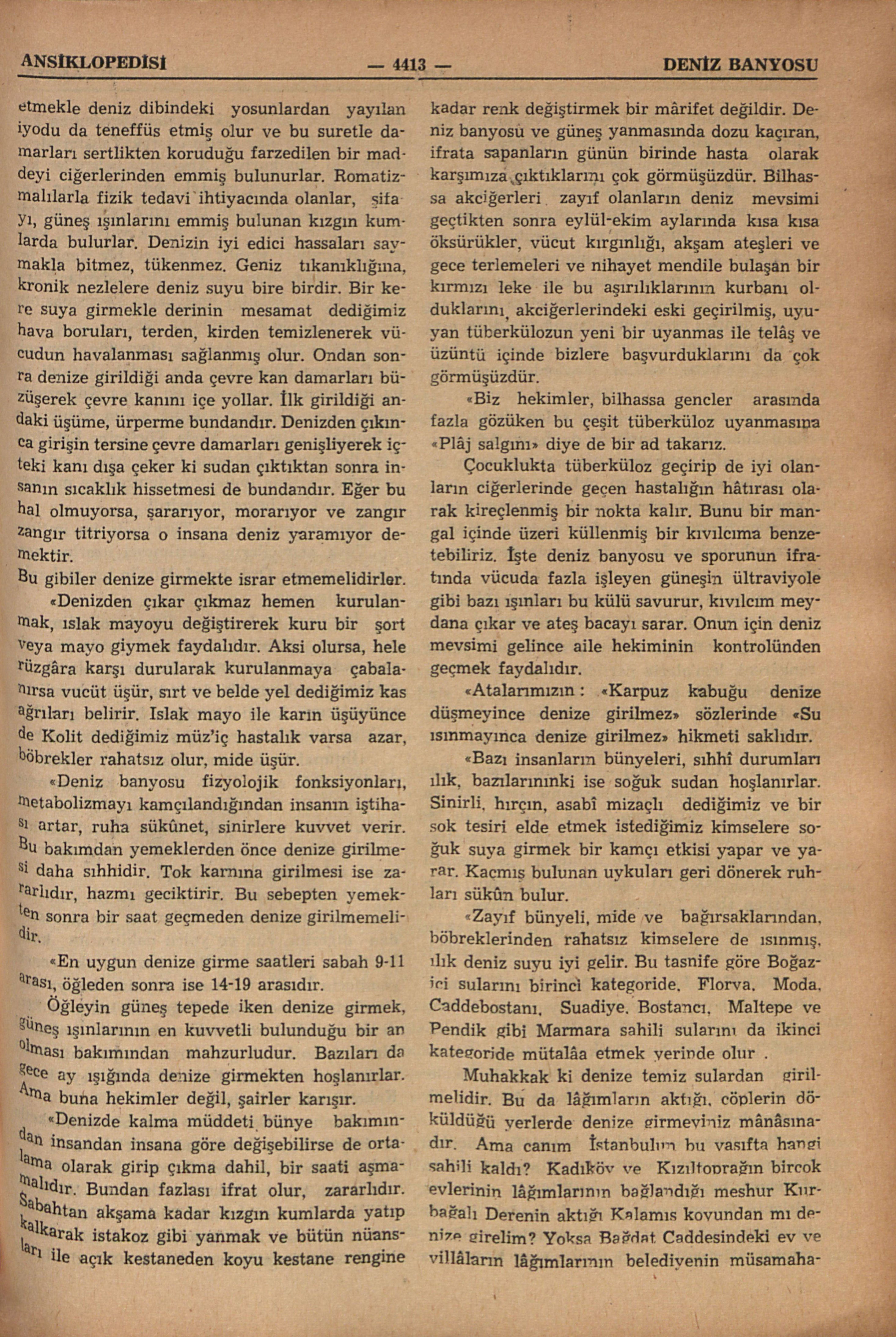 “Deniz banyosundan kasıt, yalnız suya girip çıkmak değil onun güneşinden de faydalanmaktır. Deniz suları ve sahil kumları, güneşin bir çok hayat verici ışınlarını emerler. Sonra bunları satıhlarından çevrelerine in’ikas suretiyle yayarlar. İşte denize giren insan, sağlığı bakımından bu ışınlardan da nasibini almış olur. Yaşlılar, denizin sathına yakın havayı teneffüs etmekle deniz dibindeki yosunlardan yayılan iyodu da teneffüs etmiş olur ve bu suretle damarları sertlikten koruduğu farzedilen bir maddeyi ciğerlerinden emmiş bulunurlar. Romatizmalılarla fizik tedavi ihtiyacında olanlar, şifayı, güneş ışınlarını emmiş bulunan kızgın kumlarda bulurlar. Denizin iyi edici hassaları saymakla bitmez, tükenmez. Geniz tıkanıklığına, kronik nezlelere deniz suyu bire birdir. Bir kere suya girmekle derinin mesamat dediğimiz hava boruları, terden, kirden temizlenerek vücudun havalanması sağlanmış olur. Ondan sonra denize girildiği anda çevre kan damarları büzüşerek çevre kanını içe yollar. İlk girildiği andaki üşüme, ürperme bundandır. Denizden çıkınca girişin tersine çevre damarları genişliyerek içteki kanı dışa çeker ki sudan çıktıktan sonra insanın sıcaklık hissetmesi de bundandır. Eğer bu hal olmuyorsa, sararıyor, morarıyor ve zangır zangır titriyorsa o insana deniz yaramıyor demektir.