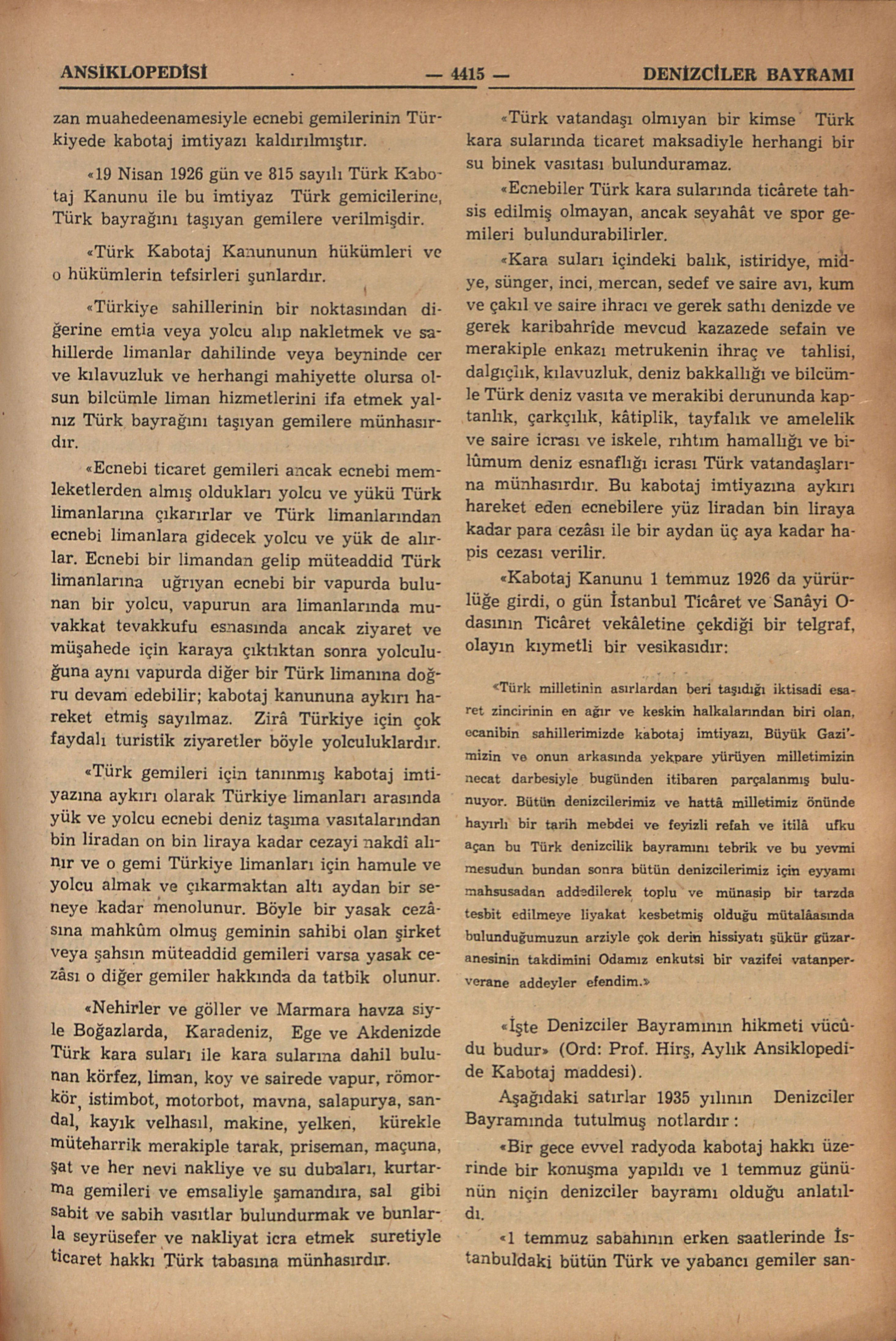 “İşte Denizciler Bayramının hikmeti vücûdu budur” (Ord: Prof. Hirş, Aylık Ansiklopedide Kabotaj maddesi).