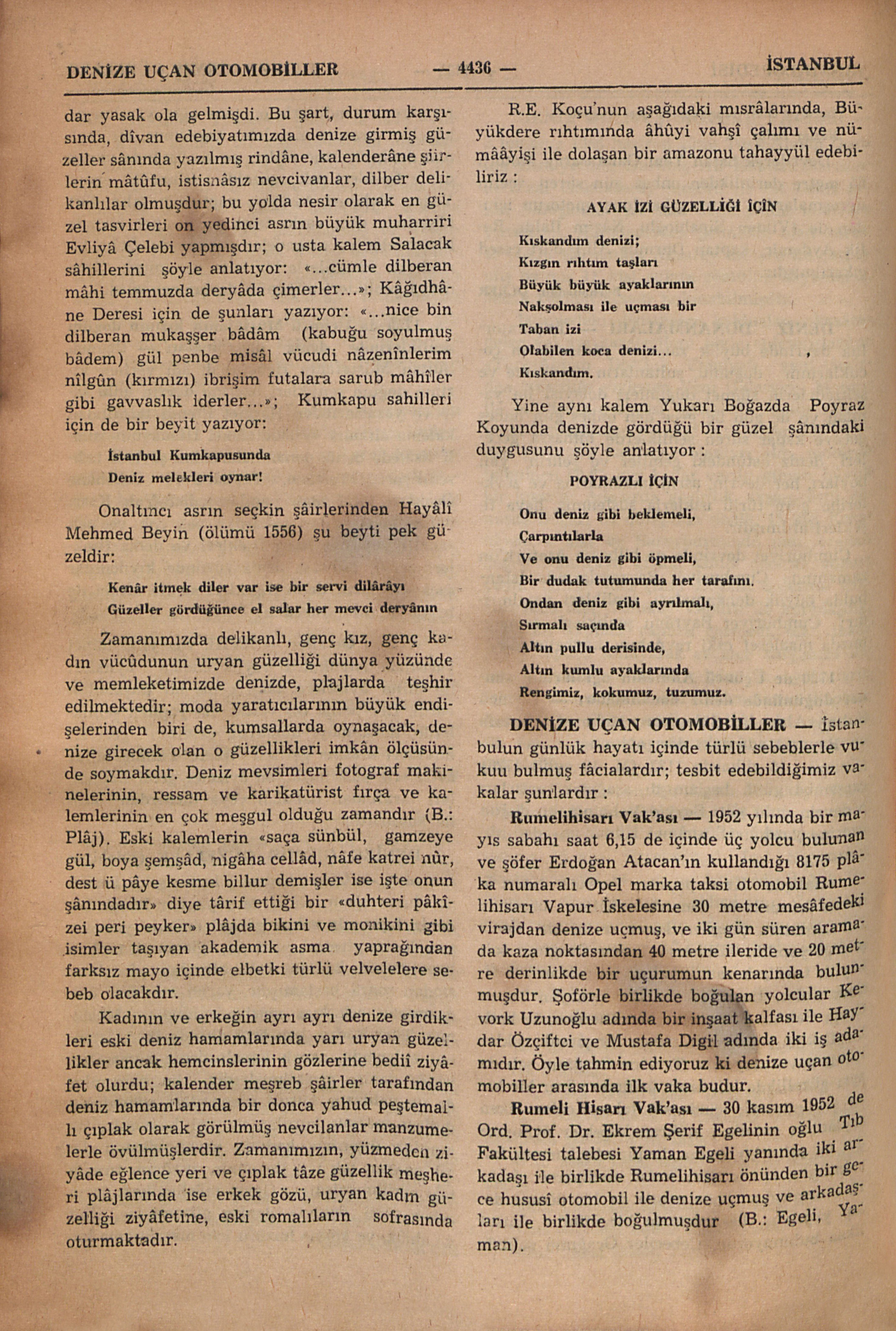 Rumelihisarı Vak’ası — 1952 yılında bir mayıs sabahı saat 6,15 de içinde üç yolcu bulunan ve şöfer Erdoğan Atacan’ın kullandığı 8175 plâka numaralı Opel marka taksi otomobil Rumelihisarı Vapur İskelesine 30 metre mesâfedeki virajdan denize uçmuş, ve iki gün süren aramada kaza noktasından 40 metre ileride ve 20 metre derinlikde bir uçurumun kenarında bulunmuşdur. Şoförle birlikde boğulan yolcular Kevork Uzunoğlu adında bir inşaat kalfası ile Haydar Özçiftci ve Mustafa Digil adında iki iş adamıdır. Öyle tahmin ediyoruz ki denize uçan otomobiller arasında ilk vaka budur.