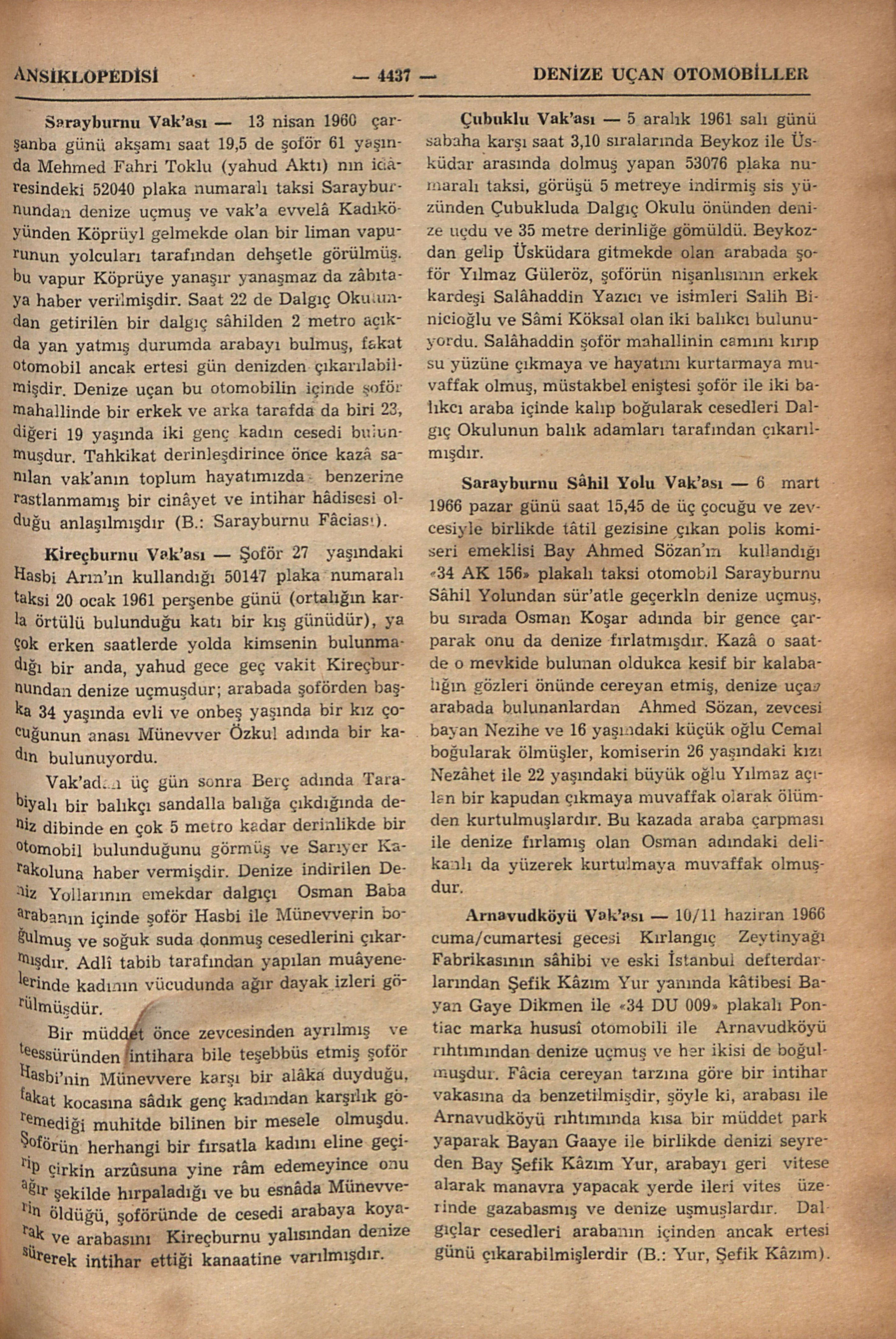 Sarayburnu Vak’ası — 13 nisan 1960 çarşanba günü akşamı saat 19,5 de şoför 61 yaşında Mehmed Fahri Toklu (yahud Aktı) nın idâresindeki 52040 plaka numaralı taksi Sarayburnundan denize uçmuş ve vak’a evvelâ Kadıköyünden Köprüyl gelmekde olan bir liman vapurunun yolcuları tarafından dehşetle görülmüş, bu vapur Köprüye yanaşır yanaşmaz ...