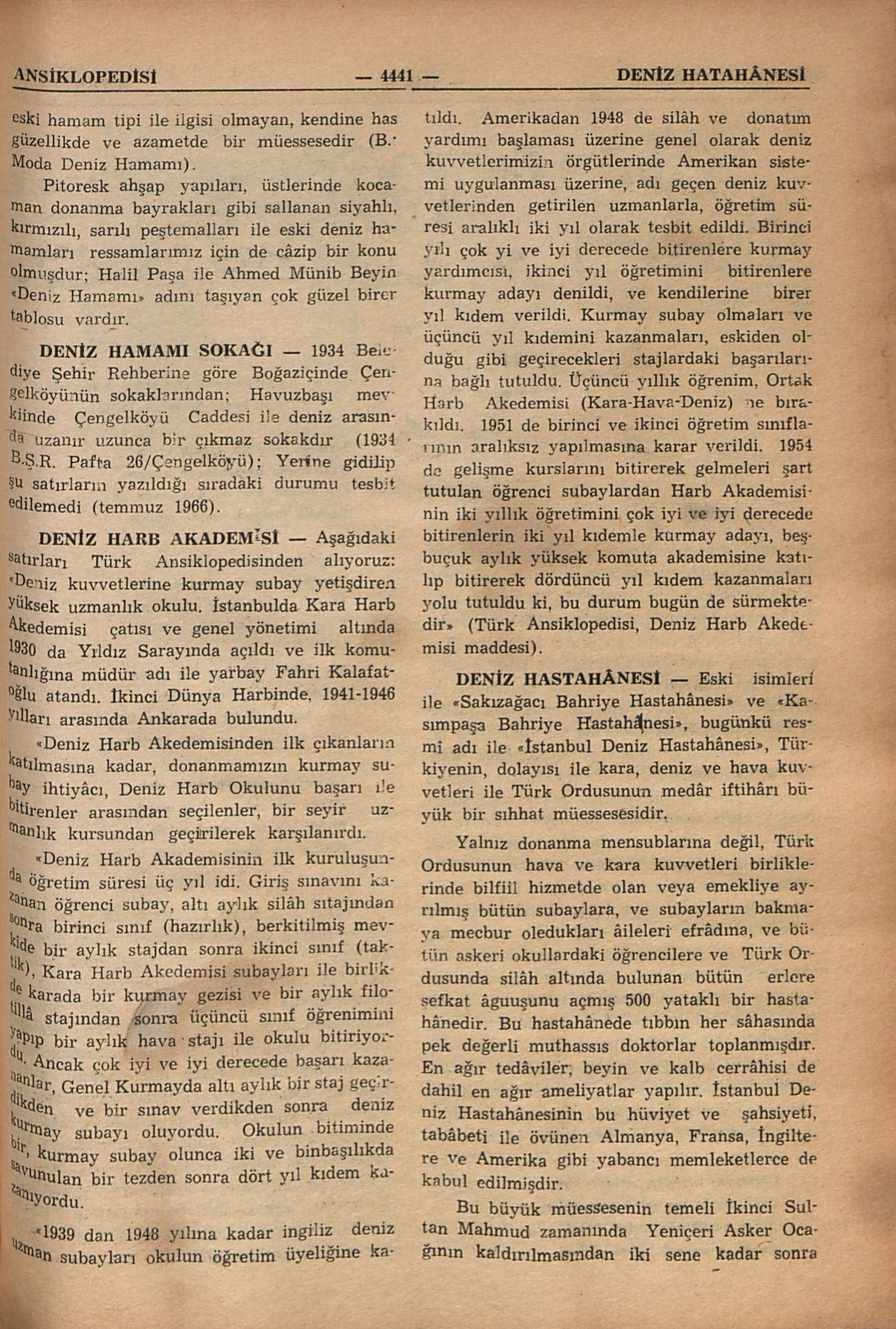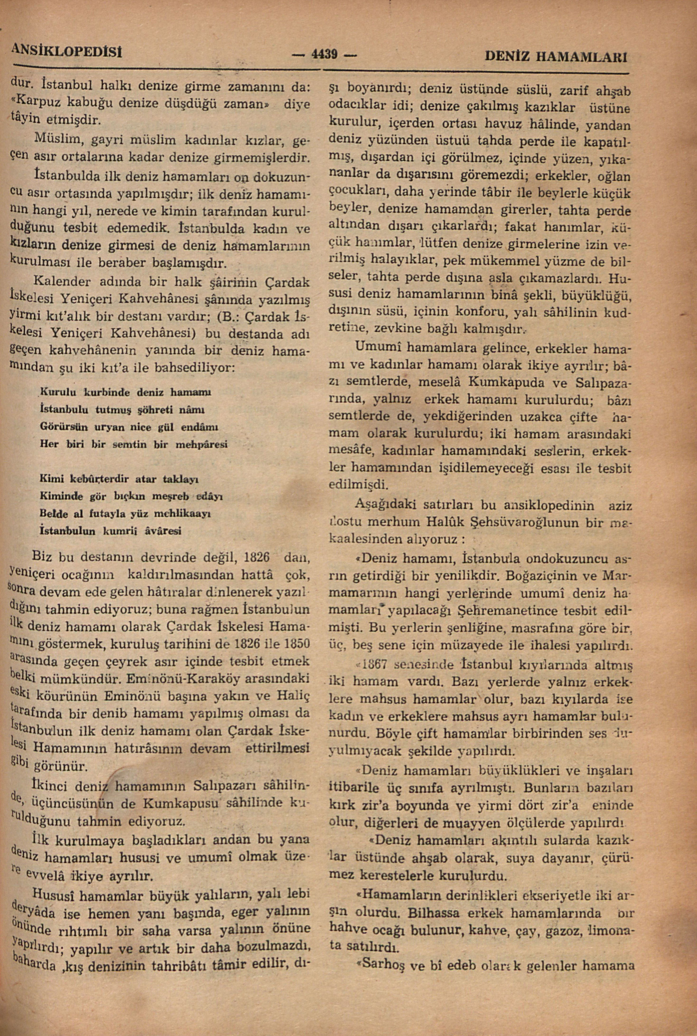 “Deniz hamamı, İstanbula ondokuzuncu asrın getirdiği bir yenilikdir. Boğaziçinin ve Marmamarının hangi yerlerinde umumî deniz hamamları yapılacağı Şehremanetince tesbit edilmişti. Bu yerlerin şenliğine, masrafına göre bir, üç, beş sene için müzayede ile ihalesi yapılırdı.