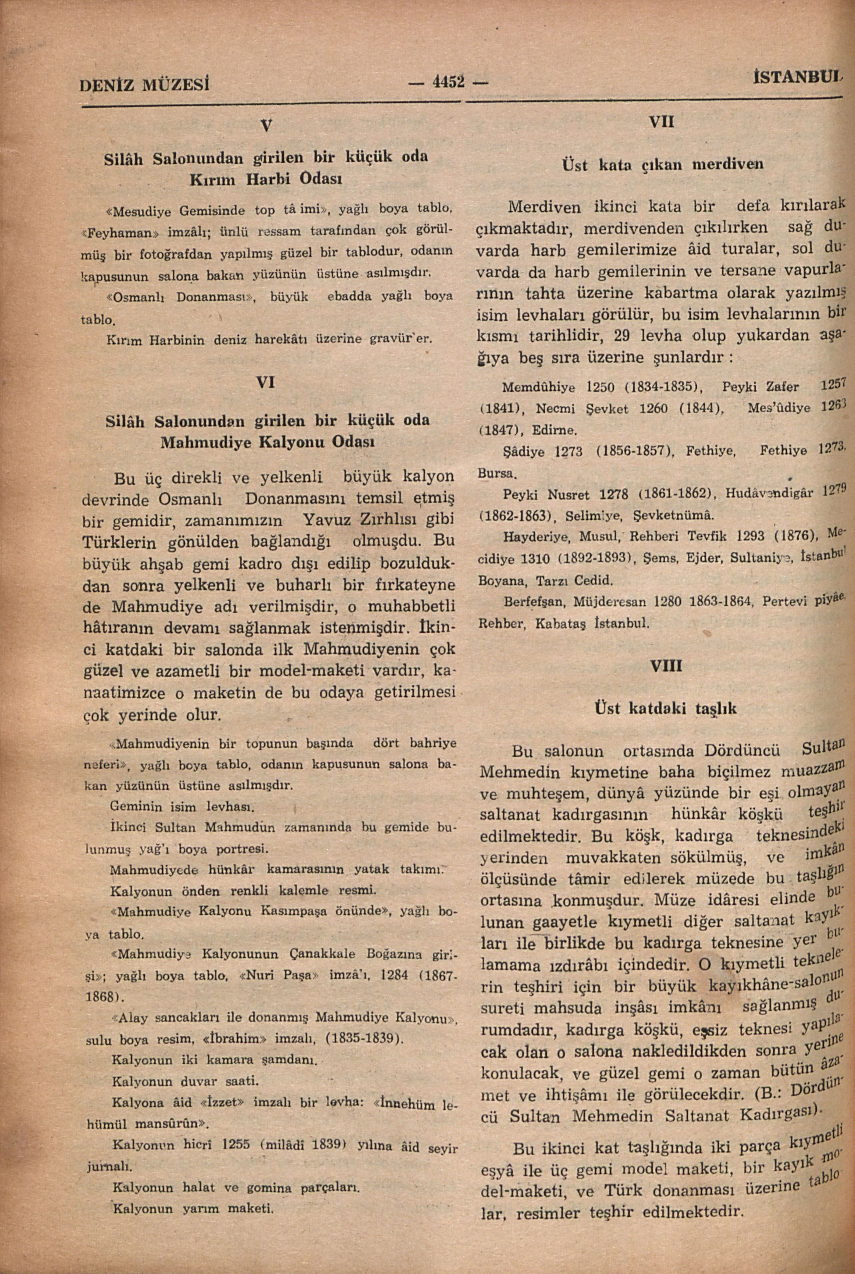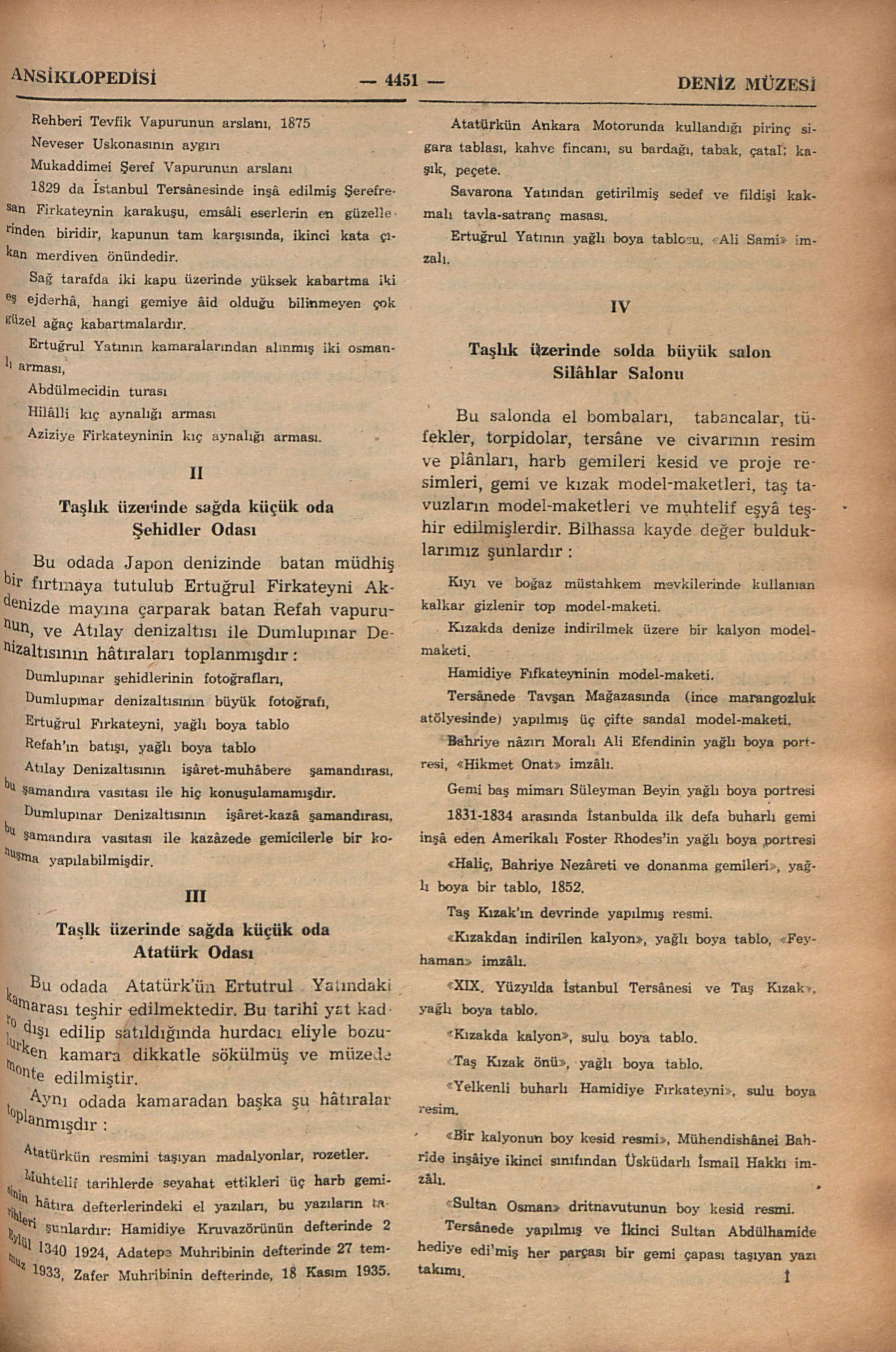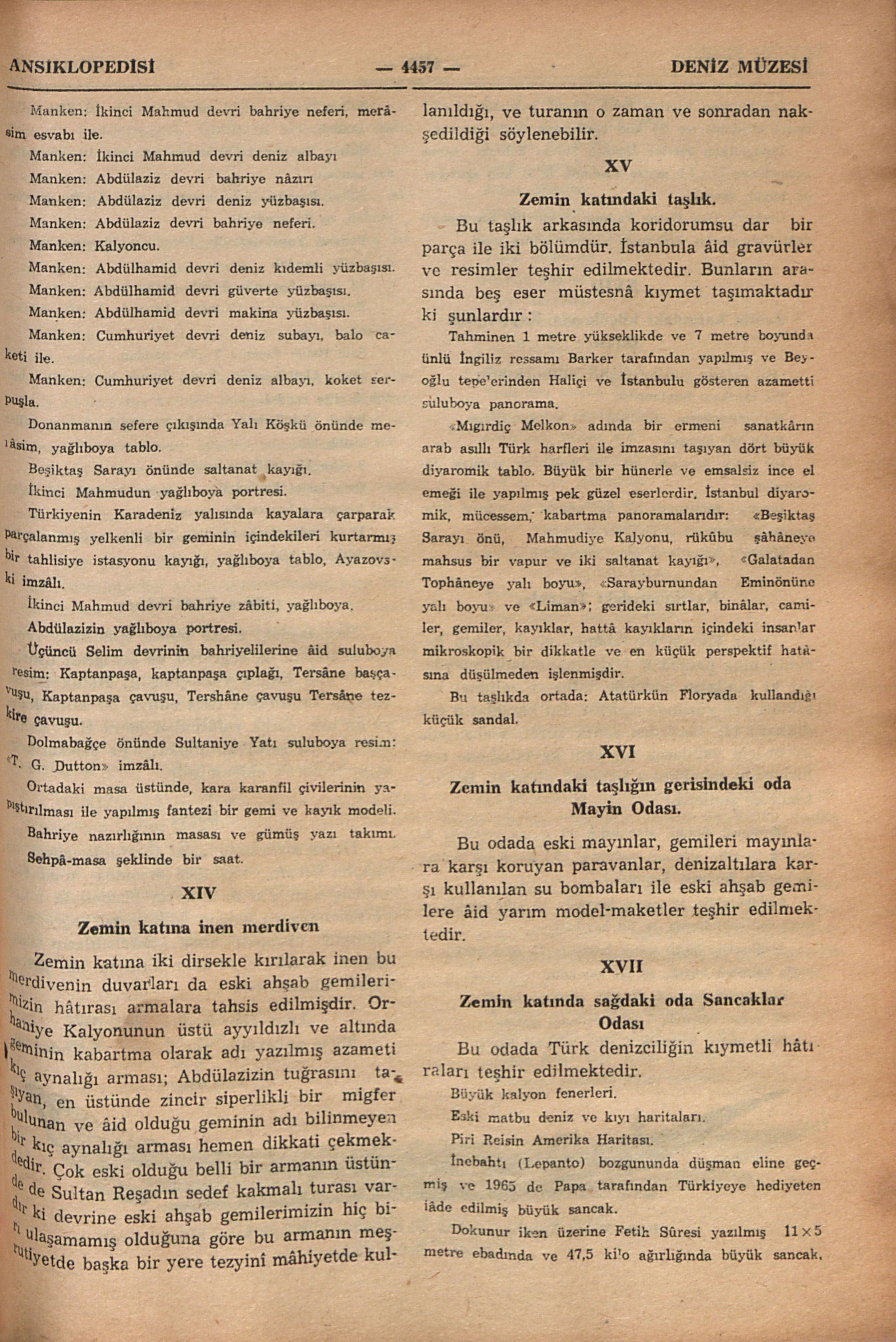 1966 yılı eylülünde Deniz Müzesini İstanbul Ansiklopedisi adına ziyâretimizde bize rehberlik eden, geniş ölçüde bilgi veren müzenin arşiv uzmanlarından emekli deniz albayı Sayın Râmi Abrak ile müzenin müdür muâvini deniz yarbayı sayın Kâzım Erbilin isimlerini buraya şükran ile kaydediyoruz.