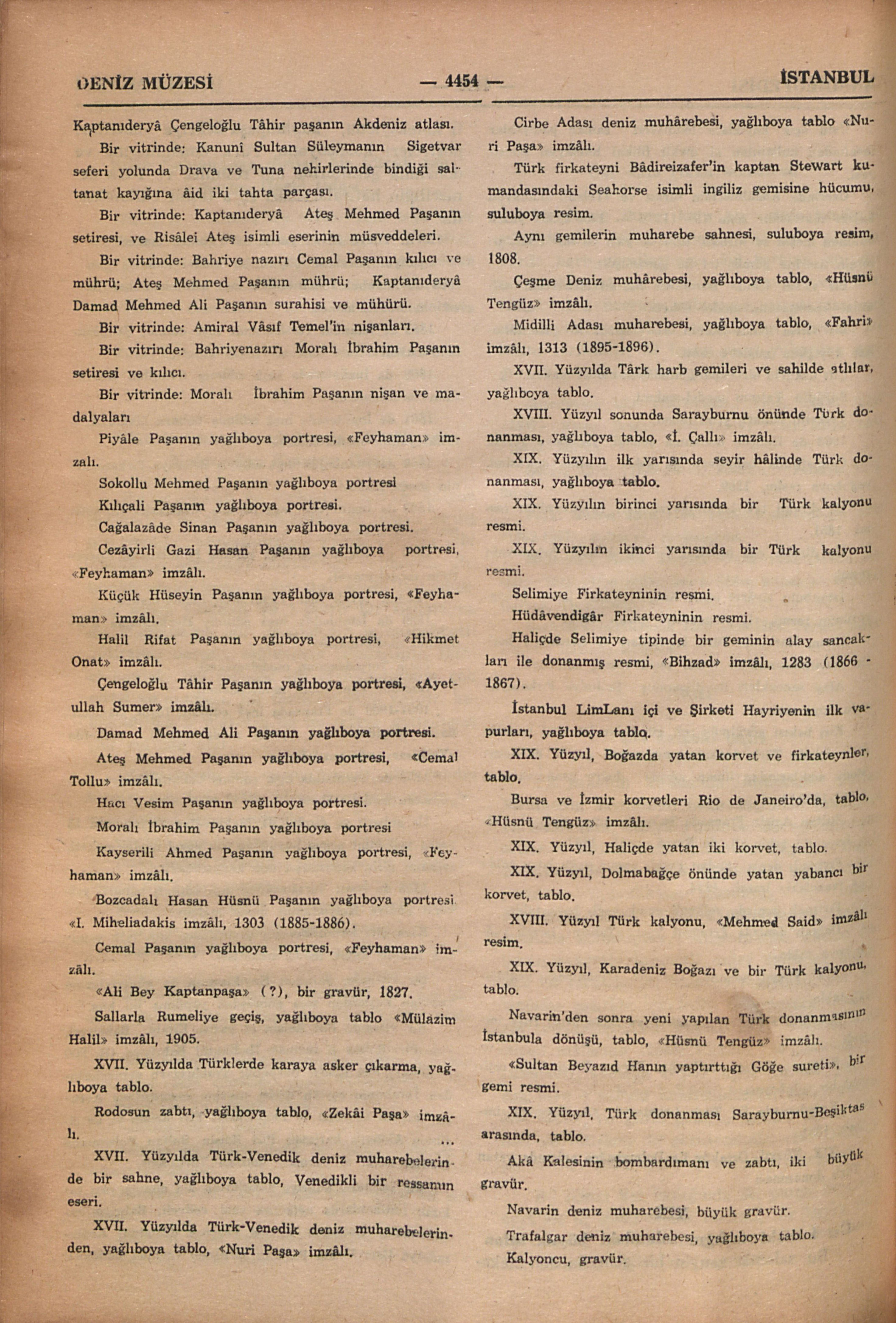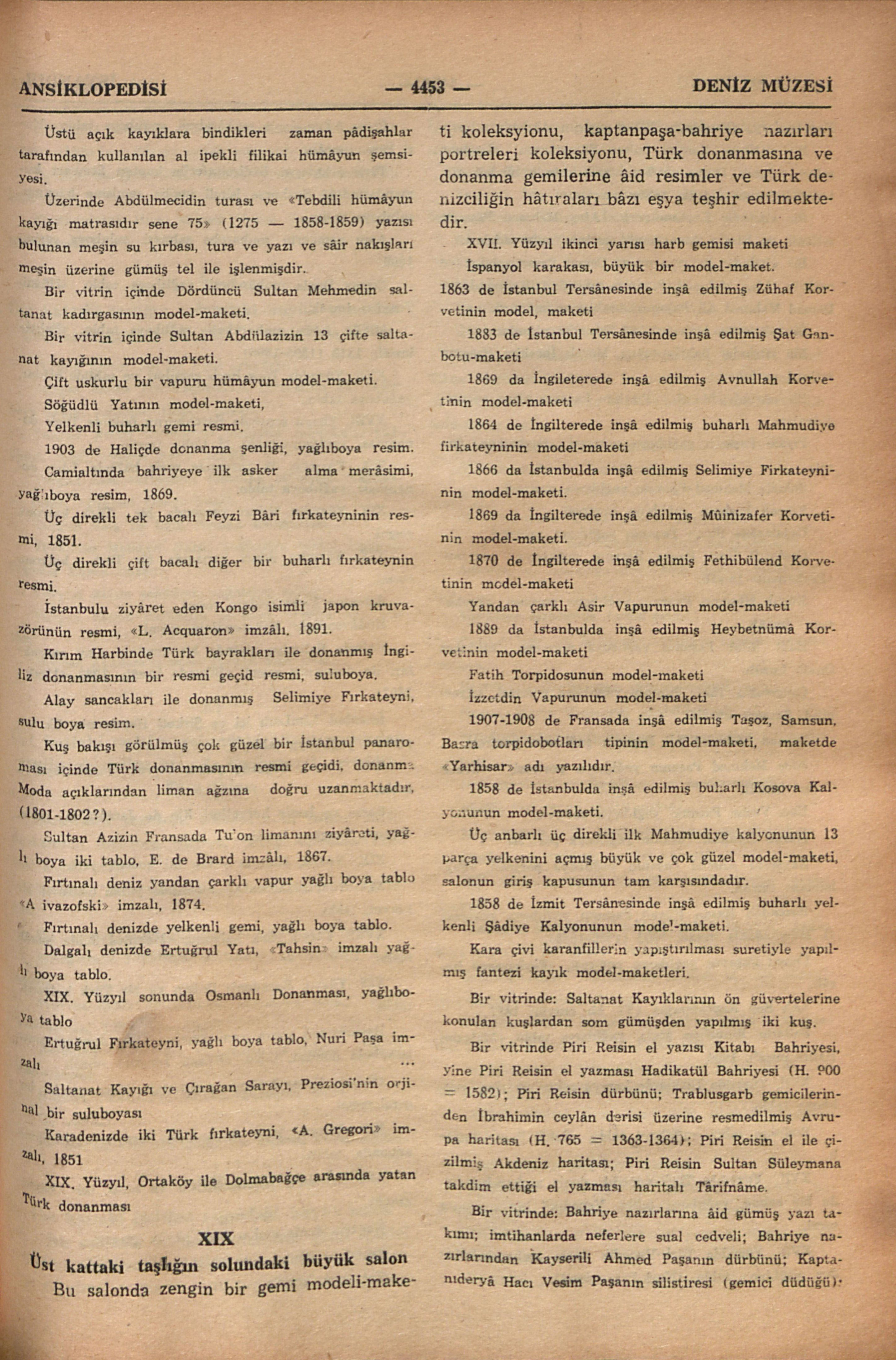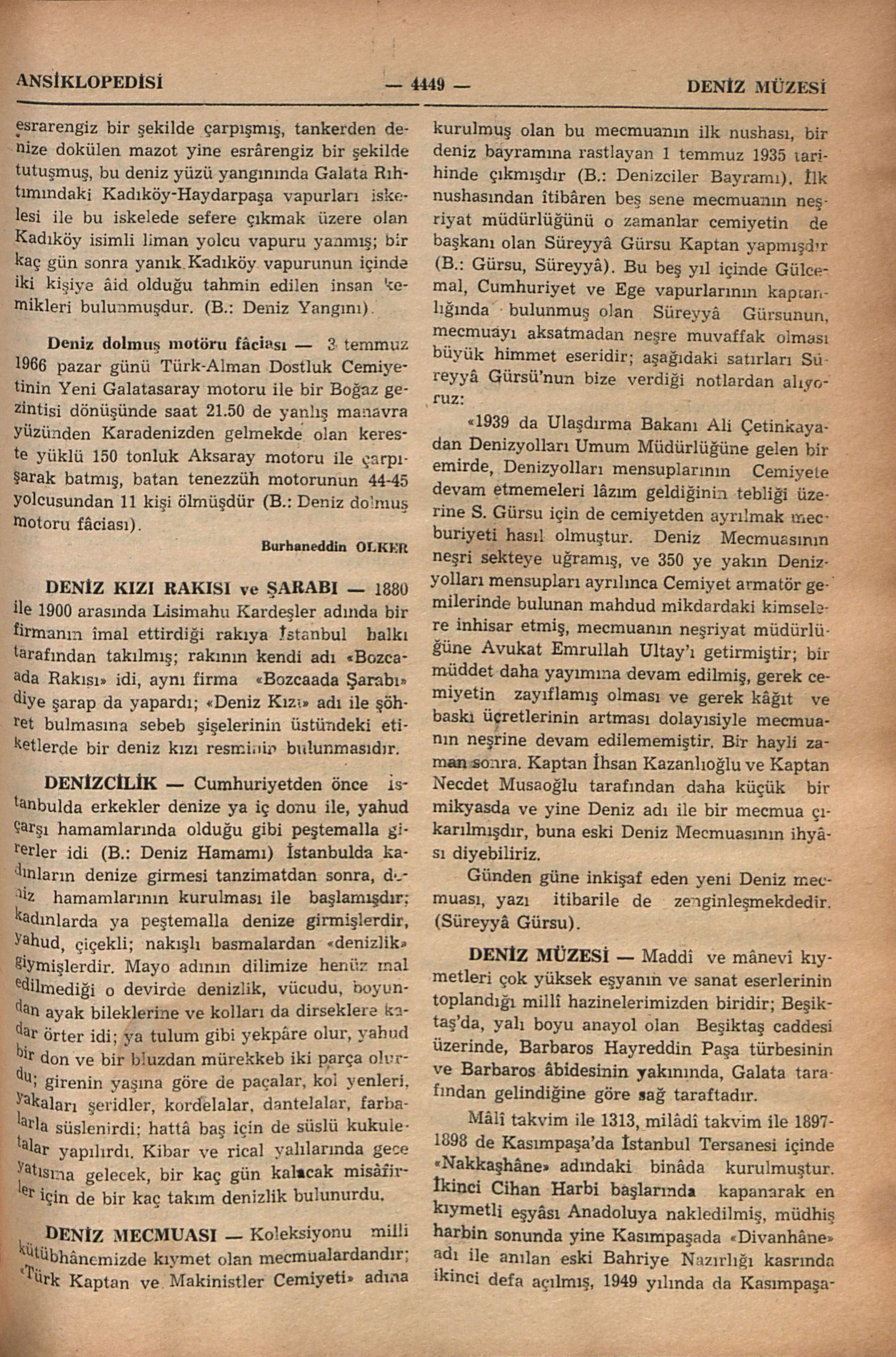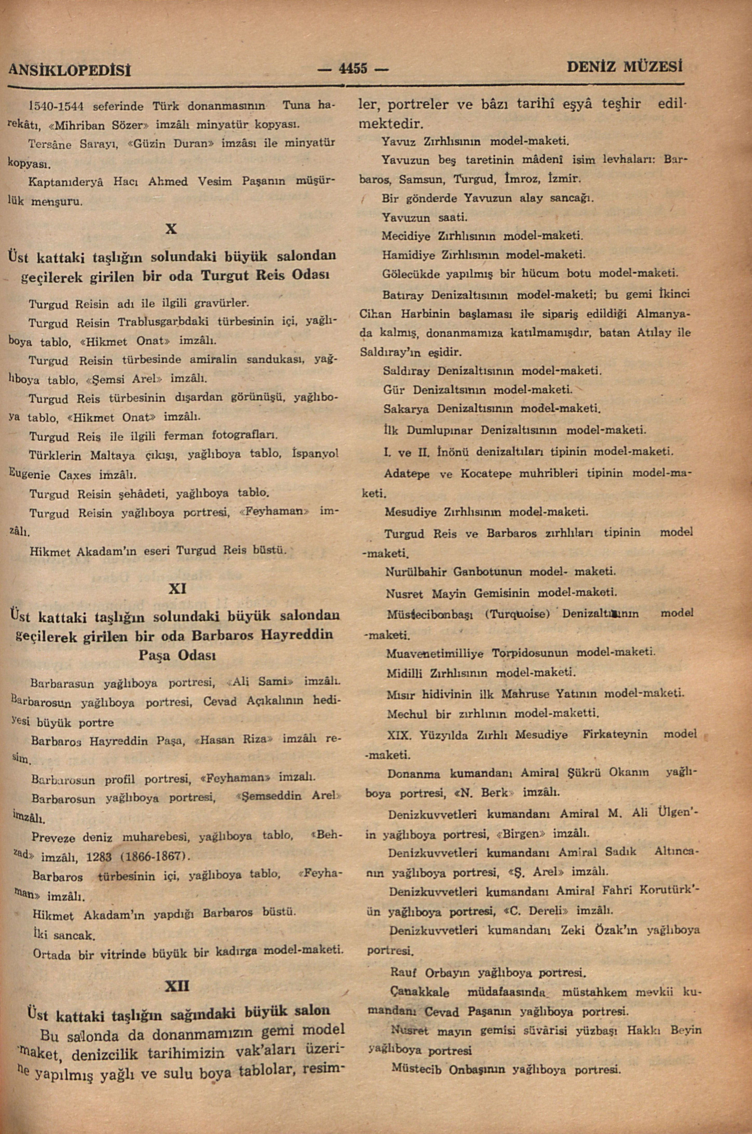 1966 yılı eylülünde Deniz Müzesini İstanbul Ansiklopedisi adına ziyâretimizde bize rehberlik eden, geniş ölçüde bilgi veren müzenin arşiv uzmanlarından emekli deniz albayı Sayın Râmi Abrak ile müzenin müdür muâvini deniz yarbayı sayın Kâzım Erbilin isimlerini buraya şükran ile kaydediyoruz.