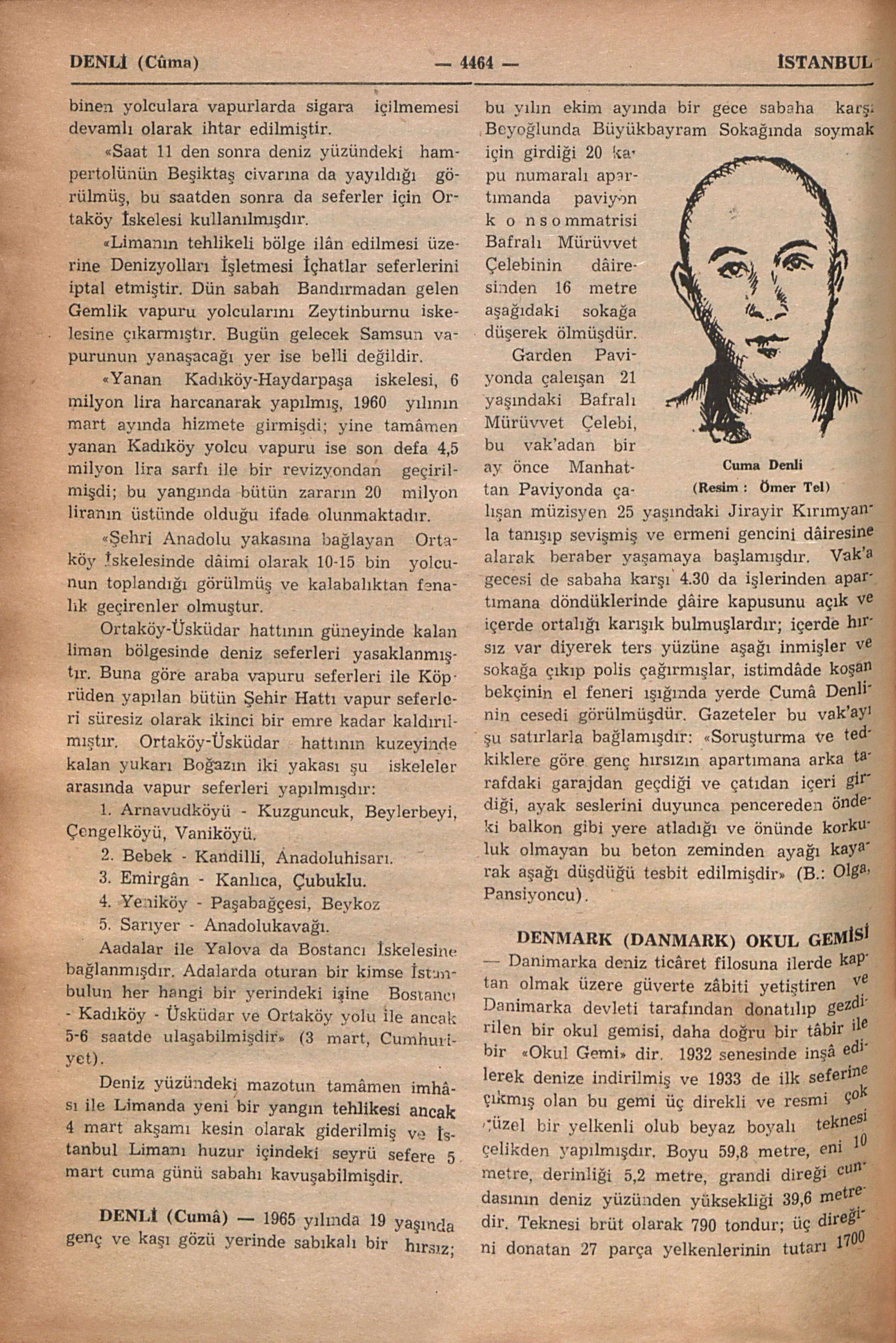 Kopenhag (danimarka dilinde Köbenhavn) Limana bağlı olan Denmark her sene altıay süre ile sefere çıkar ve üç sene içinde öğrenci tayfalarına yedi deniz göstermiş olur. 18 zâbit de aynı zamanda çeşidli bilgi kollarında ıhtisas sâhibi öğretmenlerdir. Altı aylık sefer zamanında gemici çocuklar “Gemicilik”, “Uluslar arası gemicilik nizamları”, “Matematik”, “Fizik”, “Gemici Sağlık Bilgisi”, “Makinistlik”, “Radyo Tekniği”, “Telsizcilik”, “Meteoroloji”, “Gemi dengesi”, “Gemi inşâsı”, “Gemi tipleri”, “Rüzgârlar”, “Akıntılar”, “Kanallar” üzerine dersler ve konferanslarla ve gezi görgüsü ile bilgi edinirler. Baltık Denizi, Atlantik Okyanusunun bütün kıyıları, adaları, Akdeniz dolaşılır. 1963 yılından îtibâren de bu gezi programına İstanbul ziyâreti konmuşdur, öyle ki Denmark üç senede bir 12 ekim sabahı İstanbul limanına girer ve büyük şehrimizde dört gün kalarak beşinci günün sabahı hareket eder. Bu güzel okul-geminin İstanbula ilk gelişi 12 ekim 1963 perşembe günü, ikinci gelişi de 12 ekim 1966 salı günü olmuşdur. İkinci gelişinde Denmark Kaptan Wilhelm Hansen’in kumandasında idi.
