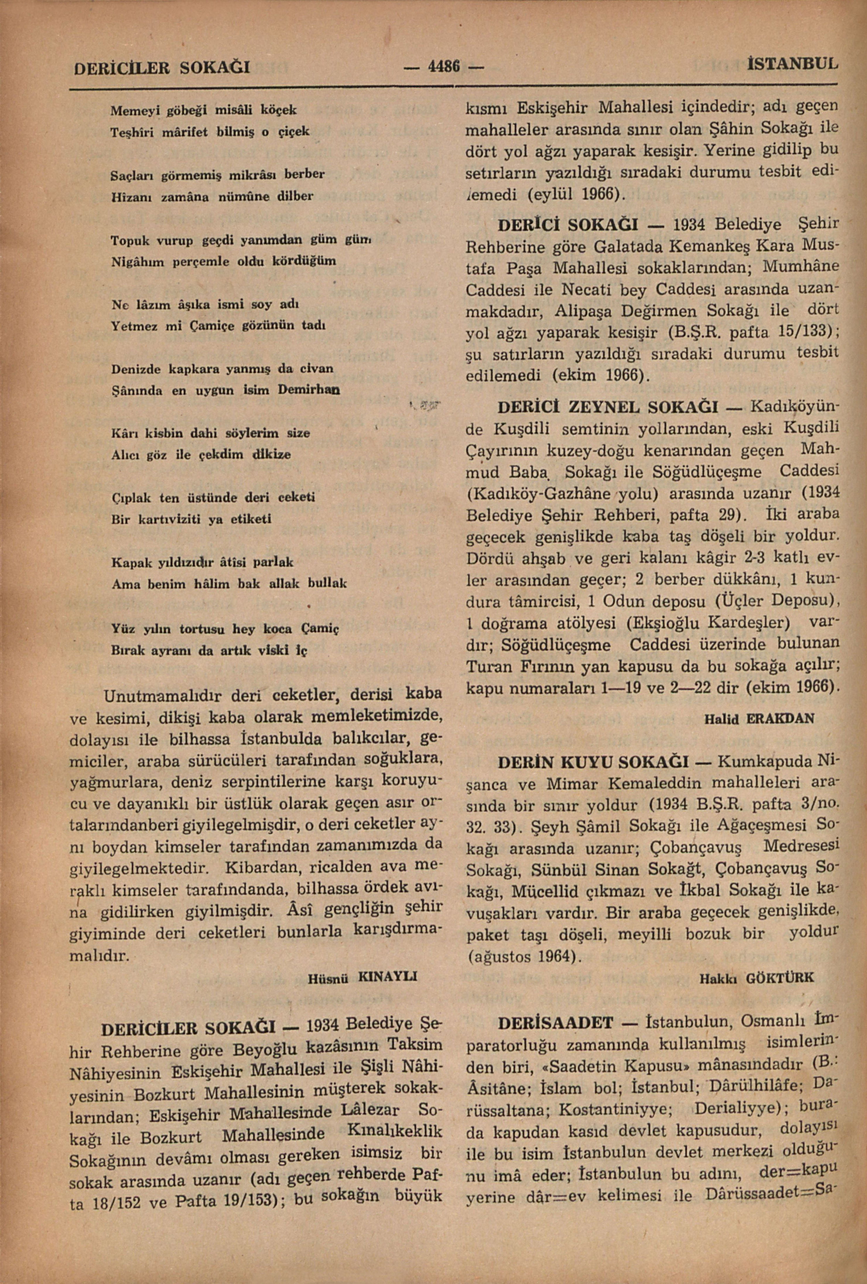 1934 Belediye Şehir Rehberine göre Beyoğlu kazâsının Taksim Nâhiyesinin Eskişehir Mahallesi ile Şişli Nâhiyesinin Bozkurt Mahallesinin müşterek sokaklarından; Eskişehir Mahallesinde Lâlezar Sokağı ile Bozkurt Mahallesinde Kınalıkeklik Sokağının devâmı olması gereken isimsiz bir sokak arasında uzanır (adı geçen rehberde Pafta 18/152 ve Pafta 19/153); bu sokağın büyük kısmı Eskişehir Mahallesi içindedir; adı geçen mahalleler arasında sınır olan Şâhin Sokağı ile dört yol ağzı yaparak kesişir. Yerine gidilip bu satırların yazıldığı sıradaki durumu tesbit edilemedi (eylül 1966).