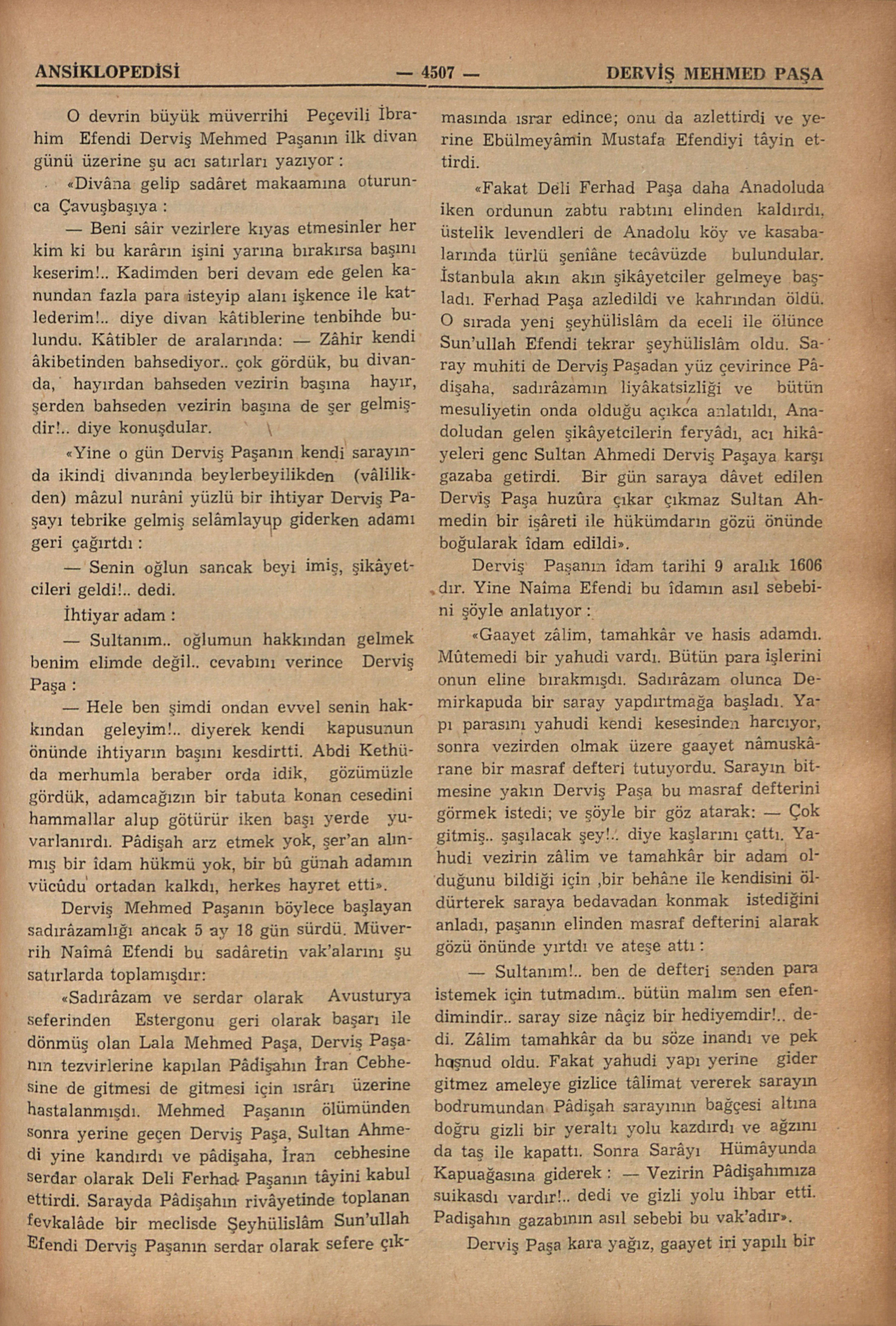 “Gaayet zâlim, tamahkâr ve hasis adamdı. Mûtemedi bir yahudi vardı. Bütün para işlerini onun eline bırakmışdı. Sadırâzam olunca Demirkapuda bir saray yapdırtmağa başladı. Yapı parasını yahudi kendi kesesinden harcıyor, sonra vezirden olmak üzere gaayet nâmuskârane bir masraf defteri tutuyordu. Sarayın bitmesine yakın Derviş Paşa bu masraf defterini görmek istedi; ve şöyle bir göz atarak: — Çok gitmiş.. şaşılacak şey!.. diye kaşlarını çattı. Yahudi vezirin zâlim ve tamahkâr bir adam olduğunu bildiği için ,bir bahane ile kendisini öldürterek saraya bedavadan konmak istediğini anladı, paşanın elinden masraf defterini alarak gözü önünde yırtdı ve ateşe attı :