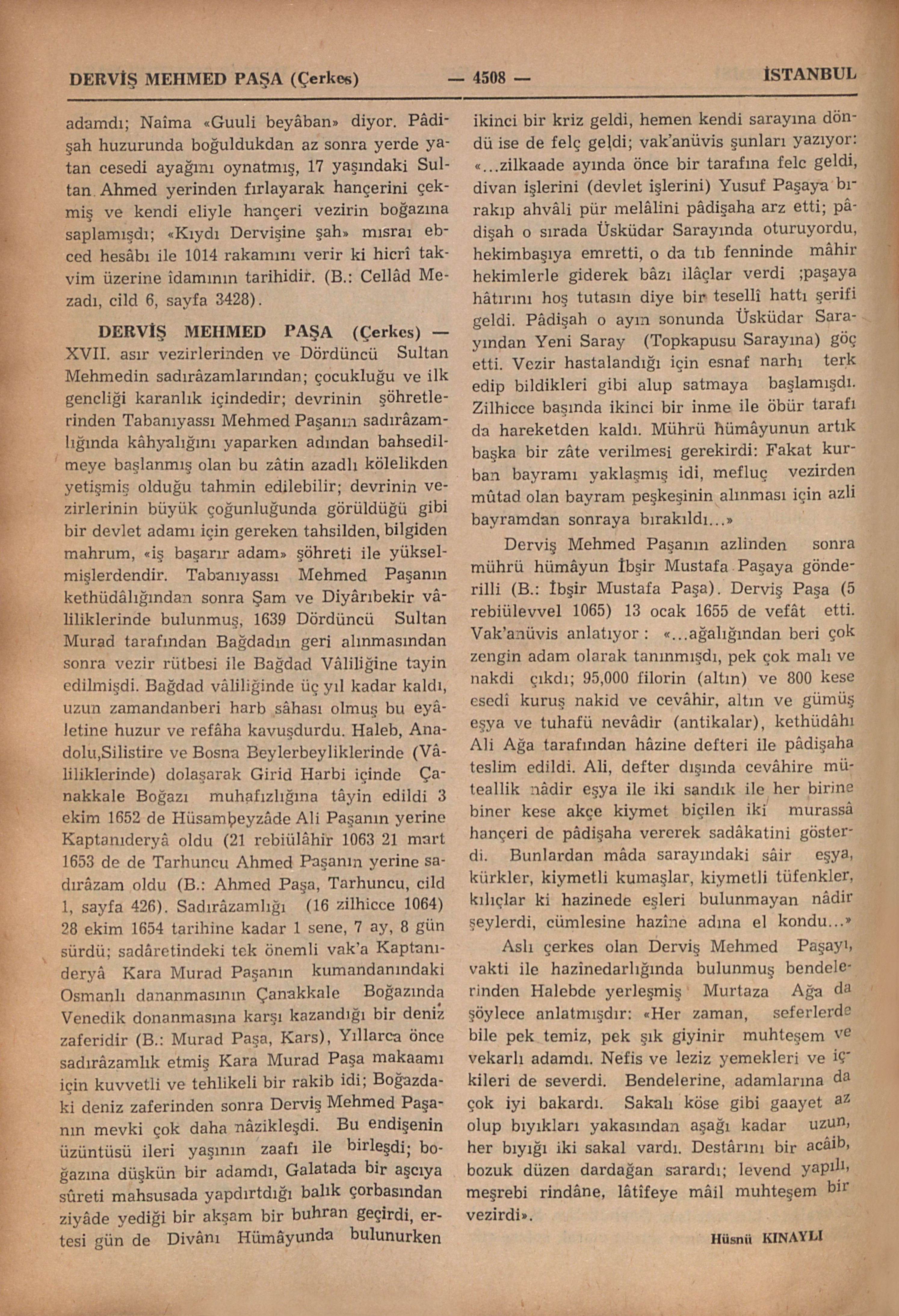 XVII. yüzyıl başında yaşamış vezirlerden, Birinci Sultan Ahmedin sadrazamlarından; câhil, haris, hasis, zâlim, ve kanlı bir adam olup Sarayın Bostancı ocaklarından Hamlacılar (Kayıkcılar) Ocağından yetişmişdir. Aslının nereli olduğu bilinmiyor; bir boşnak olduğunu söyleyenler var ise de biz bir yalı uşağı olduğunu tahmin ediyoruz; gençliği saray kayıklarında denize kürek çalmakla geçmiş ve zaman ile Bostancıbaşılığa kadar yükselmişdir; sarayın muhâfız kıt’aları kumandanlığı diyebileceğimiz bu mühim mevkîde bulunur iken (B.: Bostancılar; Bostancıbaşı) Birinci Sultan Ahmedin tahta çıkdığının tezine (cülûsu 1603; B.: Ahmed I) 18 ocak 1606 da Kayapaşazâde Kubad Mustafa Paşanın yerine kaptanpaşa olmuş; batıda Avusturya ile ve doğuda İran ile müzminleşmiş iki harbin son derece nâzik yıllarında Osmanlı Donanması, vezirlik pâyesi ile “Paşa” unvanını da almış olan eski saray kayıkcının eline teslim edilmişdir. Fakat Derviş Mehmed Paşa kaptanıderya olur olmaz gözlerini sâdırâzamlık makaamına dikmişdir. O tarihde henüz 17 yaşında toy bir genc olan Sultan Ahmede avamfirîbâne merdlik mümâyişleri ile hulûl etmiş ve devrin seçkin ve aydın vezirlerinden sadırâzam Lala Mehmed Paşayı azlettirmeye çalışmışdır (B.: Mehmed Paşa, Lala). Devletine ve pâdişahına yapdığı hizmetlerin takdir edilmediğini g...