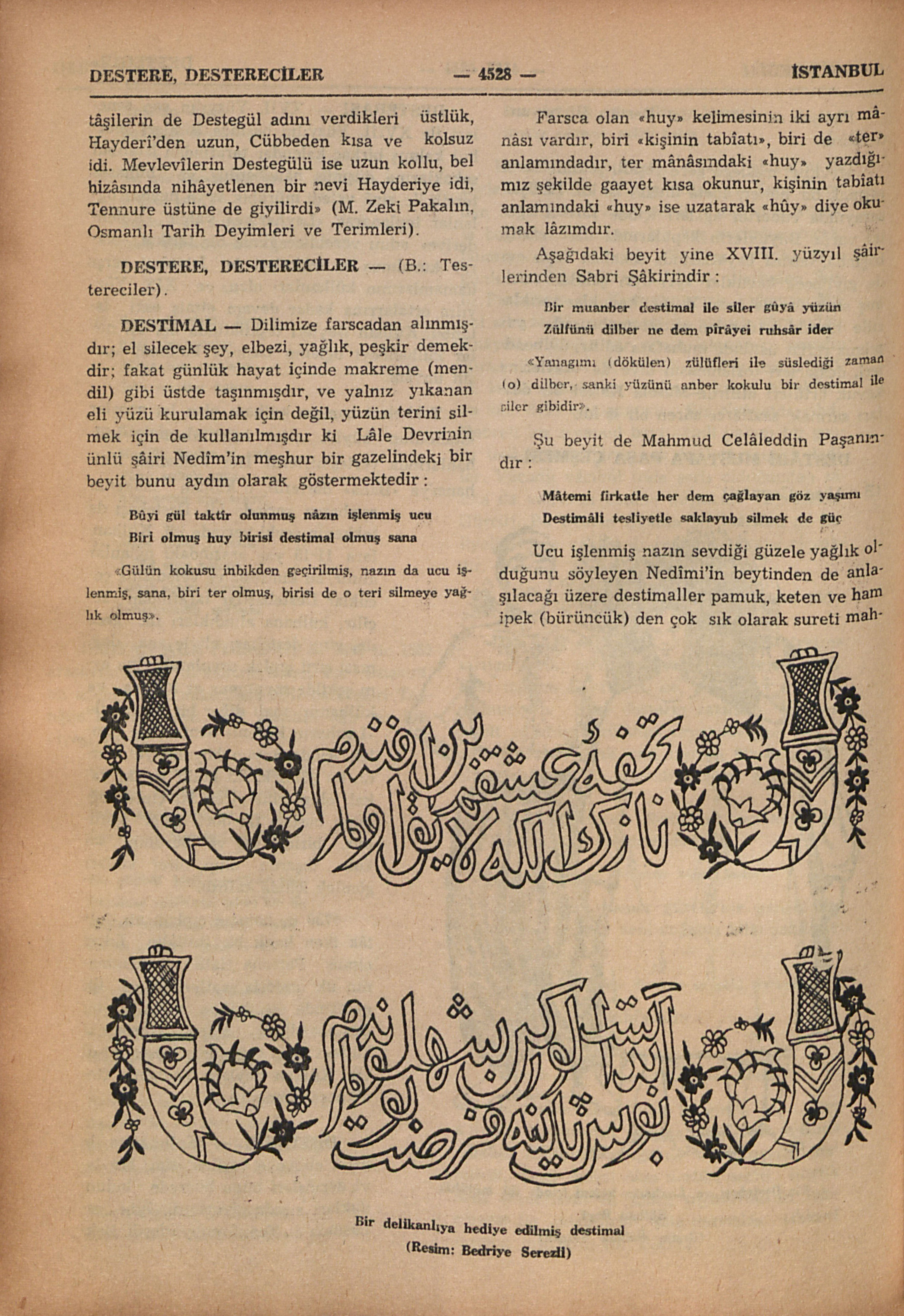 “Kollu salta ile uzun cübbeye verilen isim; Mevlevî dervişleri bunu hücrede bulundukları sırada giyerlerdi, âyin esnâsında da Tennûre giyerlerdi. Bektâşilerin de Destegül adını verdikleri üstlük, Hayderî’den uzun, Cübbeden kısa ve kolsuz idi. Mevlevîlerin Destegülü ise uzun kollu, bel hizâsında nihâyetlenen bir nevi Hayderiye idi, Tennure üstüne de giyilirdi” (M. Zeki Pakalın, Osmanlı Tarih Deyimleri ve Terimleri).